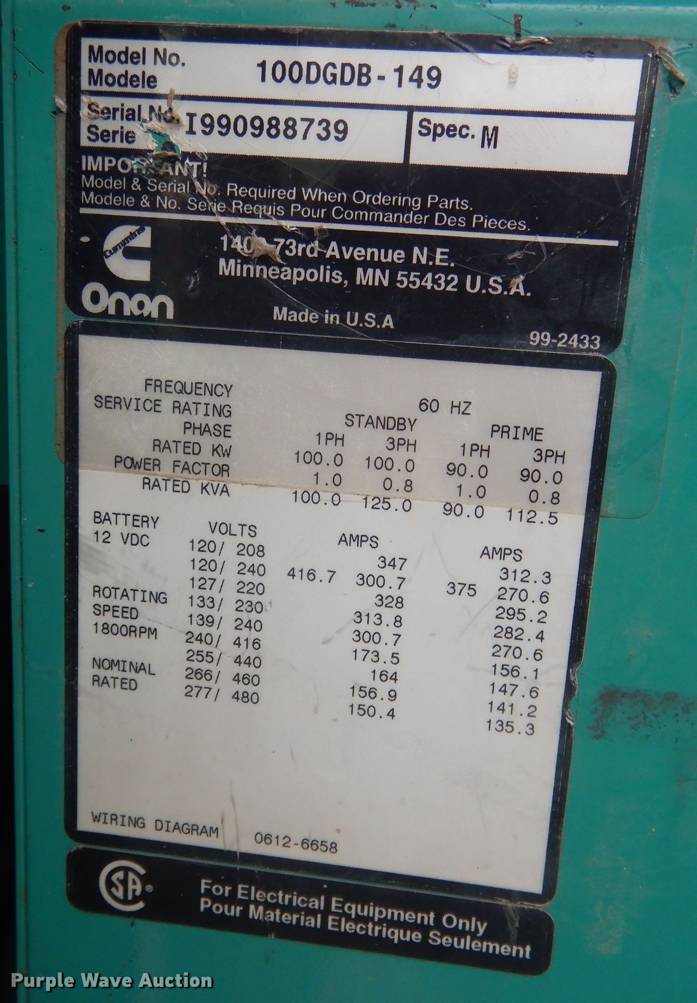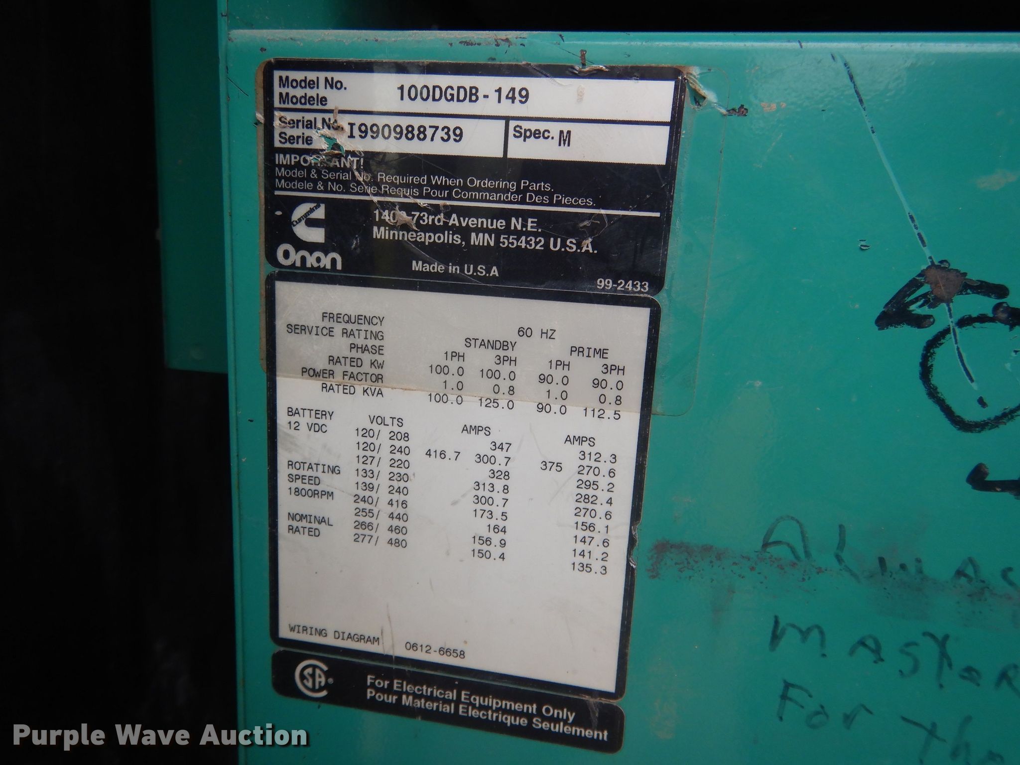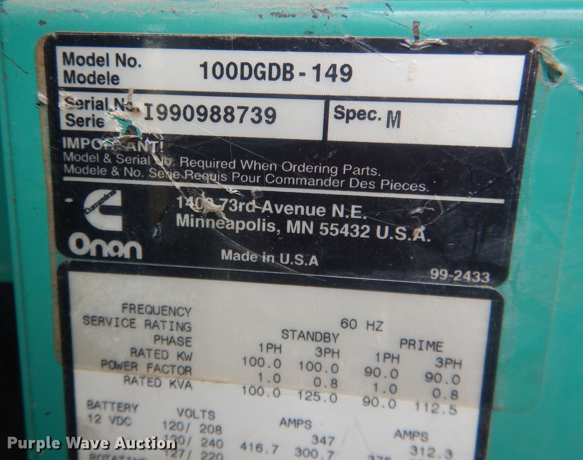 Purple Wave is selling a used Generator Set in Nebraska. This item is a Onan 100DGDB generator with the following: Hours: 129 on meter, Hours: Unknown, VIN: I9909888739