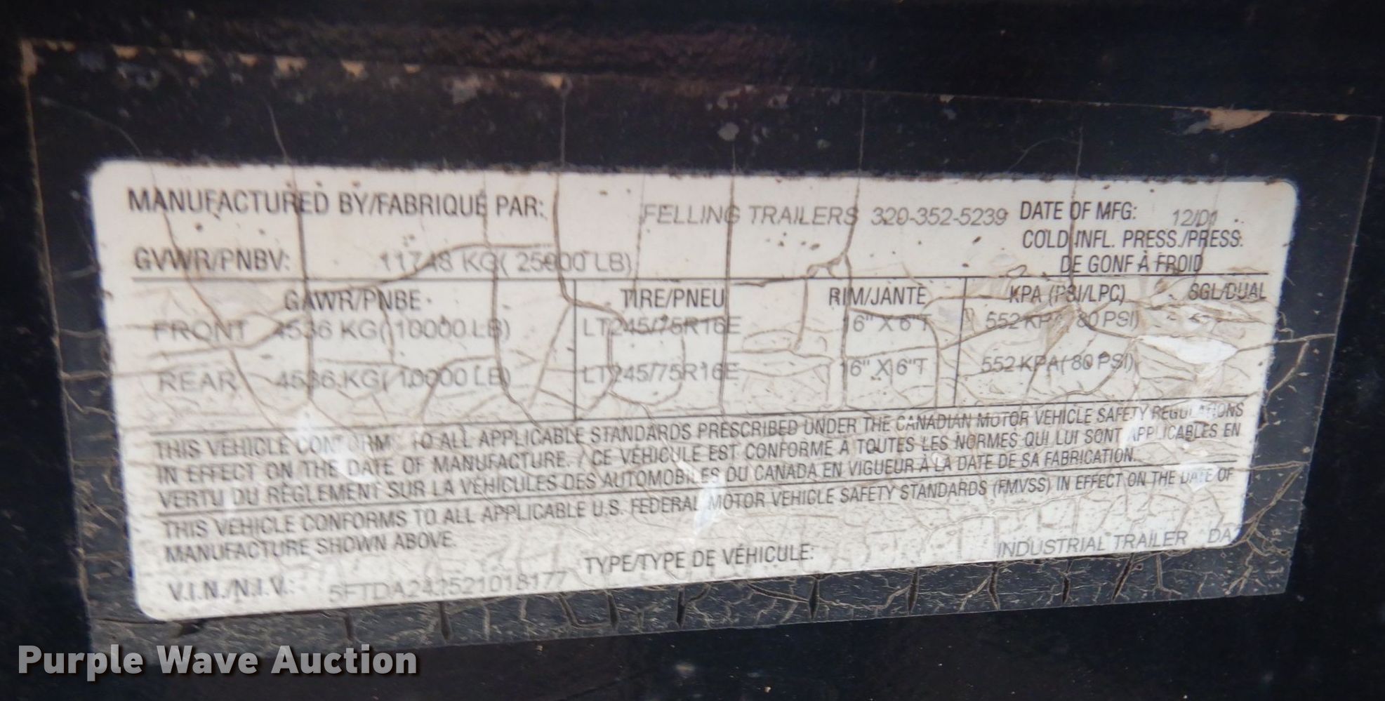 2002 Felling FT20 equipment trailer. VIN: 5FTDA242521018177. Dimensions Overall: 24' 1" L x 8' W x 5" W, Deck: 19' L x 8' W x 5" W, Deck height: 3', Tail length: 5' 4", Ramps: Manual Length: 4' 7". Features Deck type: Wood. Chassis Hitch: Pintle, Landing gear: Single, Suspension: Spring, Brakes: Air, Axles: Tandem, GVWR: 25,900 lbs. Tires Steel wheels, Size: 245/75R16. Minnesota title. Seller is a Minnesota licensed motor vehicle dealer. The buyer may be required to pay sales tax and/or registration fees to the dealer prior to taking possession. Title will be assigned and distributed by the dealer. Please contact the seller for distribution questions. Lano Equipment, Inc.. 3021 133rd St W. Shakopee, MN 55379