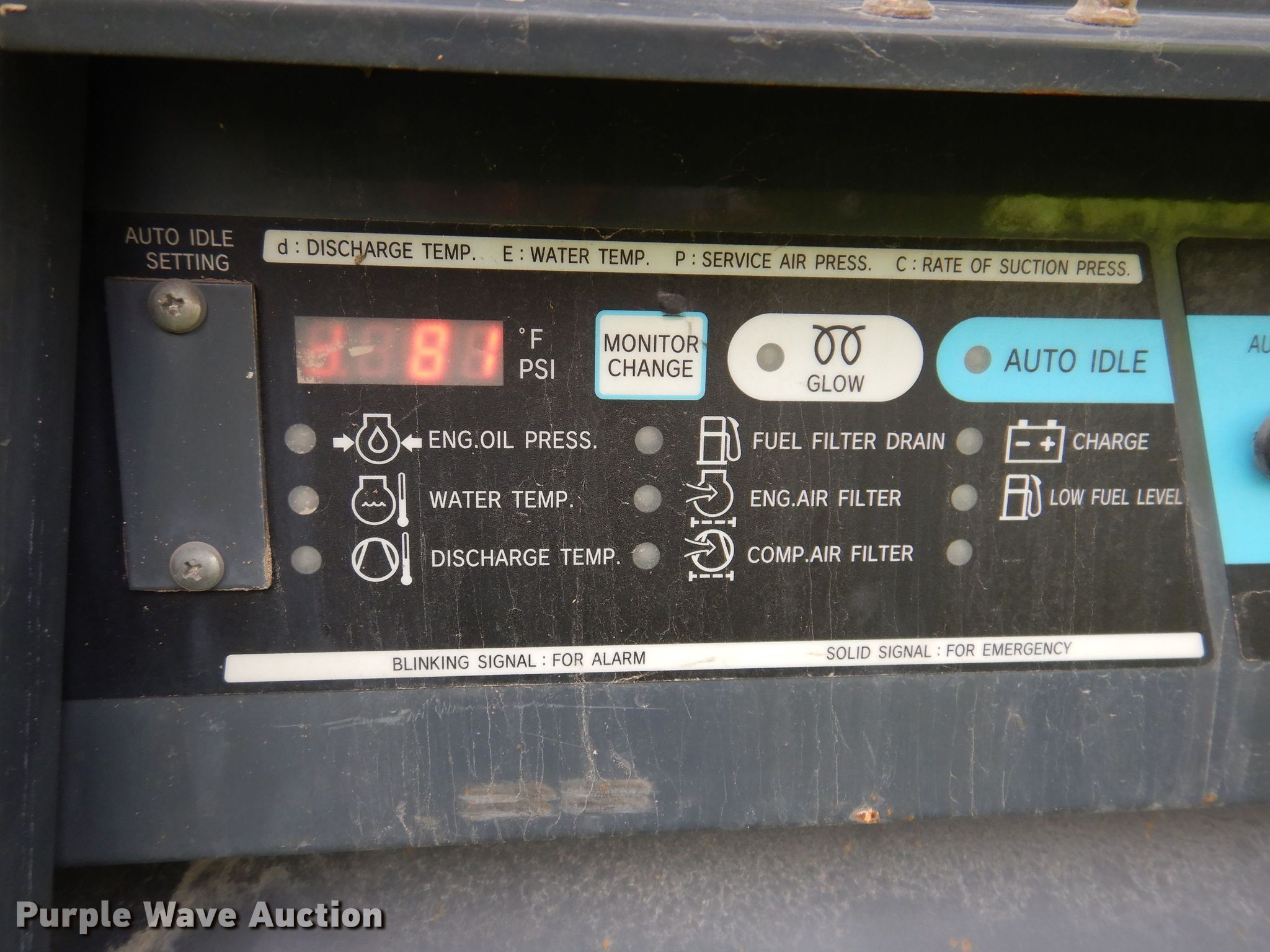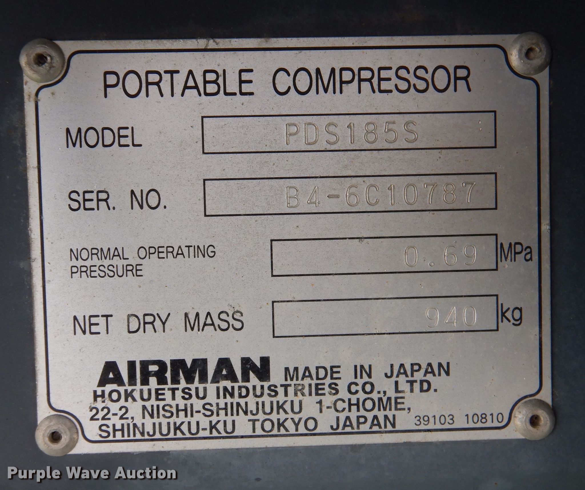 Purple Wave is selling a used Air Compressor in Iowa. This item is a Airman PDS185S air compressor with the following: Hours: 1,103 on meter, Serial: B4-6C10787
