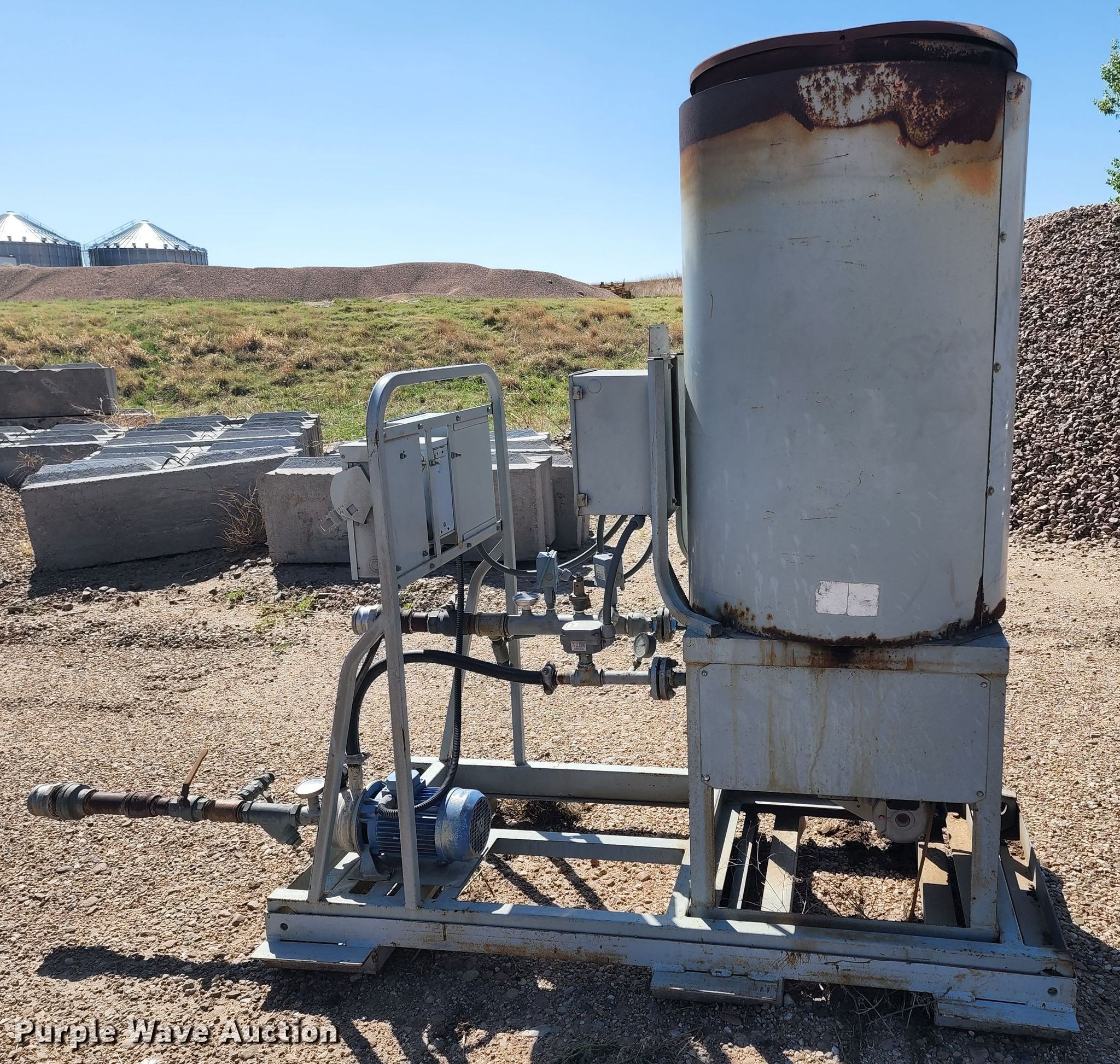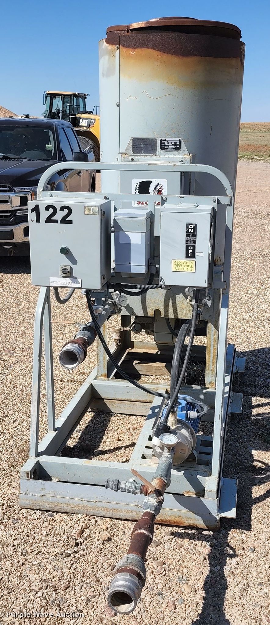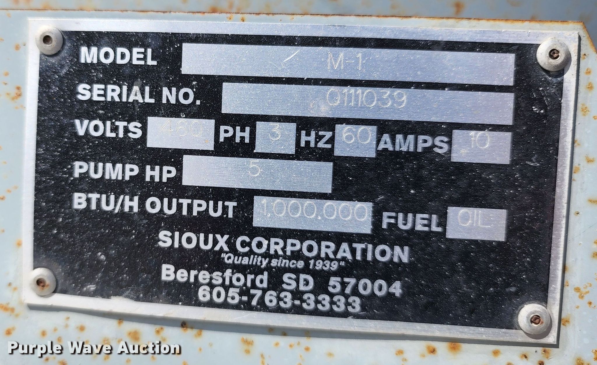 Sioux M-1 water heater. Serial: 111039. Electric Motor Volts: 460, Phase: Three. Features BTU: 1,000,000, Oil fired burner, Pump HP: 5. Sporer Land Development, Inc.. 431 US 83 Hwy. Oakley, KS 67748