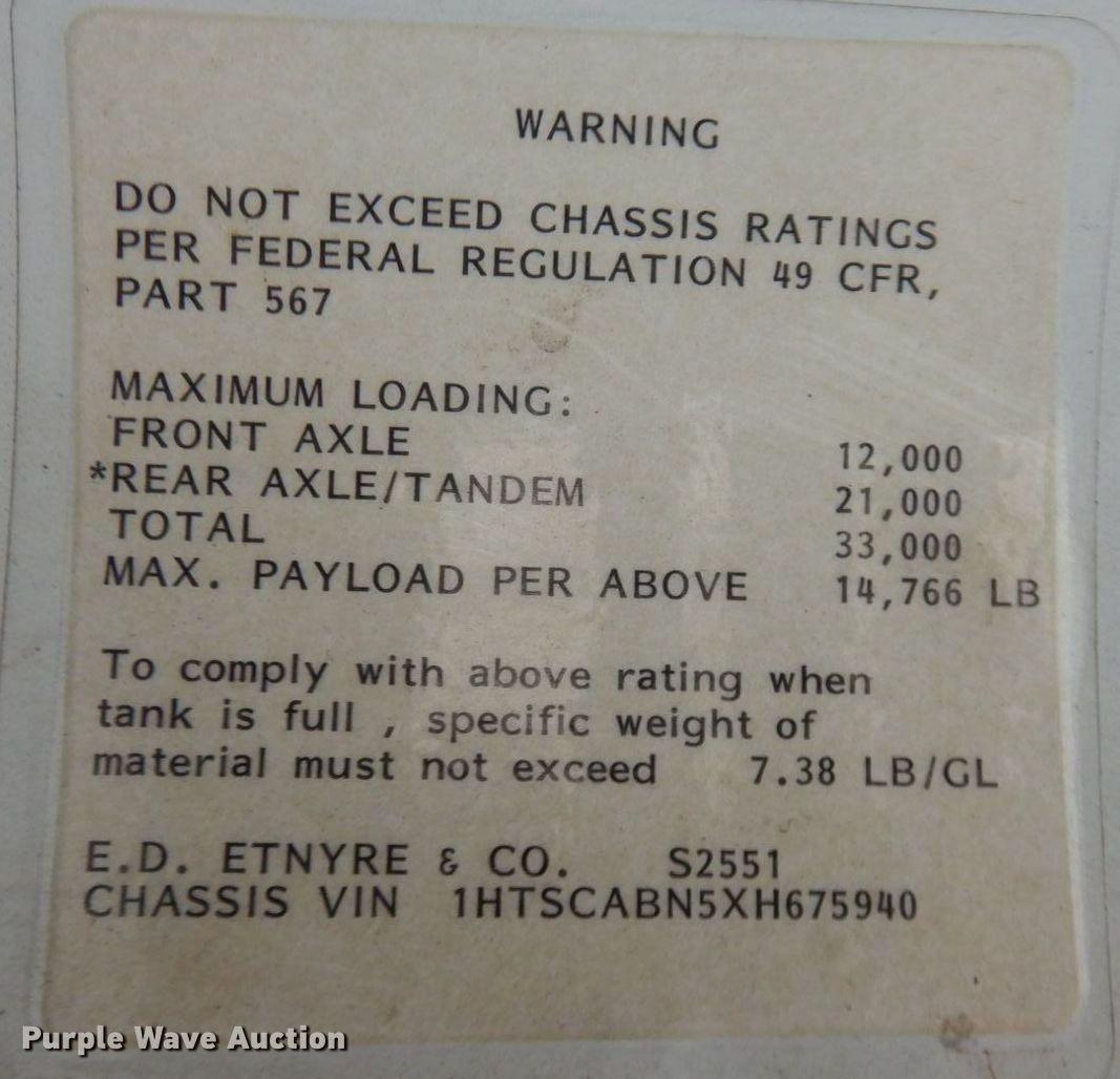 1999 International 4700 oil distributor truck. Miles: 37,349 on odometer, VIN: 1HTSCABN5XH675940. Engine International T444E, Displacement: 7.3L, Cylinders: 8, Fuel type: Diesel. Transmission Spicer, Manual, Speed: 5, plus 2. Chassis Axles: Single, Suspension: Spring, Brakes: Air, PTO. Interior AC, Heat, Cruise control. Features Bed / tank Etnyre Black Topper Cent, Capacity: 2,000 gallons, 11' 7" L x 95" W, Burner: LPG, Spray boom Width: 12', Folding.. Tires Size: 11R22.5. Minnesota title. Title has a lien that will be released following the close of the auction. Title distribution may be delayed up to 30 days from verification of funds. Rochester Asphalt Inc. 2904 County Rd 15 SW. Byron, MN 55920