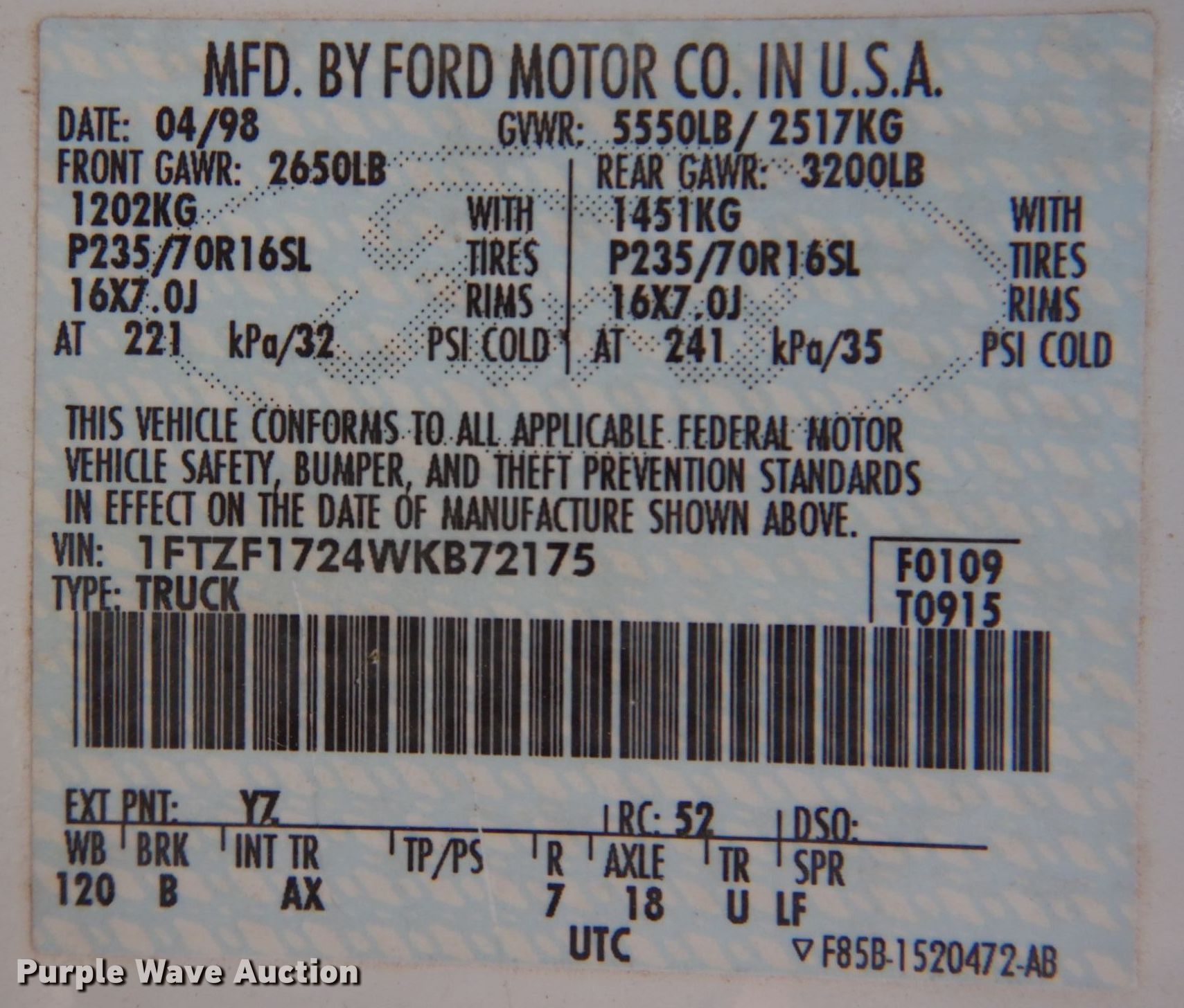 Purple Wave is selling a used 1/2 Ton Pickup or Van in Texas. This item is a 1998 Ford F150 pickup truck with the following: Miles: Unknown, VIN: 1FTZF1724WKB72175