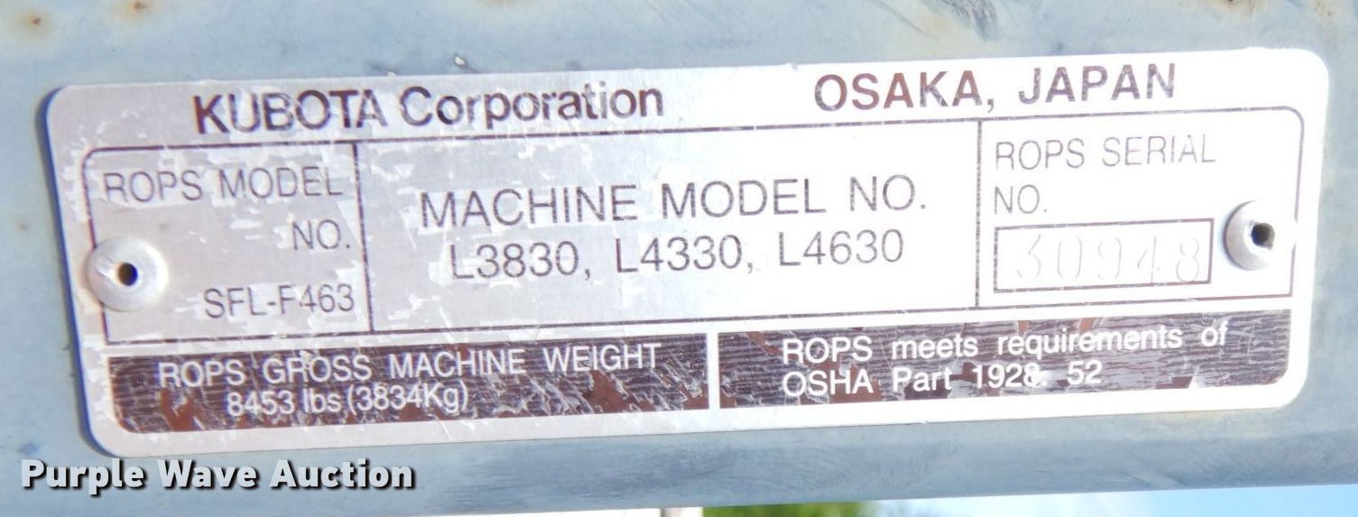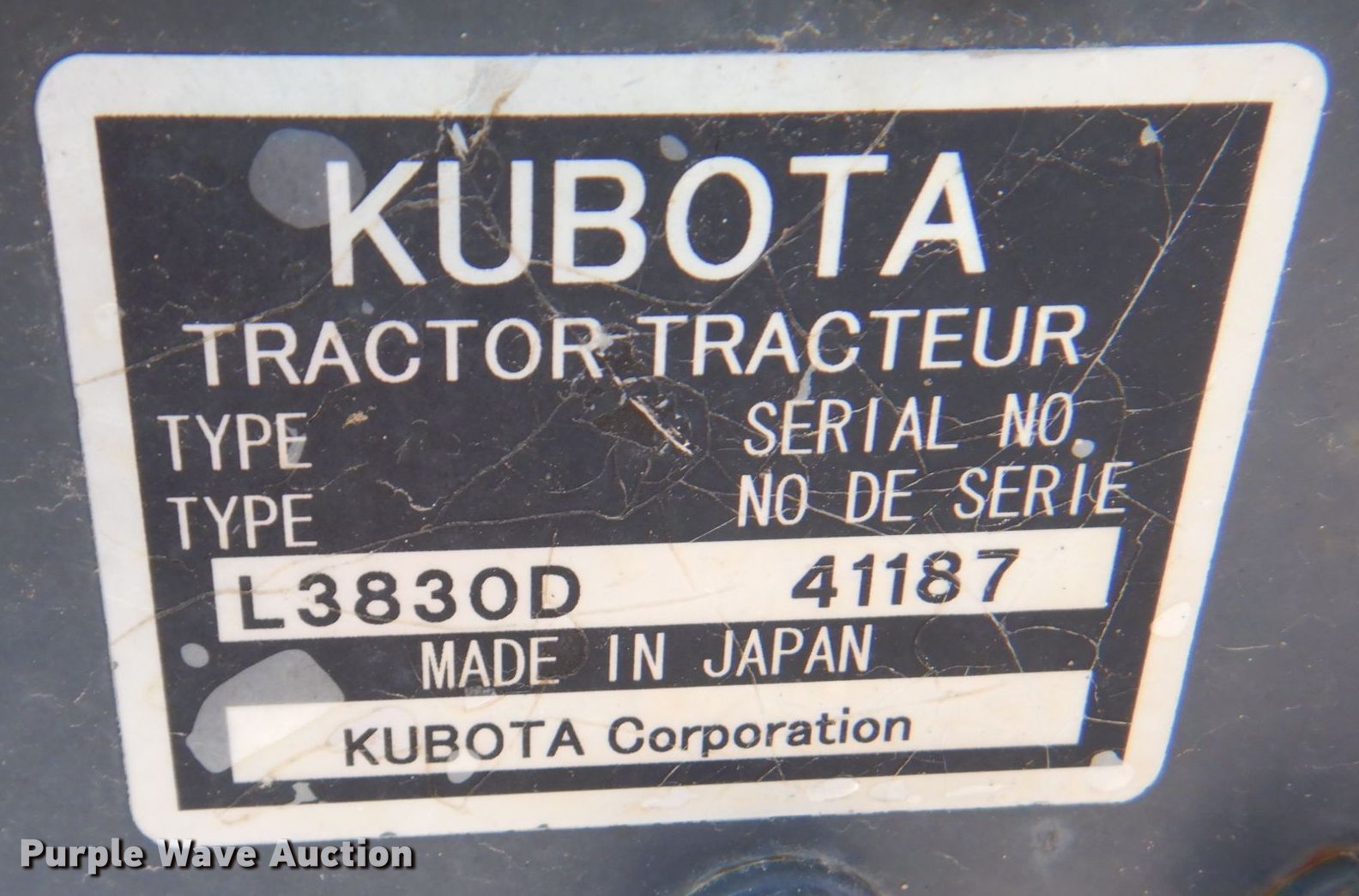 Purple Wave is selling a used Tractor in Kansas. This item is a Kubota L3830D MFWD tractor with the following: Hours: Unknown, Serial: 41187