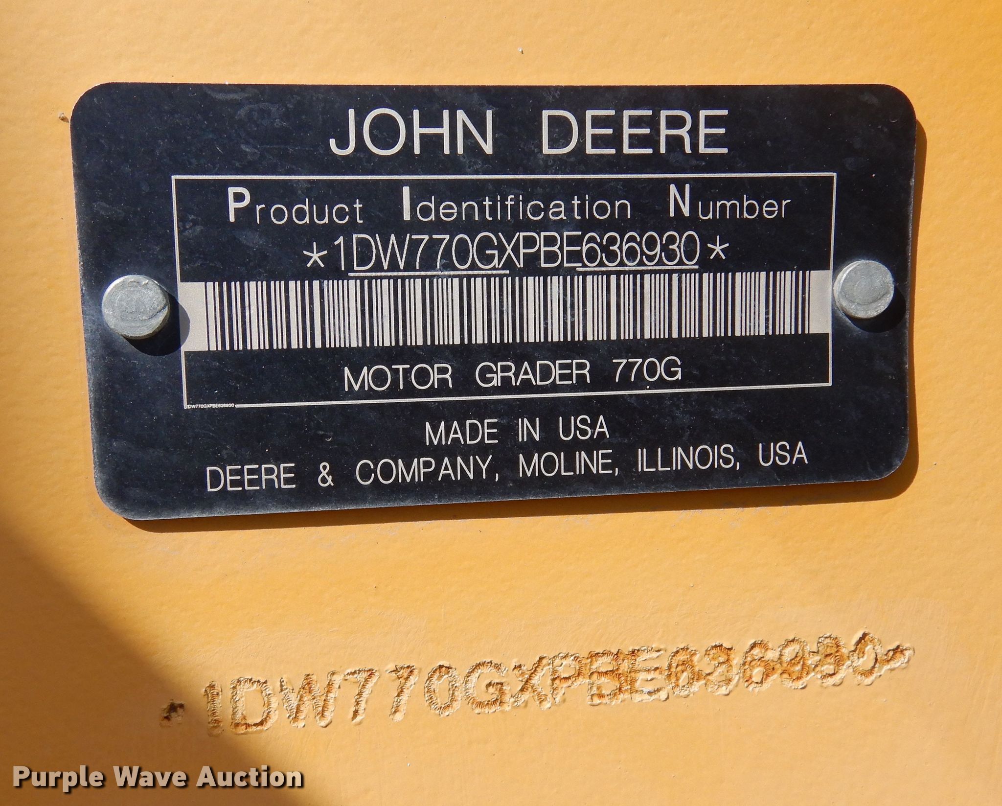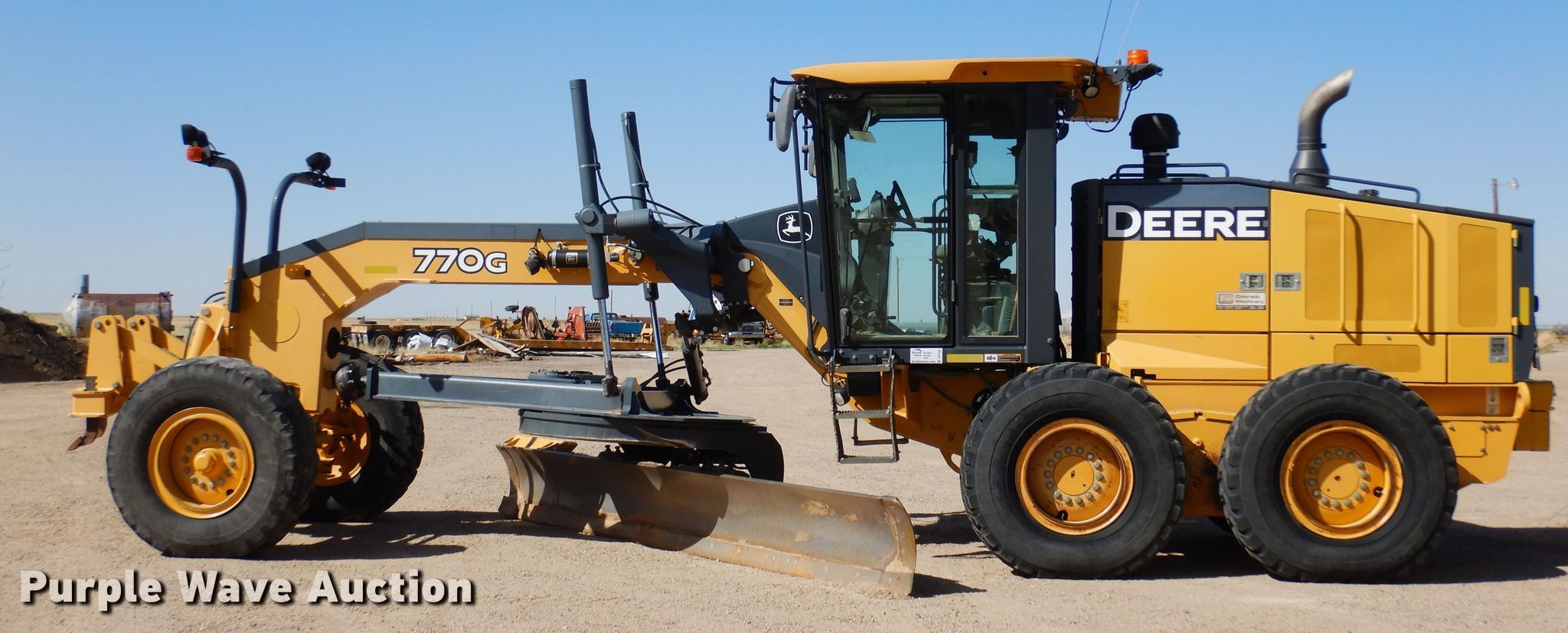 Purple Wave is selling a used Motor Grader in Colorado. This item is a 2011 John Deere 770G motor grader with the following: Hours: 5,249 on meter, Miles: 34,836 on odometer, Serial: 1DW770GXPBE636930