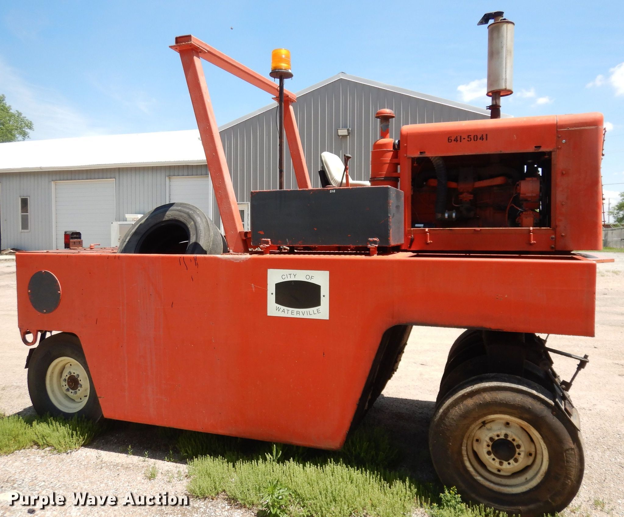 1971 Ingram 92800 pneumatic roller. Hours: Unknown, Serial: 411235P48, Unit #: 6415041. Engine Cylinders: 6, Fuel type: Gas. Transmission Hydrostatic. Operators station Vandal cover. Features Drum scrapers: Front, Rear. Tires Size: 7.50-15, Quantity: 9. Notes Brake fluid leak, Power steering issues, Emergency brake cable broken, (2) additional tires and wheels. City of Waterville. 210 Southeast St. Waterville, KS 66548
