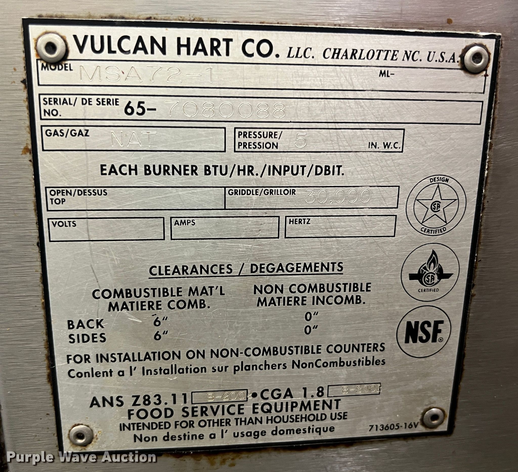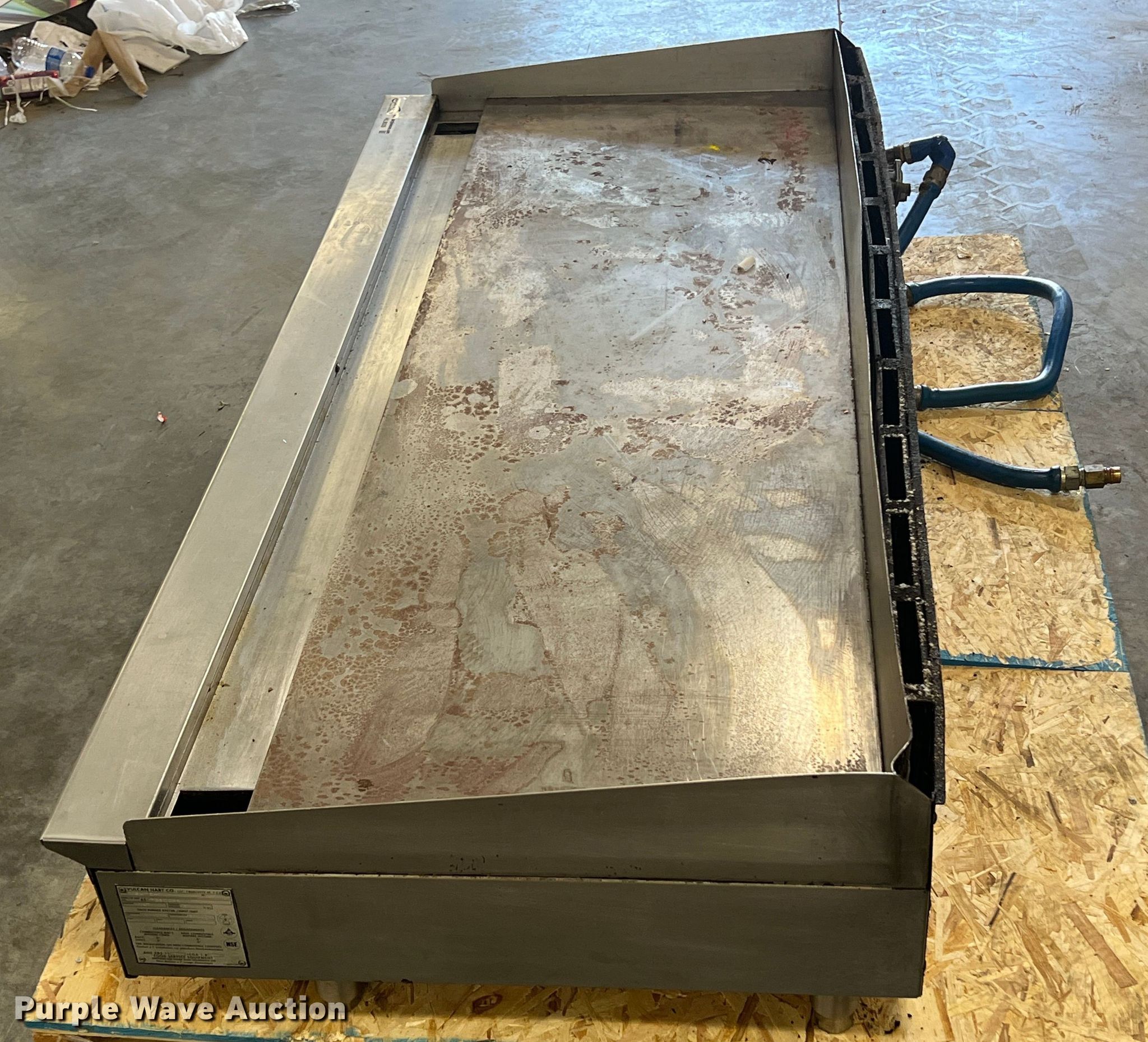 Purple Wave is selling a used Restaurant Equip. in Kansas. This item is a Vulcan Hart MSA72-1 griddle with the following: Cooking surface: 6' x 2', Gas-powered, 30,000 BTU