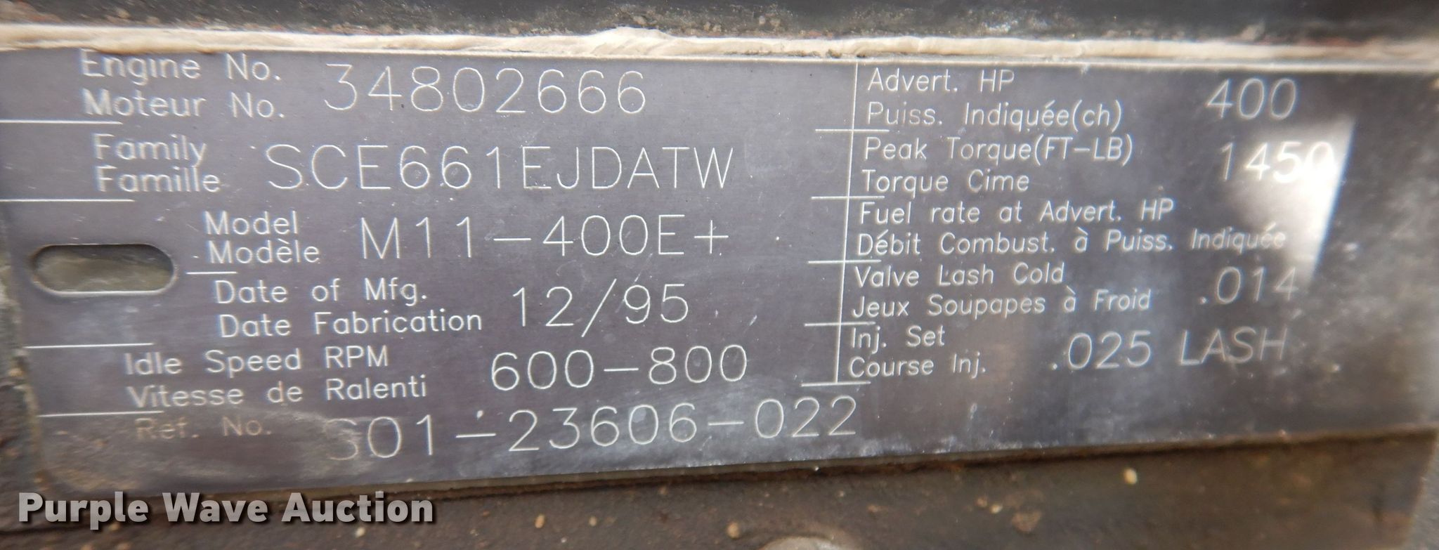 1996 Freightliner FLD112 semi truck. Miles: 450,004 on odometer, VIN: 1FUY6MDB0TH574715. Engine Cummins 400, Serial: 34802666, Displacement: 10.8L, Cylinders: 6, Fuel type: Diesel, HP: 400, Engine brake. Transmission Rockwell, Manual, Speed: 13. Chassis Axles: Tandem, Differential lock: Inter-axle, Suspension: Air Dump valves, Brakes: Air, PTO, Truck chassis: 14' 8", GVWR: 52,000 lbs FAWR: 12,000 lbs, IAWR: 20,000 lbs, RAWR: 20,000 lbs. Interior AC, Heat, Heated mirrors, Cruise control, Air ride cab. Features Deck plate: Steel, Fifth wheel type: Air operated, Sliding, Fuel tank: Dual. Tires Front: 275/80R24.5, Rear: 285/75R24.5. Notes Windshield chipped or cracked. Iowa title. Seller is a government entity who will be assigning and distributing the title. Please contact the seller for distribution questions. Greene County, IA. 701 W Wall St. Jefferson, IA 50129