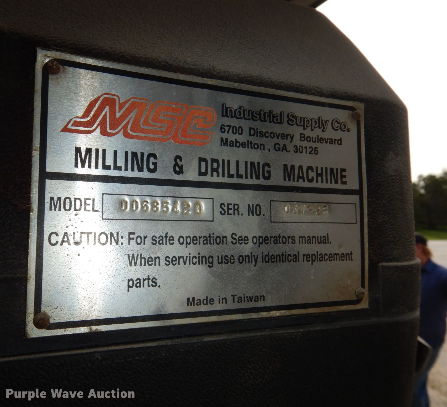 Purple Wave is selling a used Machine Shop Tools and Equip. in Nebraska. This item is a MSC 00685420 mill drill with the following: 44" W x 34" D x 78" H, 2HP, 115/230V, 16/8 amps, Single phase, Serial: 037228