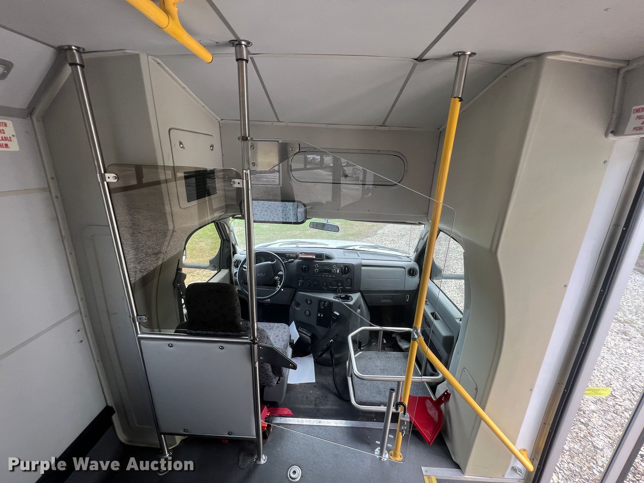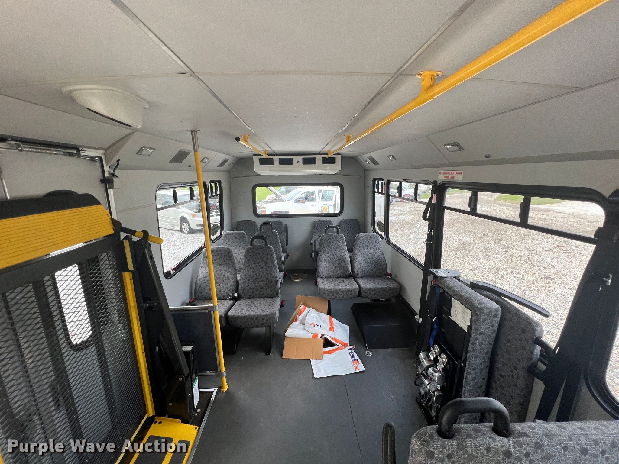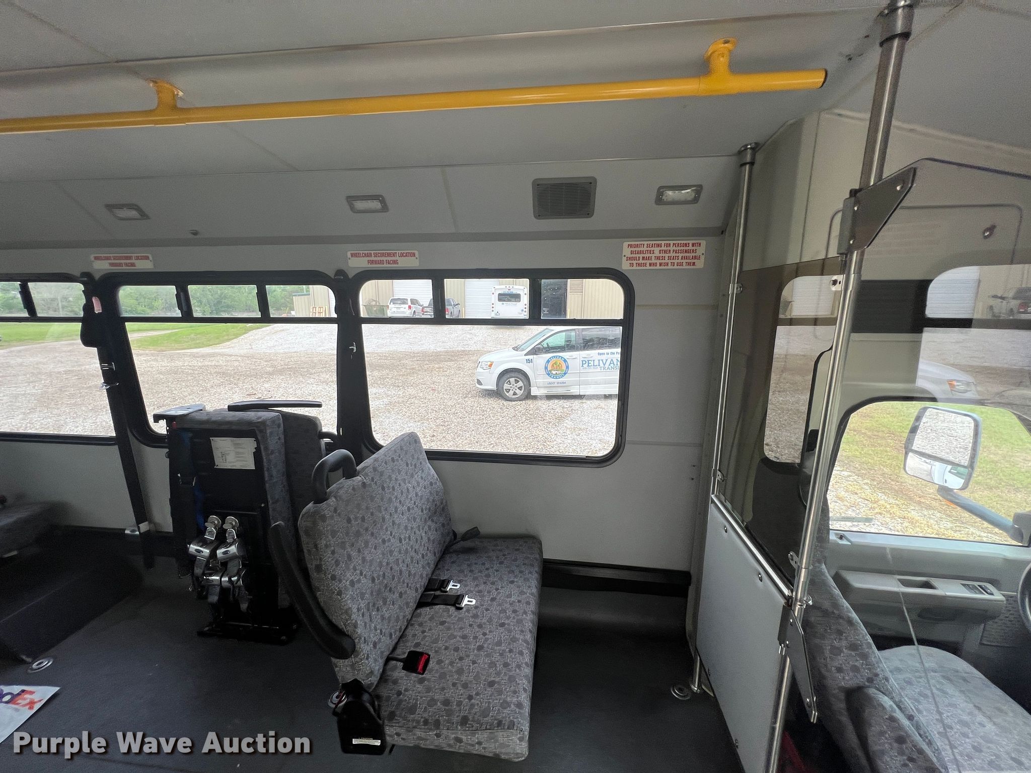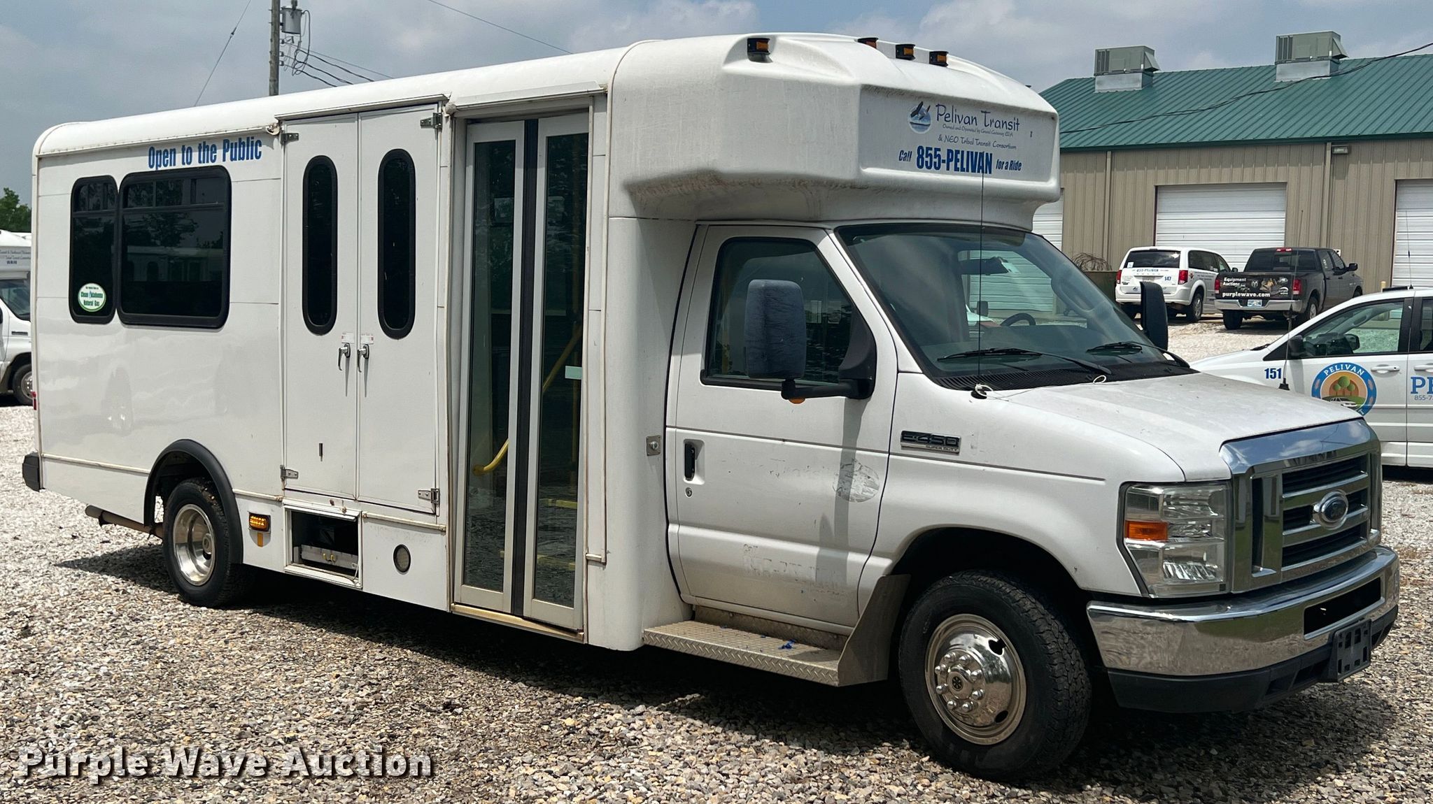 2013 Ford E450 shuttle bus. Miles: 100,491 on odometer, Hours: 4,888 on meter, VIN: 1FDXE4FS2DDA93131. Engine Displacement: 6.8L, Cylinders: 10, Fuel type: CNG. Transmission Automatic. Chassis Axles: Single, Suspension: Spring, Brakes: Hydraulic, GVWR: 14,500 lbs, Wheelbase: 158". Interior AC, Heat, Cruise control, Auxiliary controls, Electric passenger sliding door, Passengers: 14, Wheelchair lift. Tires Size: LT225/75R16. Notes Dash warning indicator: Powertrain malfunction, Dead battery, Catalytic converter missing. Oklahoma title. Grand Gateway Economic Dev. Assc. DBA Pelivan Transit. Big Cabin, OK 74332