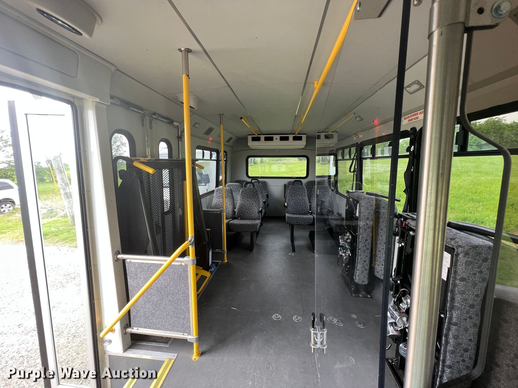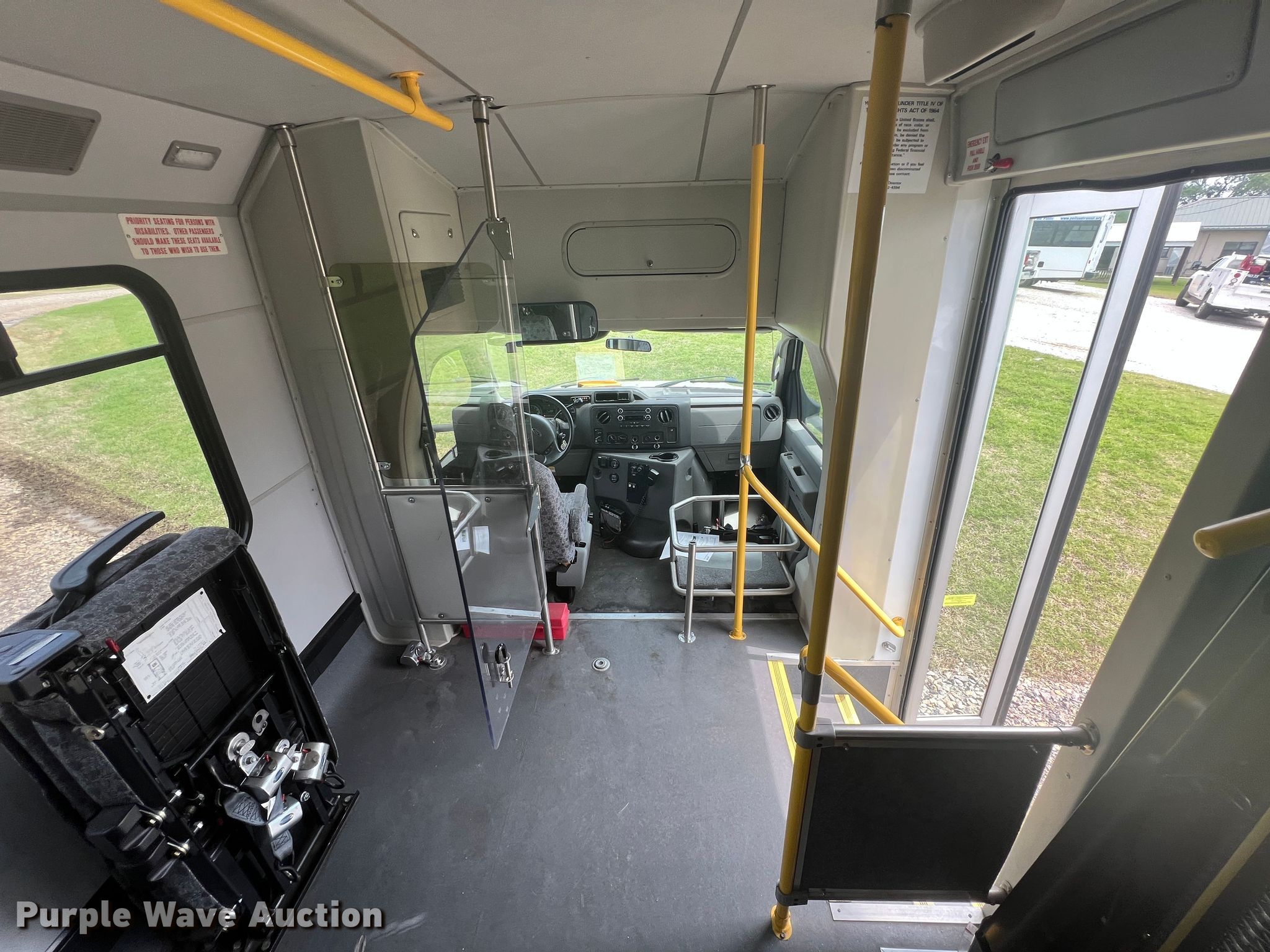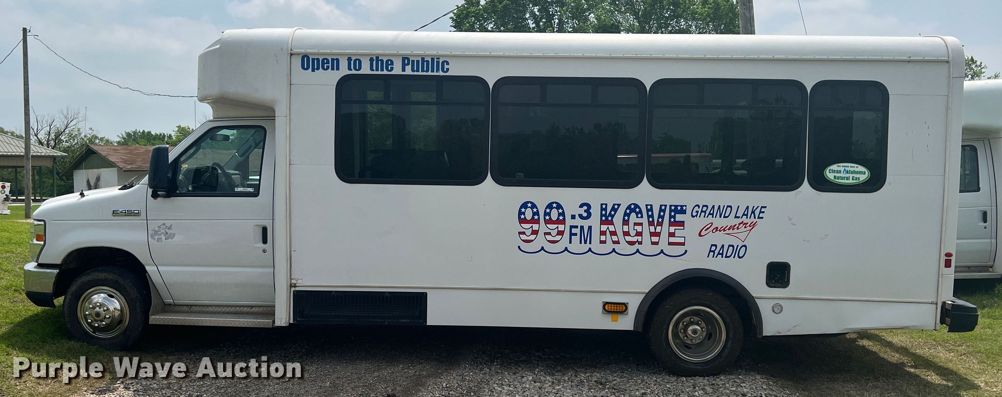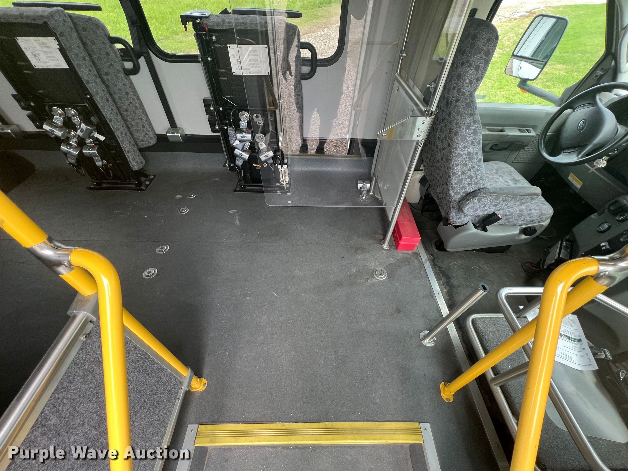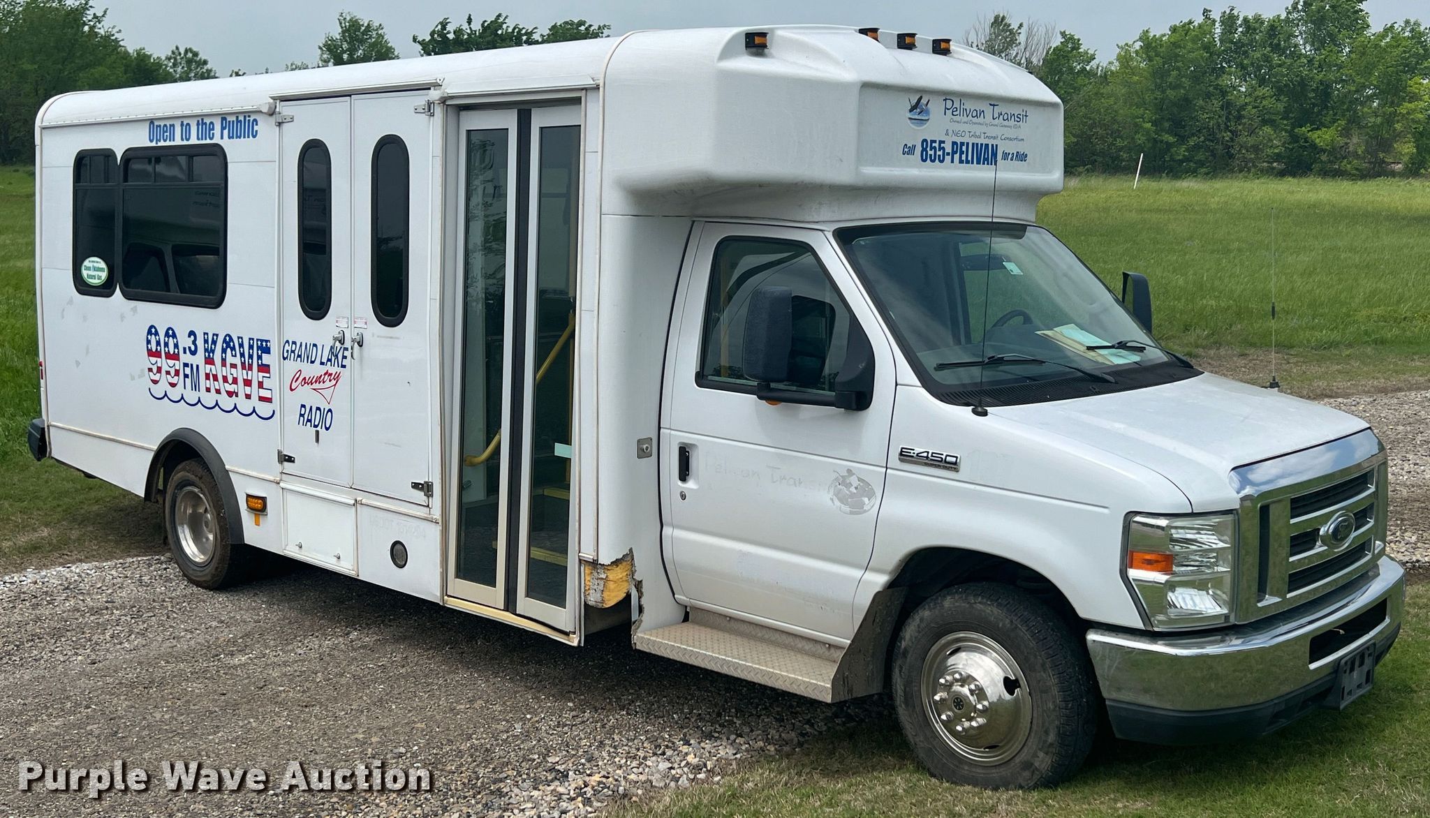 2013 Ford E450 shuttle bus. Miles: 98,309 on odometer, Hours: 6,471 on meter, VIN: 1FDXE4FS0DDA93130. Engine Displacement: 6.8L, Cylinders: 10, Fuel type: CNG. Transmission Automatic. Chassis Axles: Single, Suspension: Spring, Brakes: Hydraulic, GVWR: 14,500 lbs, Wheelbase: 158". Interior AC, Heat, Cruise control, Auxiliary controls, Electric passenger sliding door, Passengers: 14, Wheelchair lift. Tires Size: LT225/75R16. Notes Dead battery, Catalytic converter missing. Oklahoma title. Grand Gateway Economic Dev. Assc. DBA Pelivan Transit. Big Cabin, OK 74332