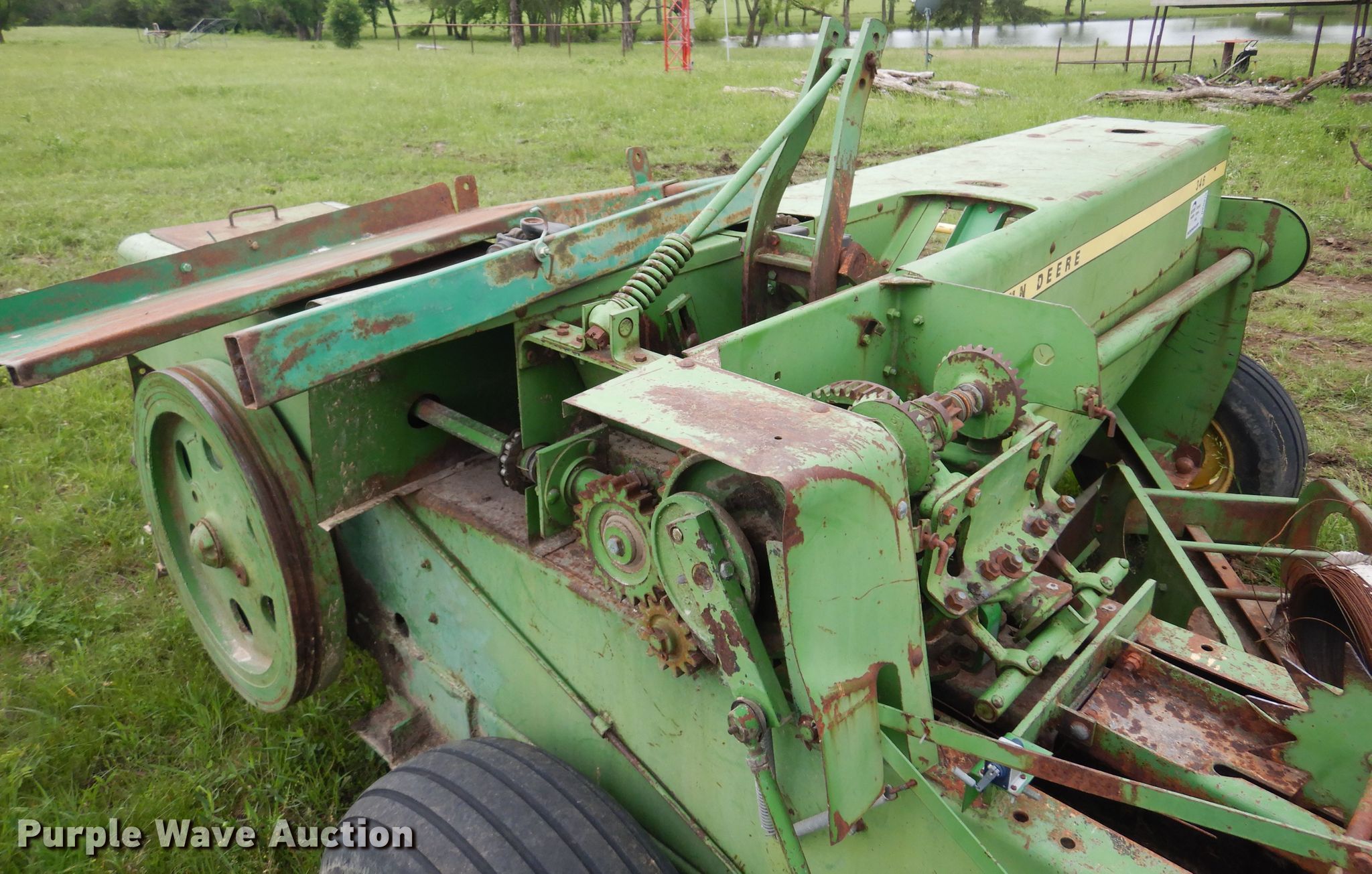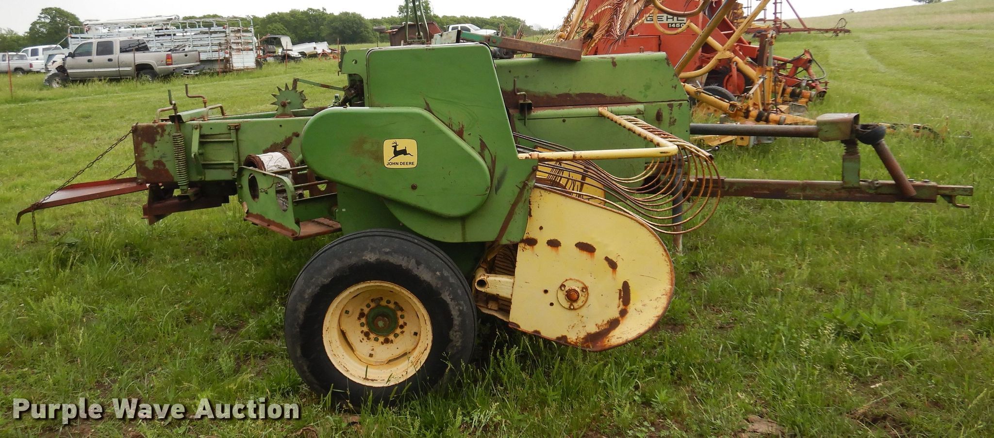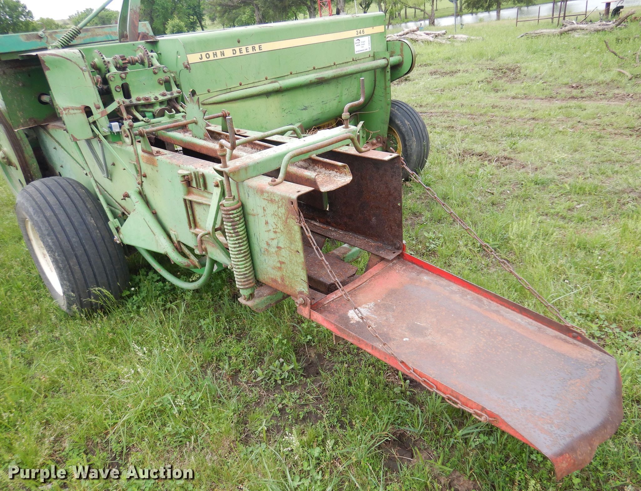 Purple Wave is selling a used Square Baler in Kansas. This item is a John Deere 346 small square baler with the following: Pickup width: 5' 4", Small square bale size: 14"x18", Wire tie, Bale chute