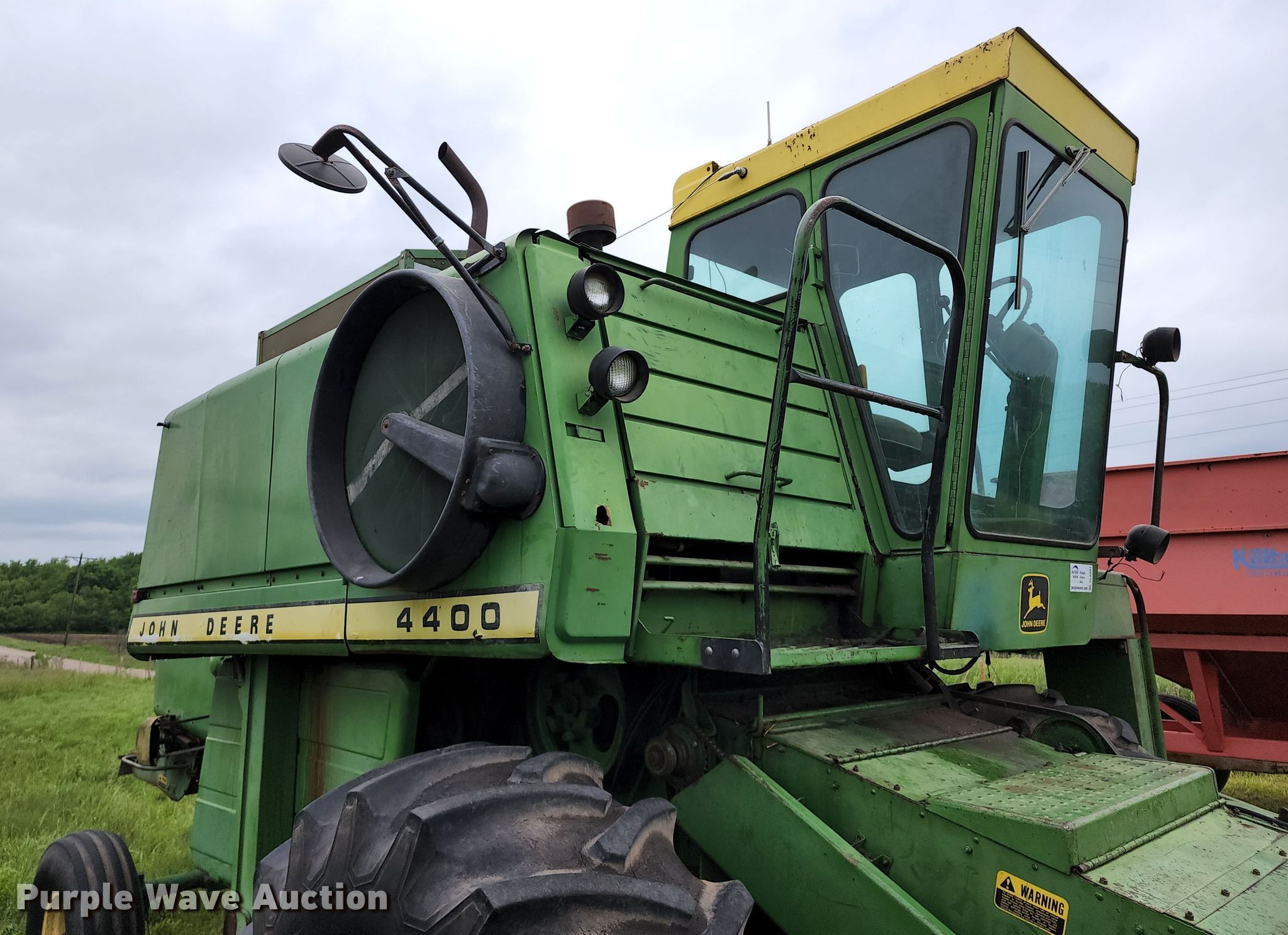 John Deere 4400 combine. Engine hours: 2,684 on meter, Serial: 350462H. Engine Cylinders: 6, Fuel type: Diesel. Transmission Manual, 4F - 1R. Interior AC, Heat. Features Straw chopper, Unloading auger length: 11'. Tires Front: 23.1-26, Rear: 11-16. 181 SW 701st Rd. Centerview, MO 64019