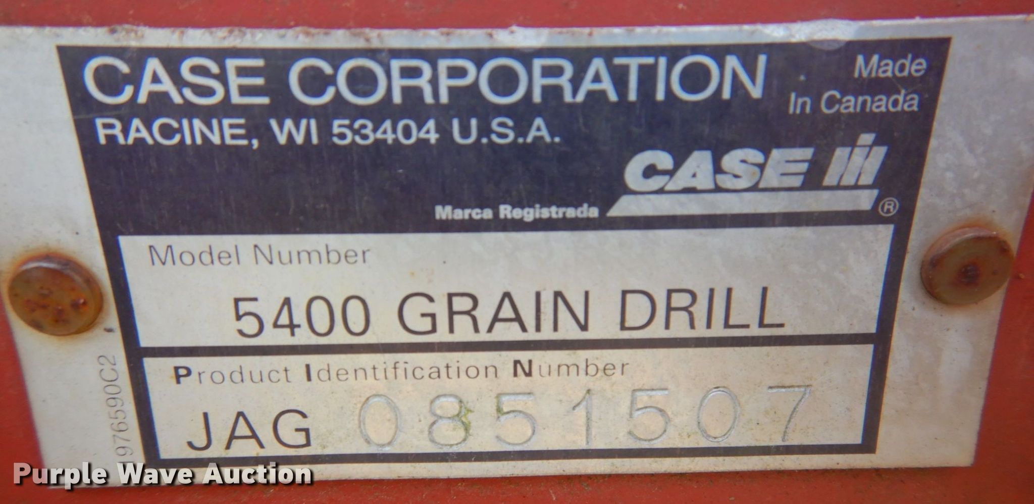 Case IH 5400 Soybean Special grain drill. Width: 20', Row units: 15, Row spacing: 15", Serial: JAG0851507. Features Frame Hitch: Three point, Marker arm, Seed delivery Bulk fill system, Row units Meter drive: Ground, Disk openers: Double, Gauge wheels: Double, Closing system: Double Type: Cast.. Tires Transport tire size: 9.5L-14. 27637 Inca Ave. Princeton, MO 64673