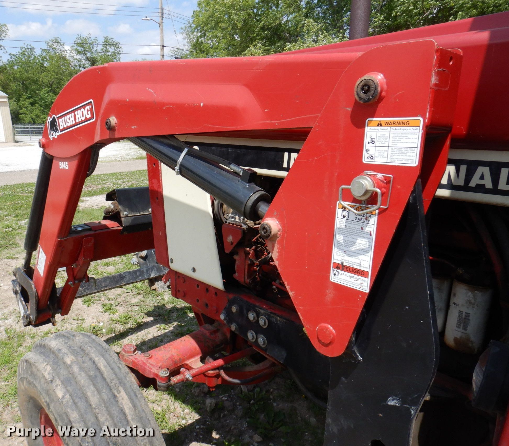 International 1086 tractor. Hours: 6,714 on meter, Serial: 2610177U012592. Engine Cylinders: 6, Fuel type: Diesel. Transmission Torque amplifier, 16F - 8R. Operators station Heat. Features PTO: 540, 1000, Three point, Seven pin outlet, Hydraulic remote sets Rear: 2, Loader Bush Hog 5145, Quick attach, Controls: Joystick, Bucket Width: 84", Bale spear Alamo, Length: 42", Grapple. Tires Front: 11.00-16, Rear: 18.4-38, Wheel weights: 4. Notes Possible door hinge issue. 106 N Main St. Vermont, IL 61484