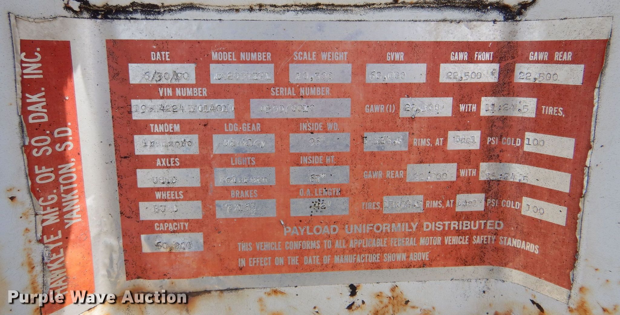Purple Wave is selling a used Grain or Commodity Trailer in Kansas. This item is a 1991 Dakota E4200IIGL grain trailer with the following: VIN: 1T9SH4224MY014010