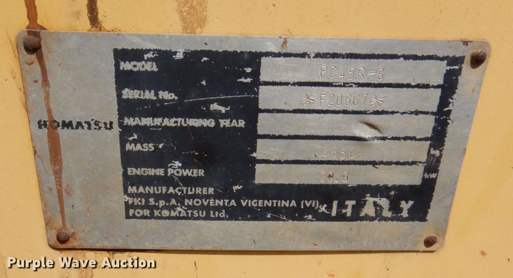 Purple Wave is selling a used Mini Excavator in Missouri. This item is a 2000 Komatsu PC45R-8 mini excavator with the following: Hours: 4,713 on meter, Miles or hours may vary, unit still in use, Serial: F20667