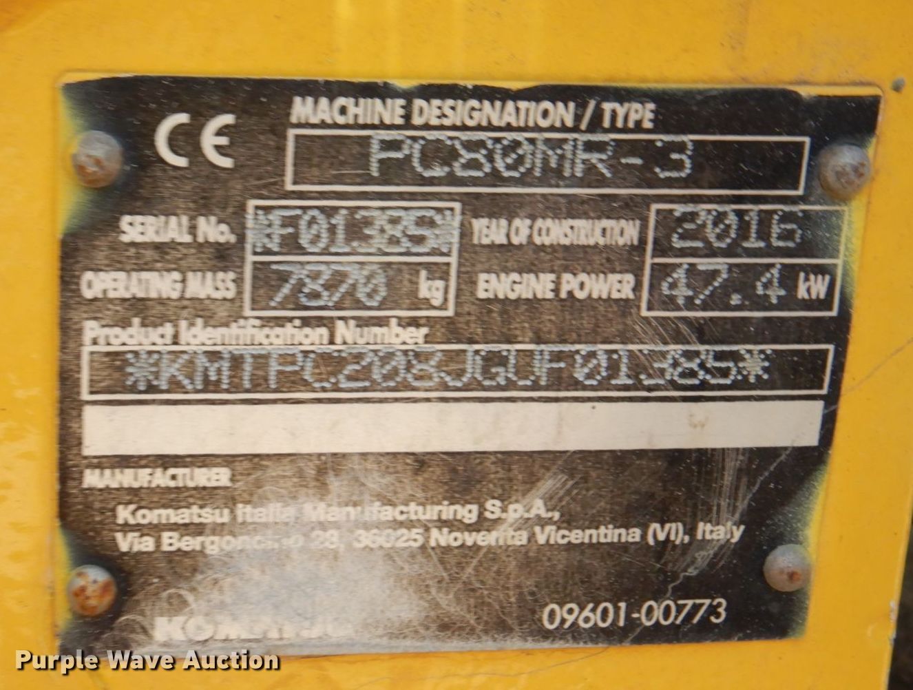 Purple Wave is selling a used Mini Excavator in Missouri. This item is a 2016 Komatsu PC80MR-3 mini excavator with the following: Hours: 2,358 on meter, Miles or hours may vary, unit still in use, Serial: KMTPC208JGVF01385