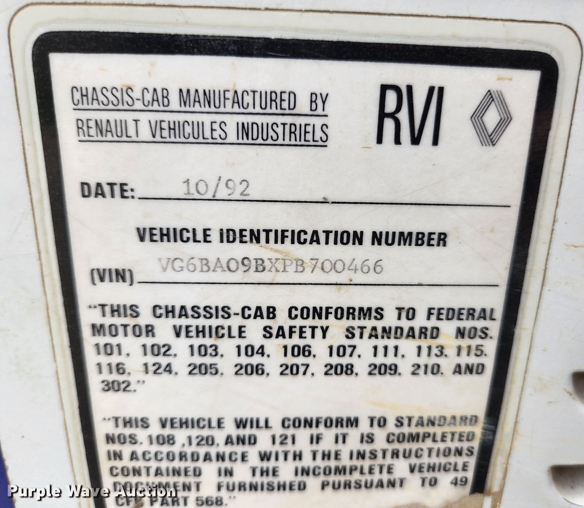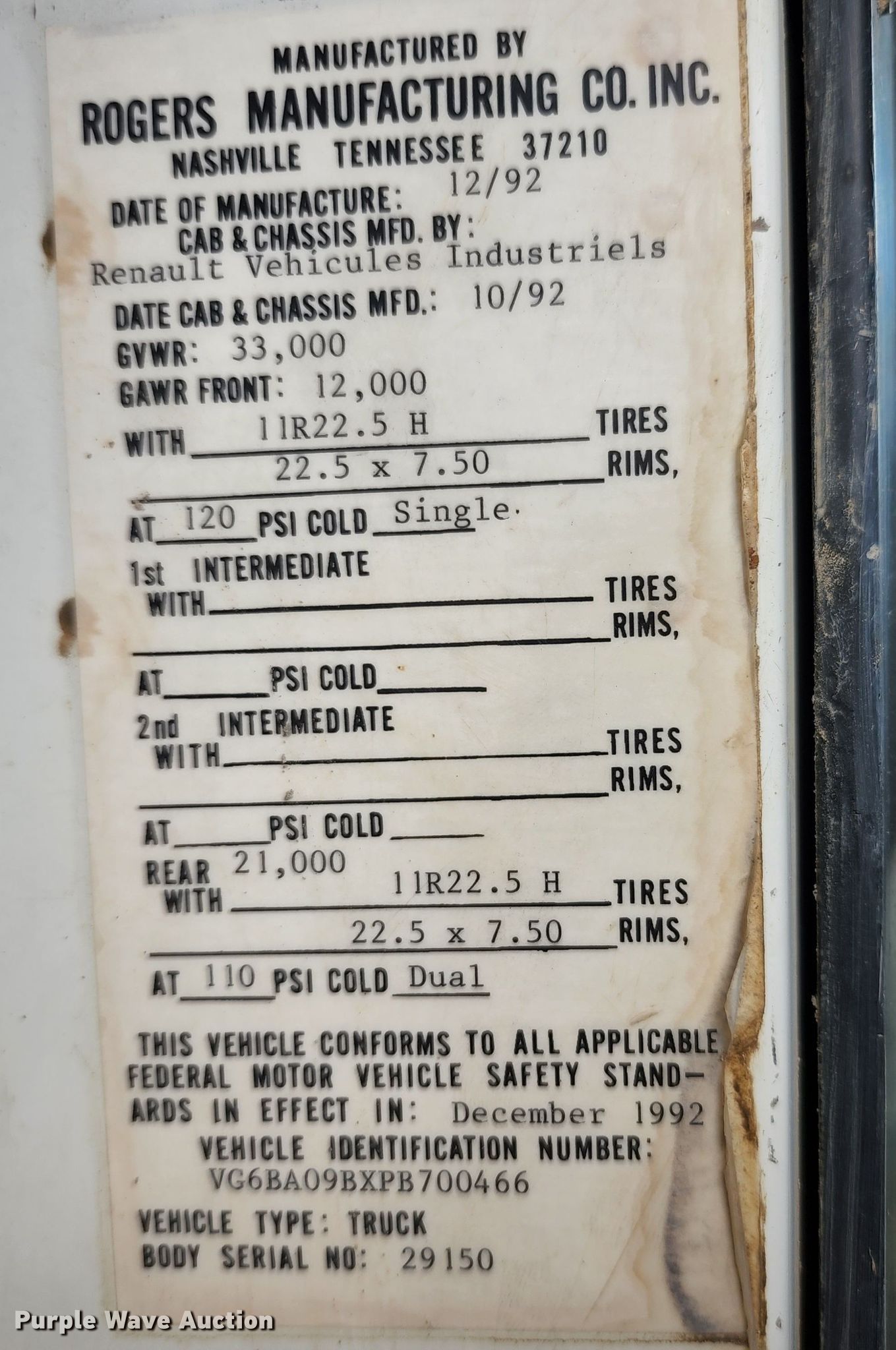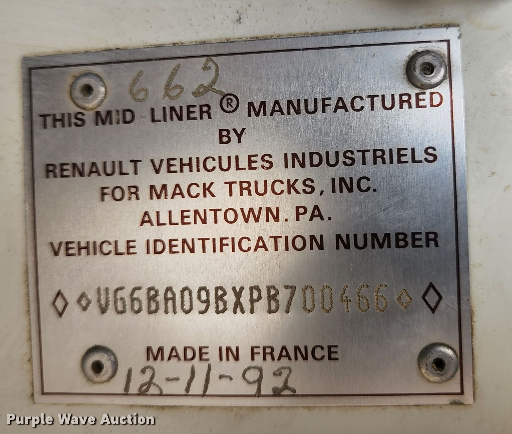 1993 Mack CS300P dump truck. Miles: 176,680 on odometer, Miles or hours may vary, unit still in use, VIN: VG6BA09BXPB700466. Engine Renault, Cylinders: 6, Fuel type: Diesel. Transmission Manual. Chassis Axles: Single, Suspension: Spring, Brakes: Air, PTO, GVWR: 33,000 lbs FAWR: 12,000 lbs, RAWR: 21,000 lbs. Interior Heat, Brake controller. Features Dump bed Rogers, 10' L x 96" W, Side height: 30", Side board height: 10", Bed type: Steel, Roll tarp, Ram: Single , End gate: Manual. Tires Size: 11R22.5. Missouri title. Bi-State Utilities Co - Open Inspection June 21 and 22. 12894 Pennridge Dr. Bridgeton, MO 63044