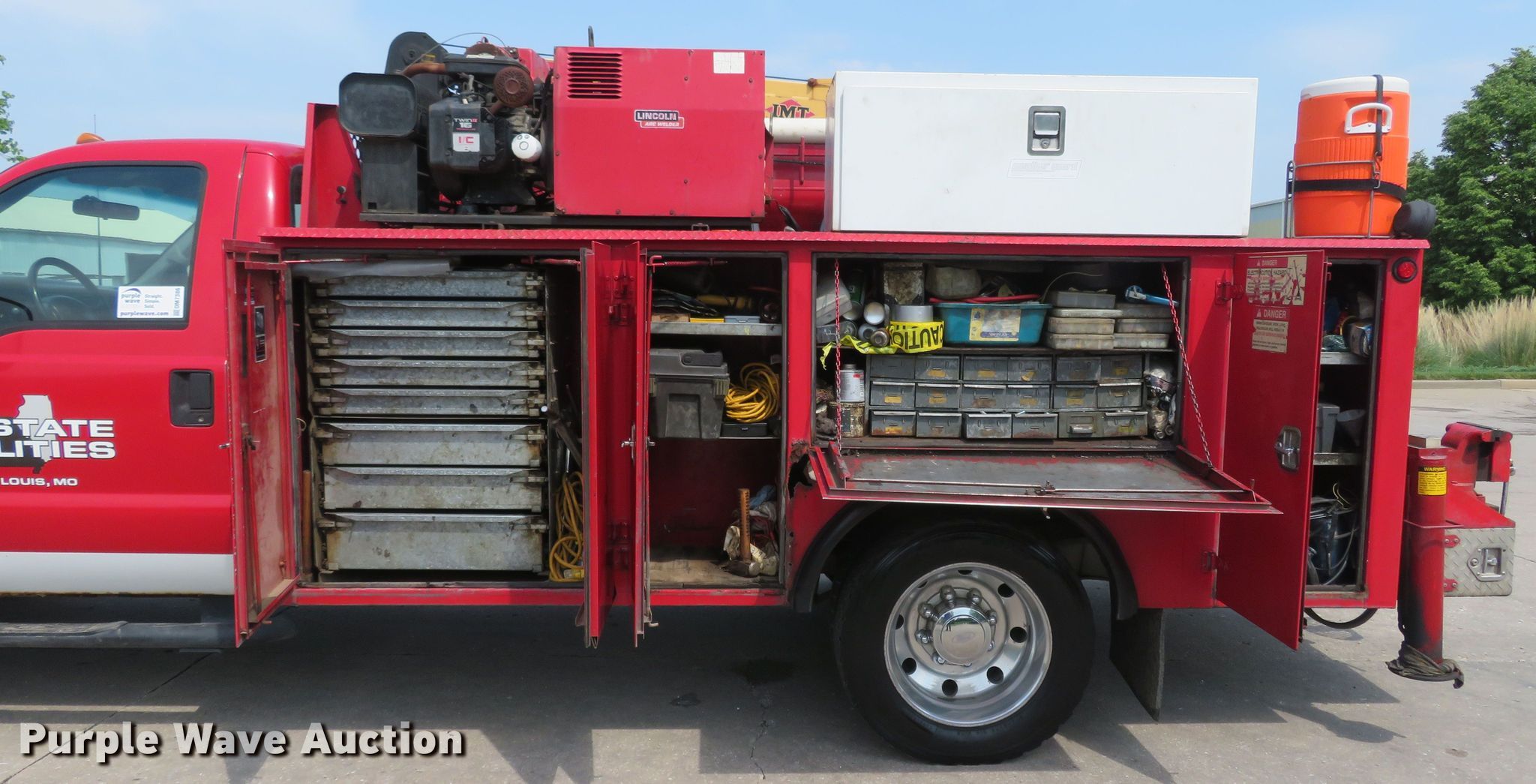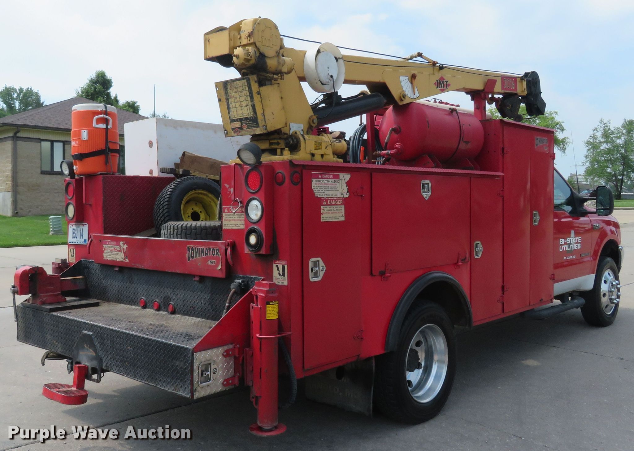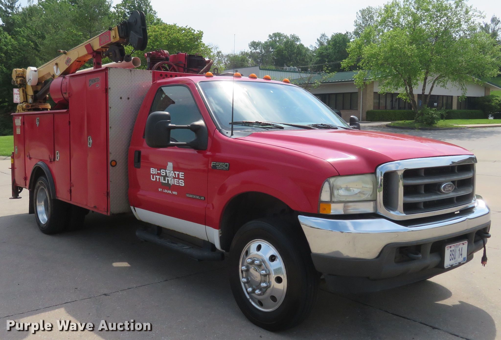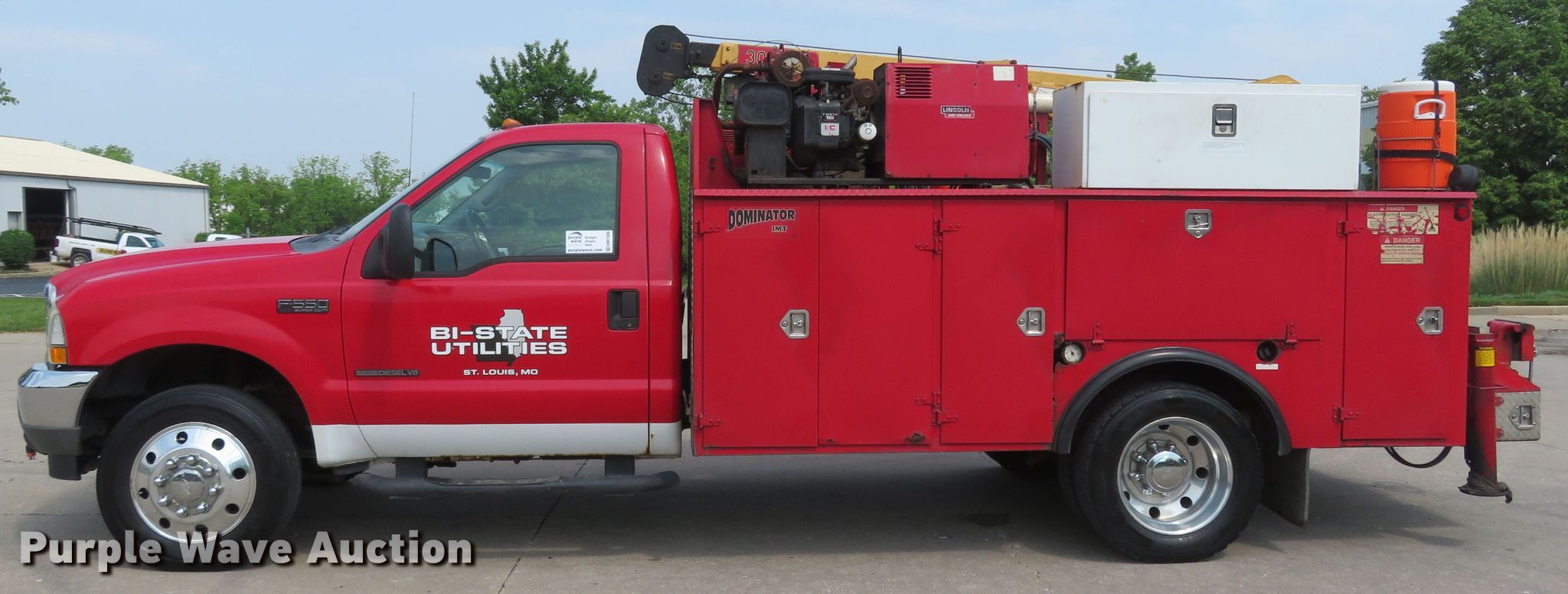 2002 Ford F550 Super Duty utility / service truck. Miles: 183,198 on odometer, Miles or hours may vary, unit still in use, VIN: 1FDAF56F62EC08767. Engine Displacement: 7.3L, Cylinders: 8, Fuel type: Diesel. Transmission Manual, Speed: 6. Chassis Axles: Single, Suspension: Spring, Brakes: Hydraulic, PTO, GVWR: 17,500 lbs, Wheelbase: 165". Interior AC, Heat, Power windows, Power locks, Cruise control. Features Bed IMT Dominator, 11' x 93" W, Torch bottle rack Tanks not included, Welder/generator, Lincoln Weldanpower 225 G7, Fuel type: Gas, Welder type: Leads, Air compressor Kohler M12S, Oil/lube system Reservoirs, Fuel tank Nozzles, Pump, Crane IMT 3016, Boom length: 21', Maximum lift capacity: 6,000 lbs. Tires Size: 225/70R19.5. Notes Decals will be removed prior to auction, Contents not included, Gas shut off valve leaks on air compressor , Anti two block issues. Missouri title. Bi-State Utilities Co - Open Inspection June 21 and 22. 12894 Pennridge Dr. Bridgeton, MO 63044