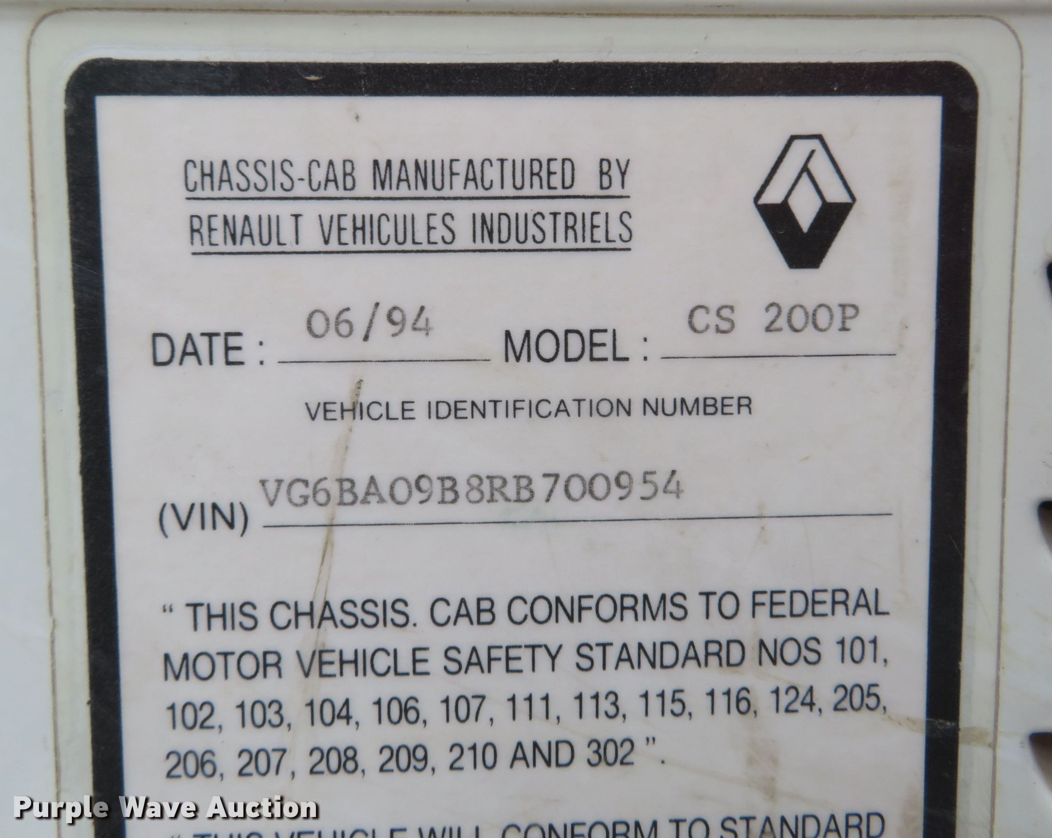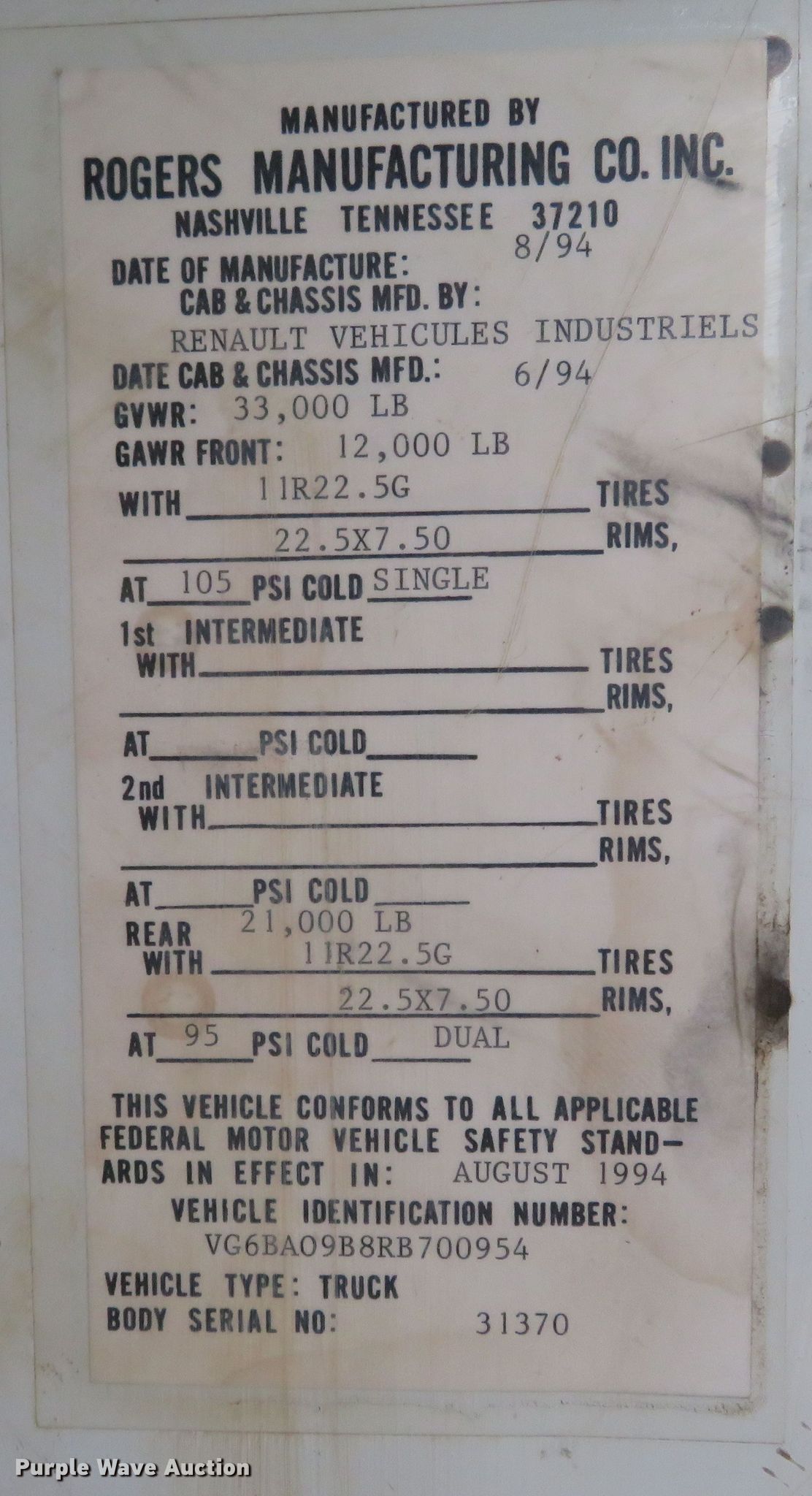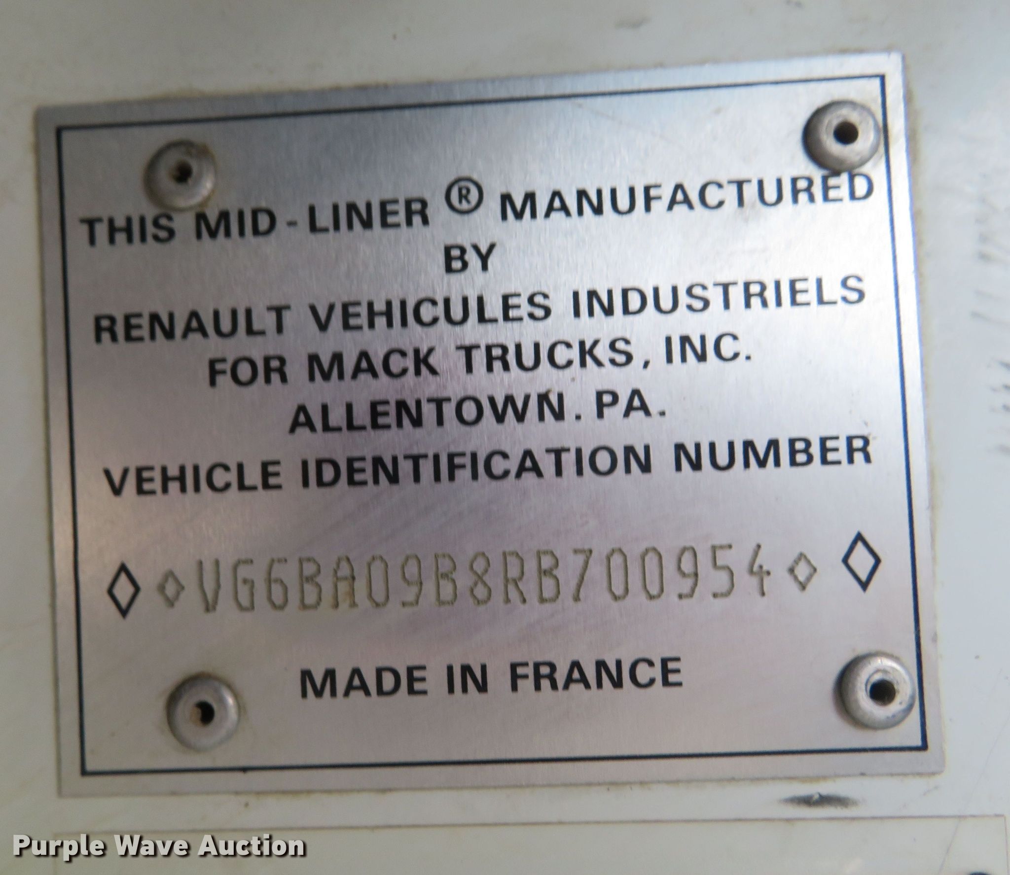 1994 Mack CS200P dump truck. Miles: 162,667 on odometer, VIN: VG6BA09B8RB700954, Unit #: 4. Engine Renault, Displacement: 6.2L, Cylinders: 6, Fuel type: Diesel. Transmission Manual, Speed: 6. Chassis Axles: Single, Suspension: Spring, Brakes: Air, PTO, GVWR: 33,000 lbs FAWR: 12,000 lbs, RAWR: 21,000 lbs, Wheelbase: 149". Interior Heat. Features Dump bed Rogers, 10' L x 96" W, Side height: 30", Side board height: 12", Bed type: Steel, Roll tarp, Ram: Single , End gate: Manual. Tires Size: 11R22.5. Notes Non-operational interior driver door handle. Missouri title. Bi-State Utilities Co - Open Inspection June 21 and 22. 12894 Pennridge Dr. Bridgeton, MO 63044