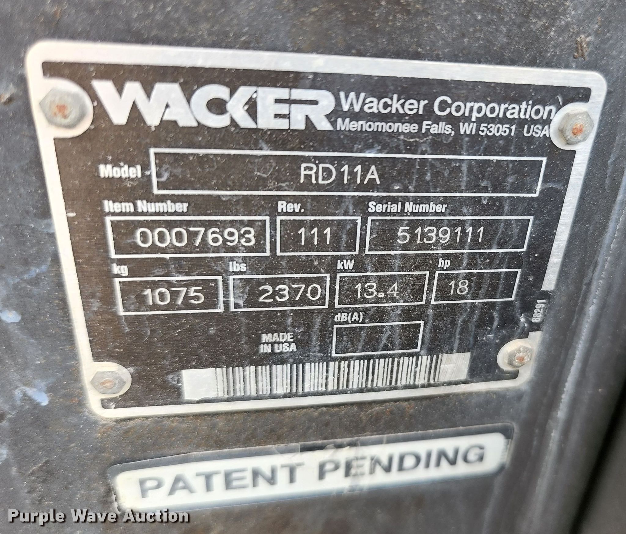 2001 Wacker RD11A double drum vibratory roller. Hours: 13 on meter, Serial: 5139111. Engine Honda GX610, Cylinders: 2, Fuel type: Gas, HP: 18. Transmission Hydrostatic. Operators station OROPS. Features Drum: Smooth, Vibratory system: Single, Front drum Width: 35", Diameter: 22", Rear drum Width: 35", Diameter: 22", Drum scrapers: Front, Rear, Water spray applicator: Front, Rear. Bi-State Utilities Co - Open Inspection June 21 and 22. 12894 Pennridge Dr. Bridgeton, MO 63044