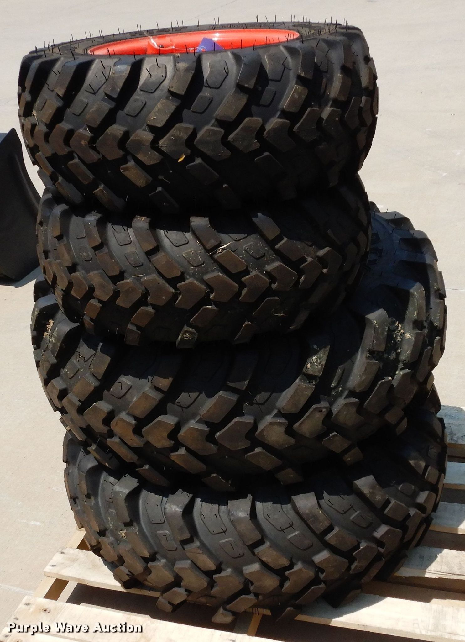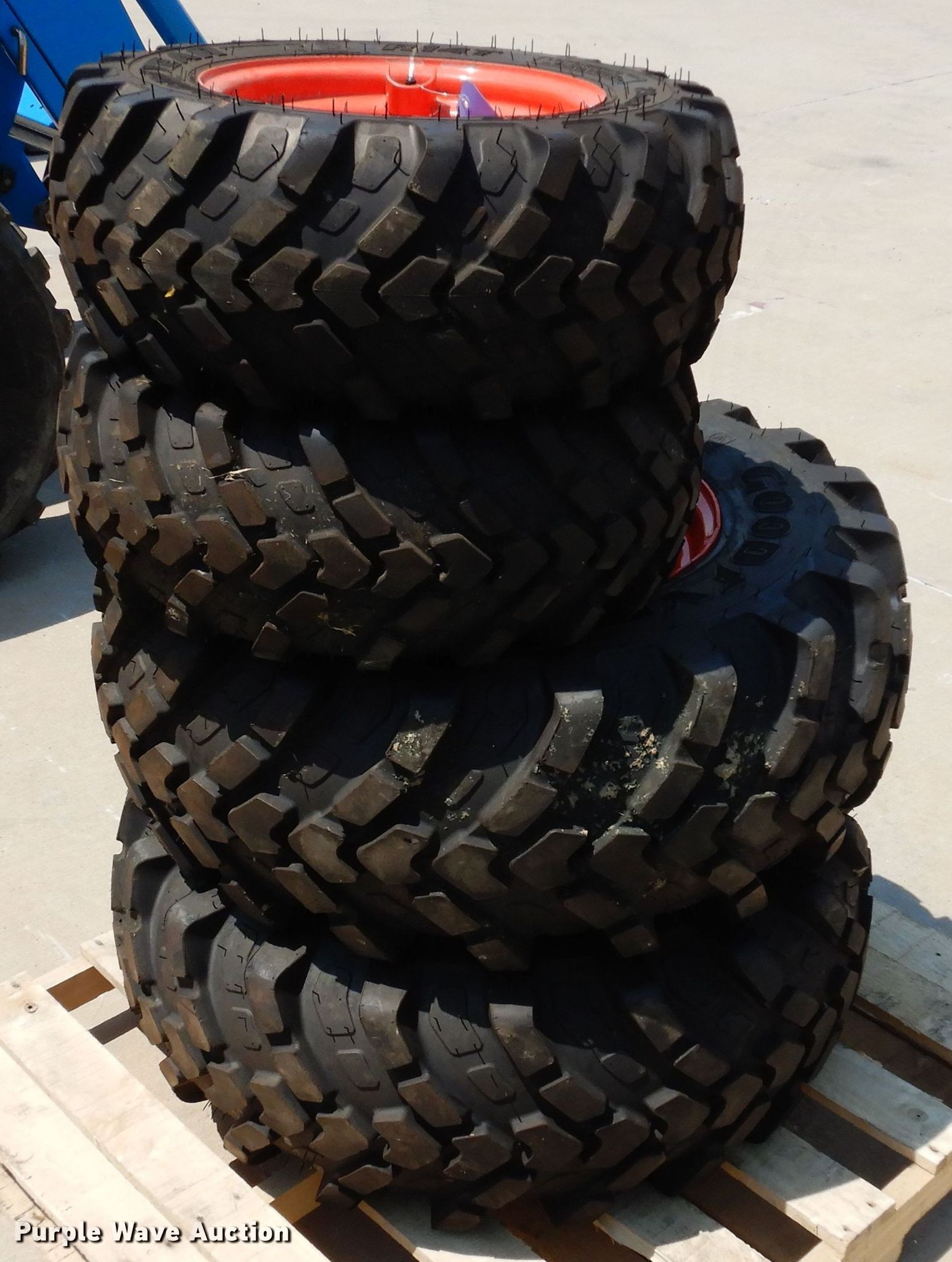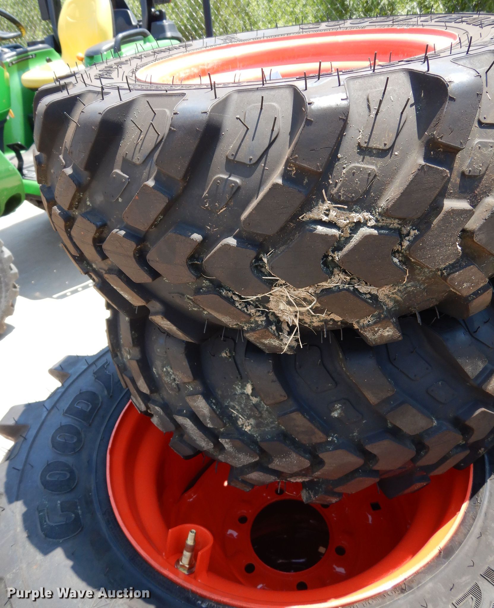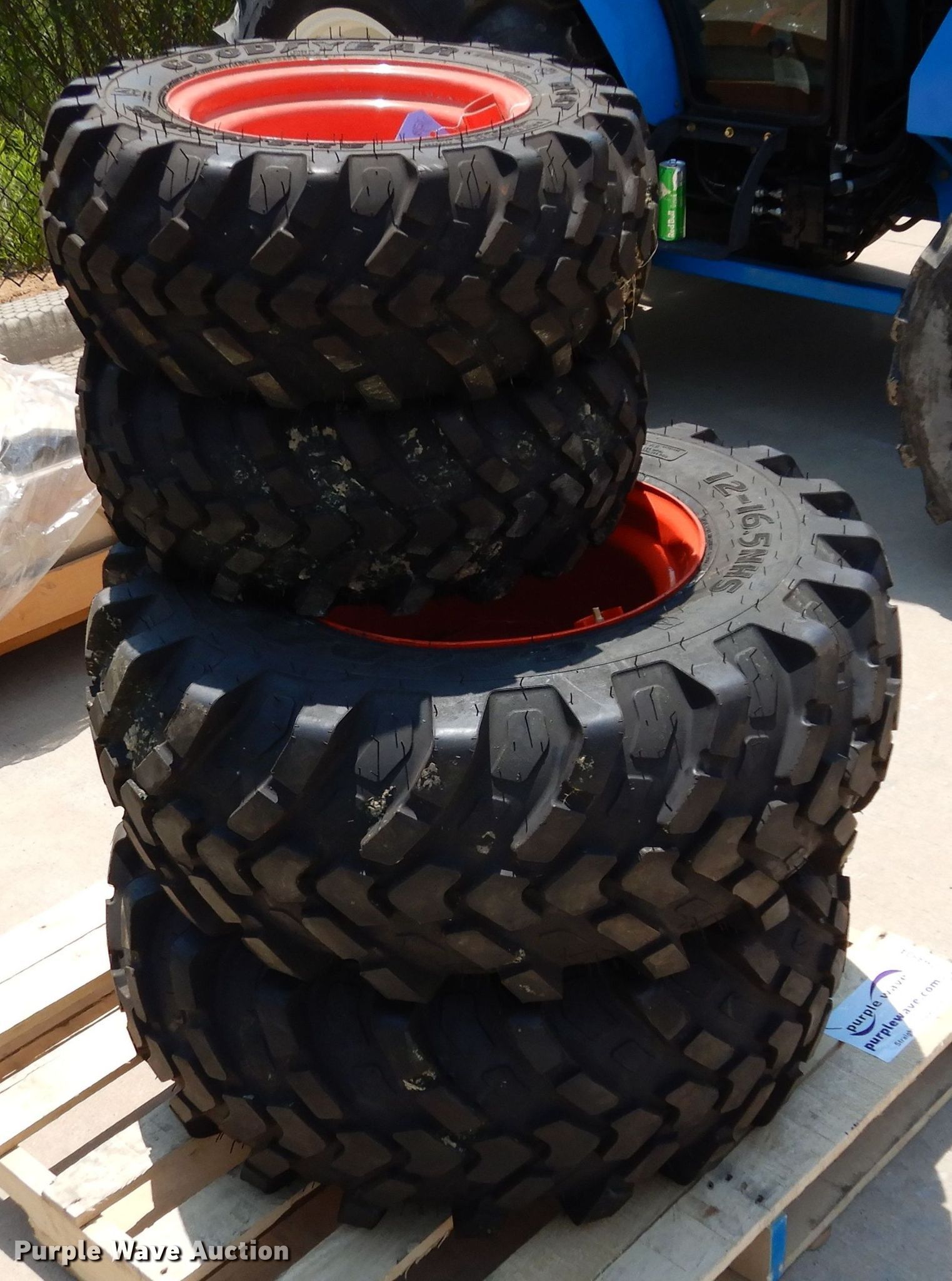 Purple Wave is selling a used Industrial Tires or Tracks in Texas. This item is a (4) Goodyear R14T tires and wheels with the following: (2) 23x8.50-12NHS, (2) 12-16.5NHS, Six bolt wheels