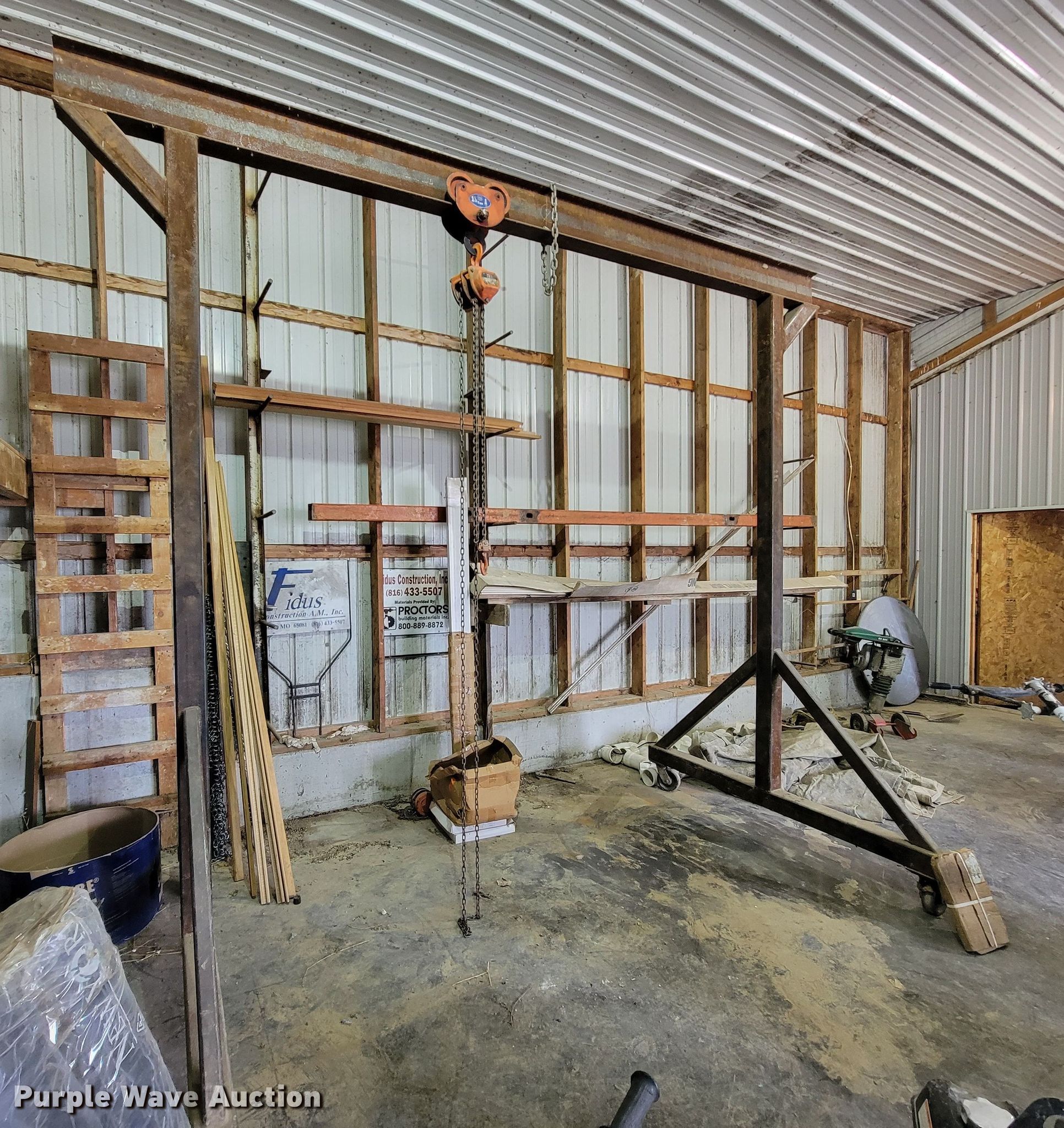 A-frame chain hoist. Jet L90 one ton capacity chain hoist, 9' 3" W x 10' H , Spare chain hoist included. Fidus Construction Retirement Auction. 211 Selly Place. Tipton, MO 65081