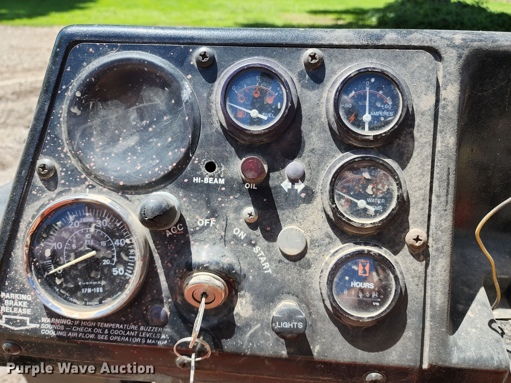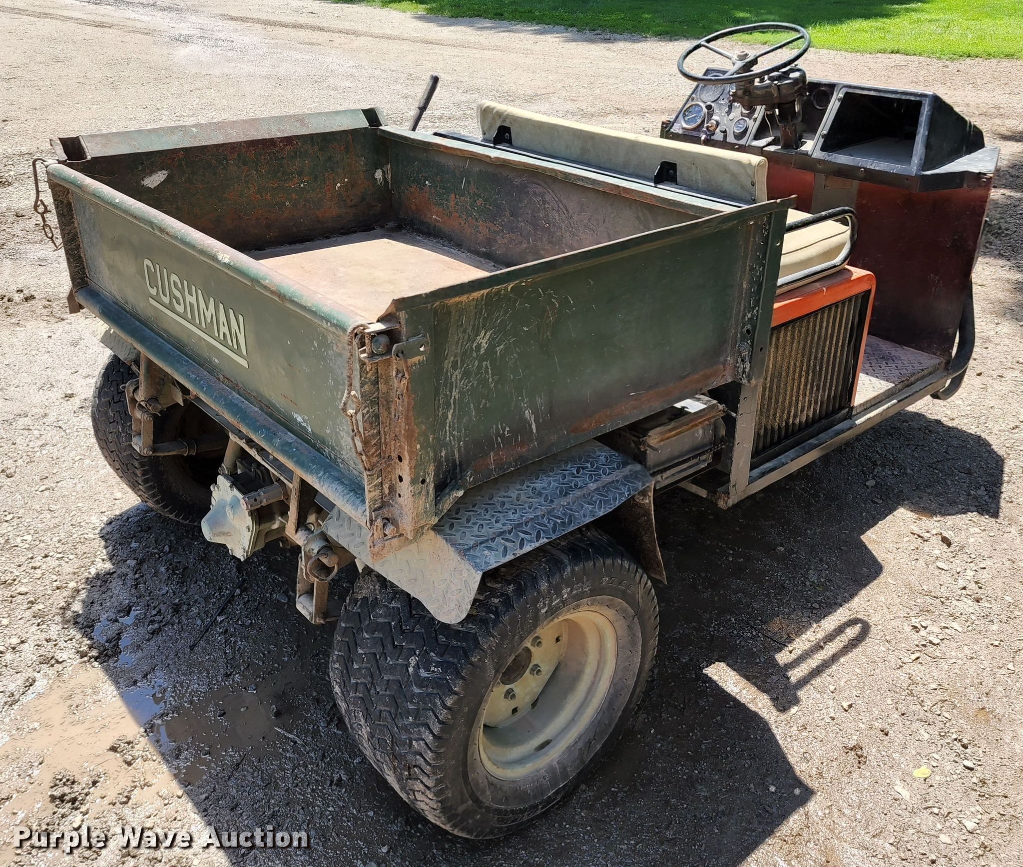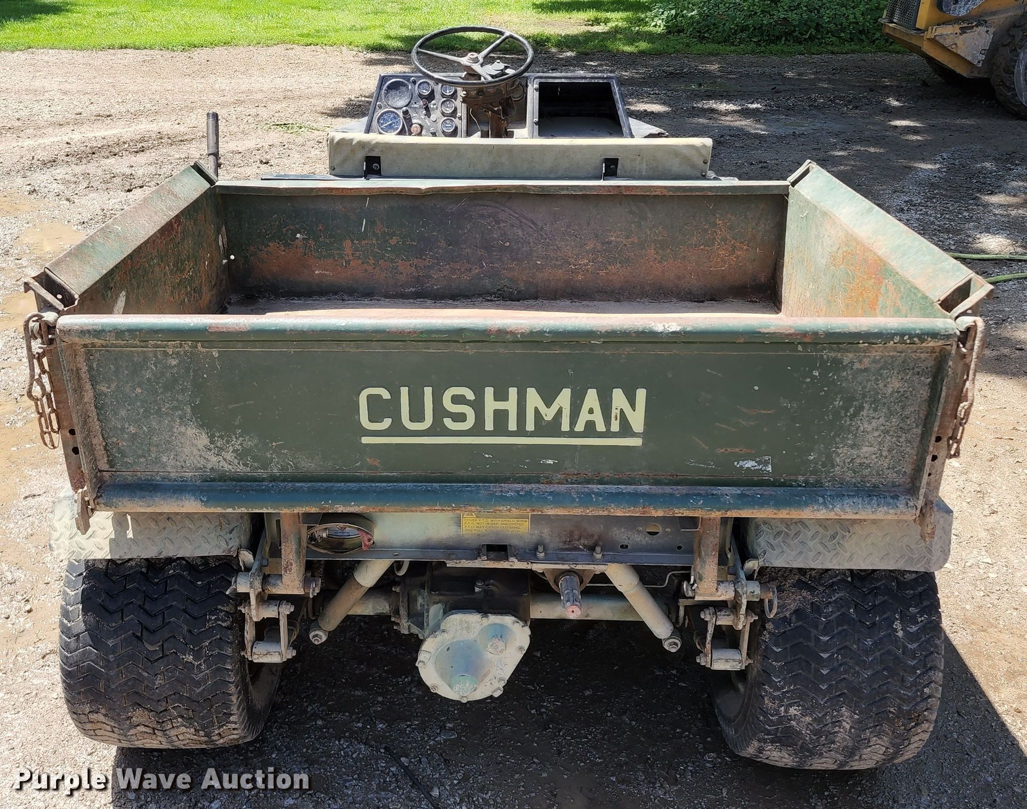 Cushman golf cart. Hours: 155 on meter, VIN: 1CUNH3278NL000781. Engine Cylinders: 3, Fuel type: Gas, HP: 27. Transmission Speed: 3. Features Dump bed 38" L x 56" W, PTO: 540 Dump bed type: Electric/ Hydraulic. Tires Size: 24x13x12. R.J. Smith Farms. 29620 Shaler Rd. Cleveland, MO 64734