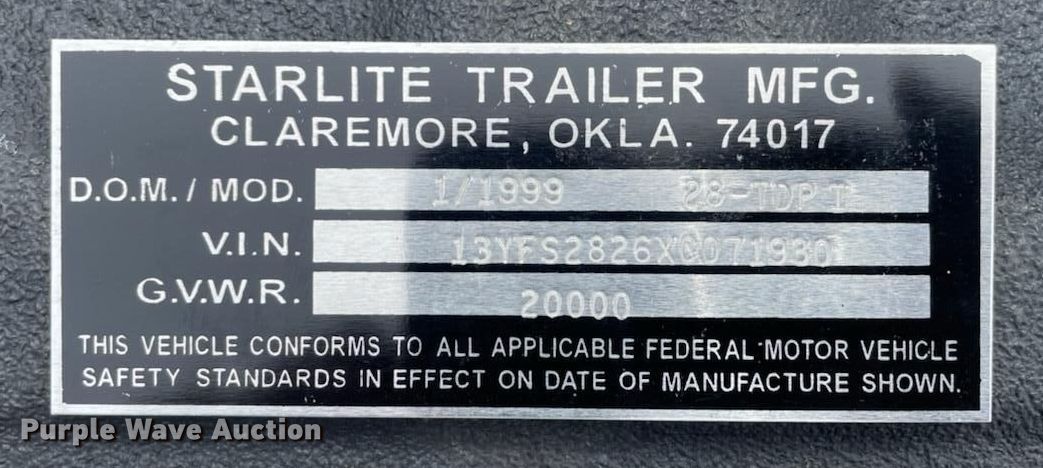 Purple Wave is selling a used Equip. Trailer in Oklahoma. This item is a 1999 Starlite Equipment trailer with the following: VIN: 13YFS2826XC071930