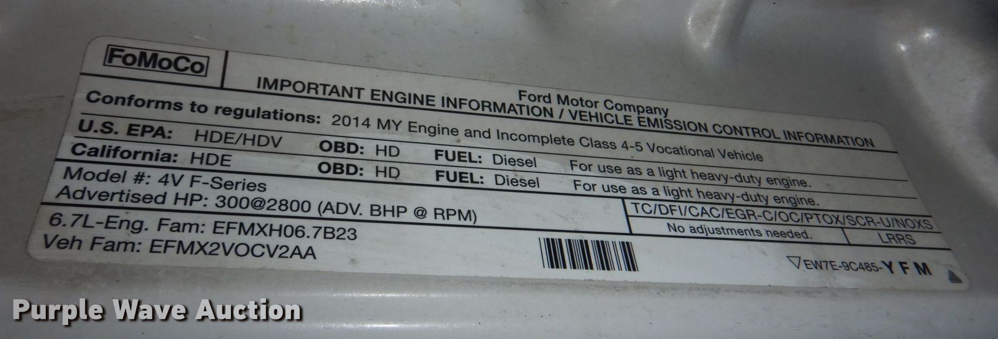 2014 Ford F550 Super Duty tow truck. Miles: 27,858 on odometer, VIN: 1FDUF5HT2EEB42707. Engine Displacement: 6.7L, Cylinders: 8, Fuel type: Diesel. Transmission Automatic. Chassis Four wheel drive, Axles: Single, Suspension: Spring, Brakes: Hydraulic, PTO, GVWR: 19,500 lbs, Wheelbase: 142". Interior AC, Heat, Power windows, Power locks, Auxiliary controls. Features Wrecker bed, Wrecker boom: Hydraulic extendable Capacity: 20,000 lbs, Winch Dual, Capacity: 3,000 lbs, Underlift Hydraulic fold, Capacity: 5,000 lbs, Remote control, Front winch Ramsey Patriot 15000. Tires Size: 225/70R19.5. Notes Dash warning indicator: Check engine. New York title. Midwest Waste Trucks. 2011 W Clarice Street. Doniphan, NE 68832