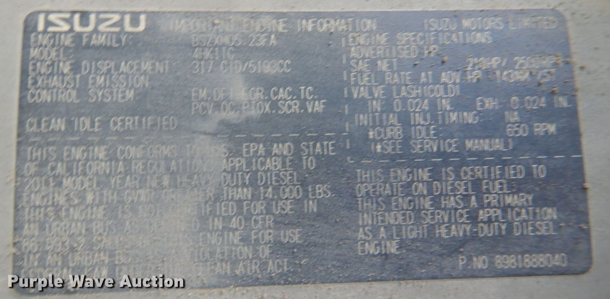 2012 Isuzu NPR HD street sweeper truck. Miles: 162,455 on odometer, Hours: 922 on meter, VIN: JALC4W162C7002396. Engine Isuzu 4HK1TC, Displacement: 5.2L, Cylinders: 4, Fuel type: Diesel, HP: 210. Transmission Automatic. Chassis Suspension: Spring, GVWR: 14,500 lbs. Operators station Enclosed cab, AC, Heat. Features Broom Width: 78", Sweeper bed Sweeper bed type: Vacuum Tymco 210, Serial: 201312SNH21454, Left gutter broom Diameter: 24", Engine Kubota V2403-T, Serial: 7CL7125, Displacement: 2.4L, Cylinders: 4. Tires Size: 215/85R16. Notes Dead battery. Texas title. San Antonio Building Services. 1528 N Zarzamora St. San Antonio, TX 78207