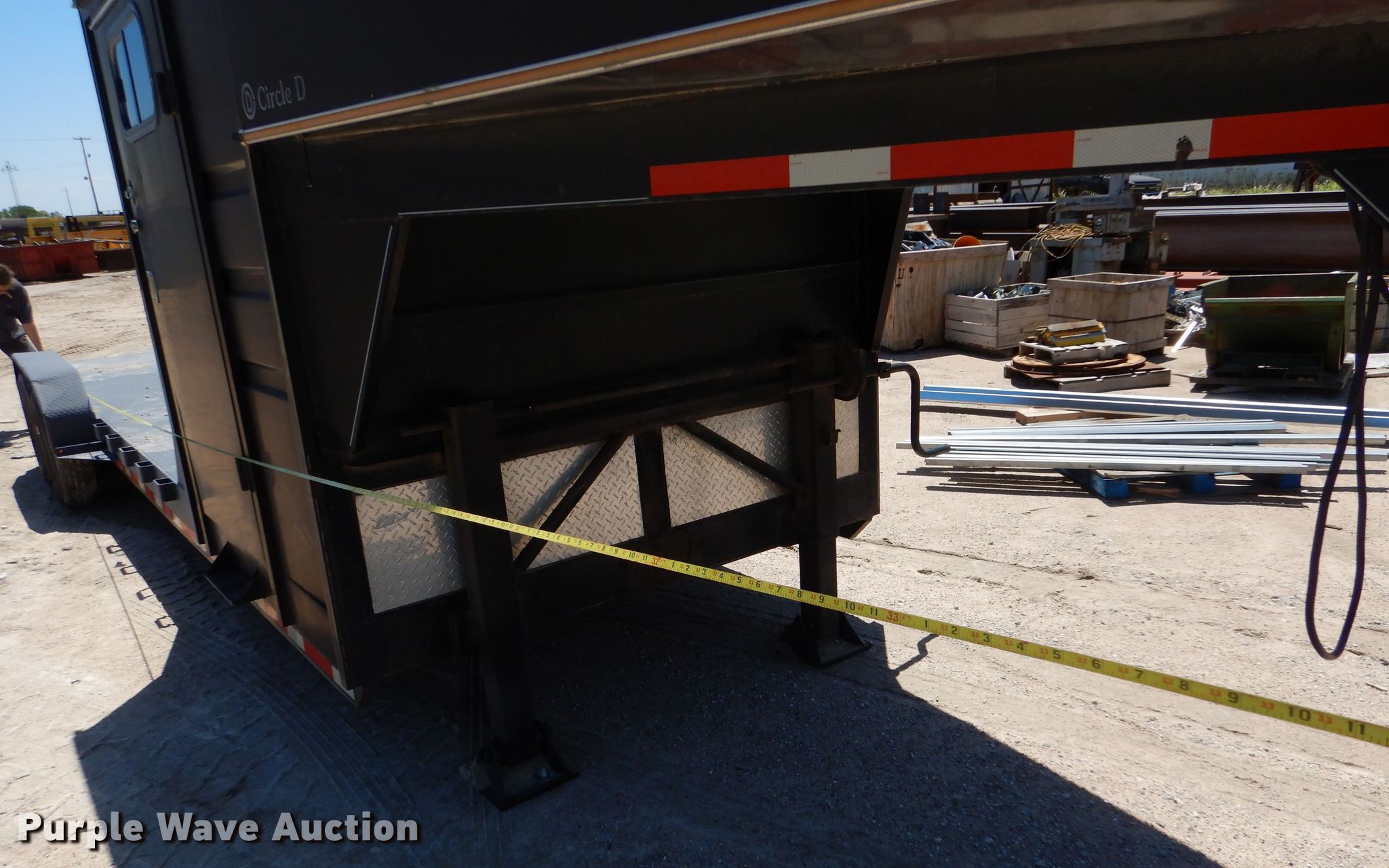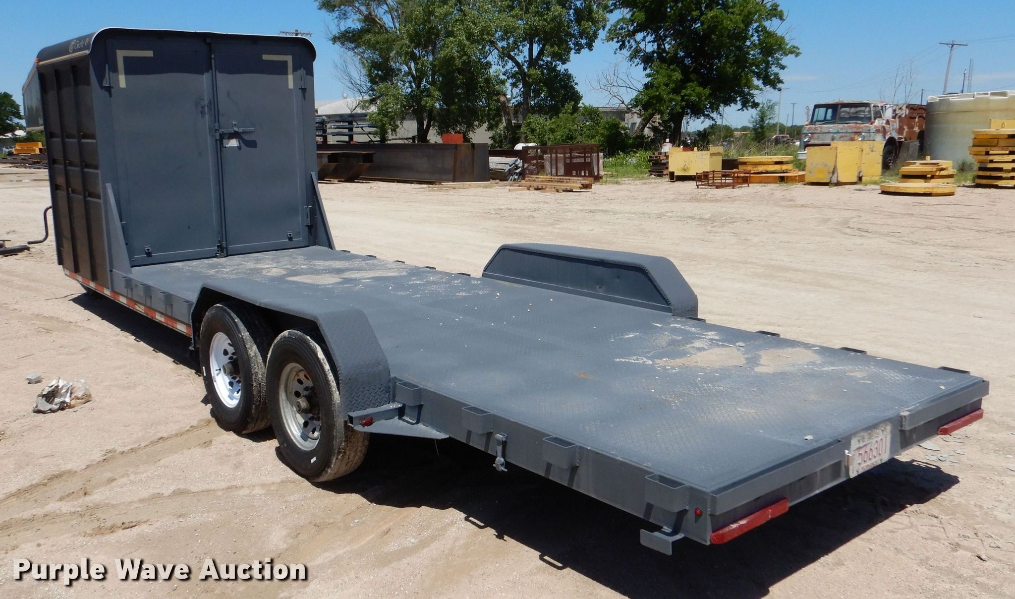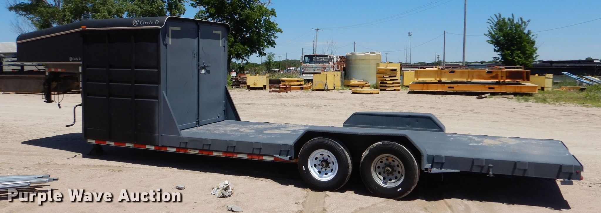 2012 Circle D 26GNMP equipment trailer. VIN: 4D3FG3422C1014554. Dimensions Overall: 33' 6" L x 102" W, Deck: 20' L x 80" W, Deck height: 23", 6' L x 80" W x 80" H enclosed box. Features Deck type: Steel. Chassis Hitch: Gooseneck, Landing gear: Dual, Brakes: Electric, Axles: Tandem, GVWR: 16,000 lbs, GAWR: 8,000 lbs. Tires Steel wheels, Size: 235/80R16. Kansas title. Mackey & Sons, Inc.. Newton, KS 67114