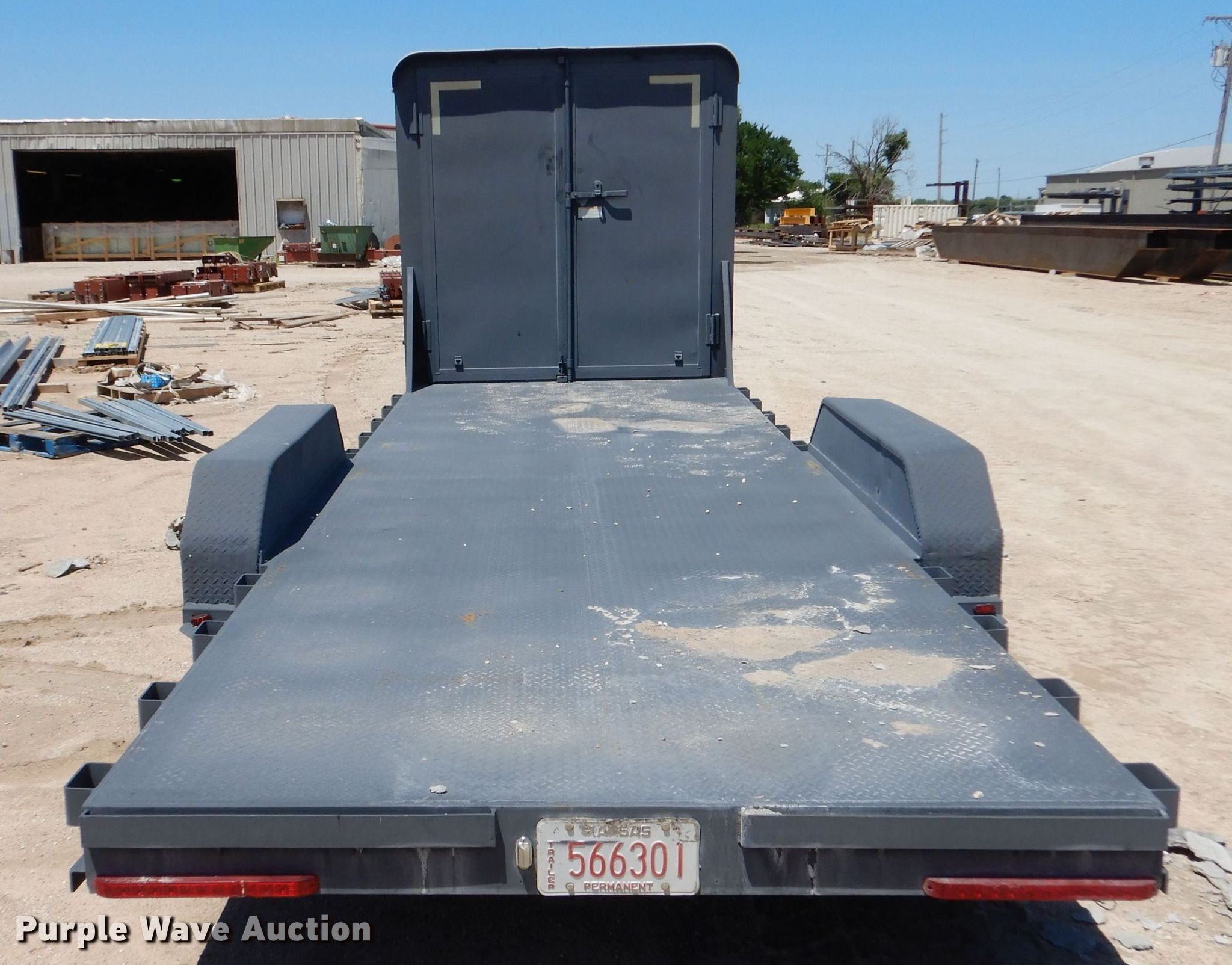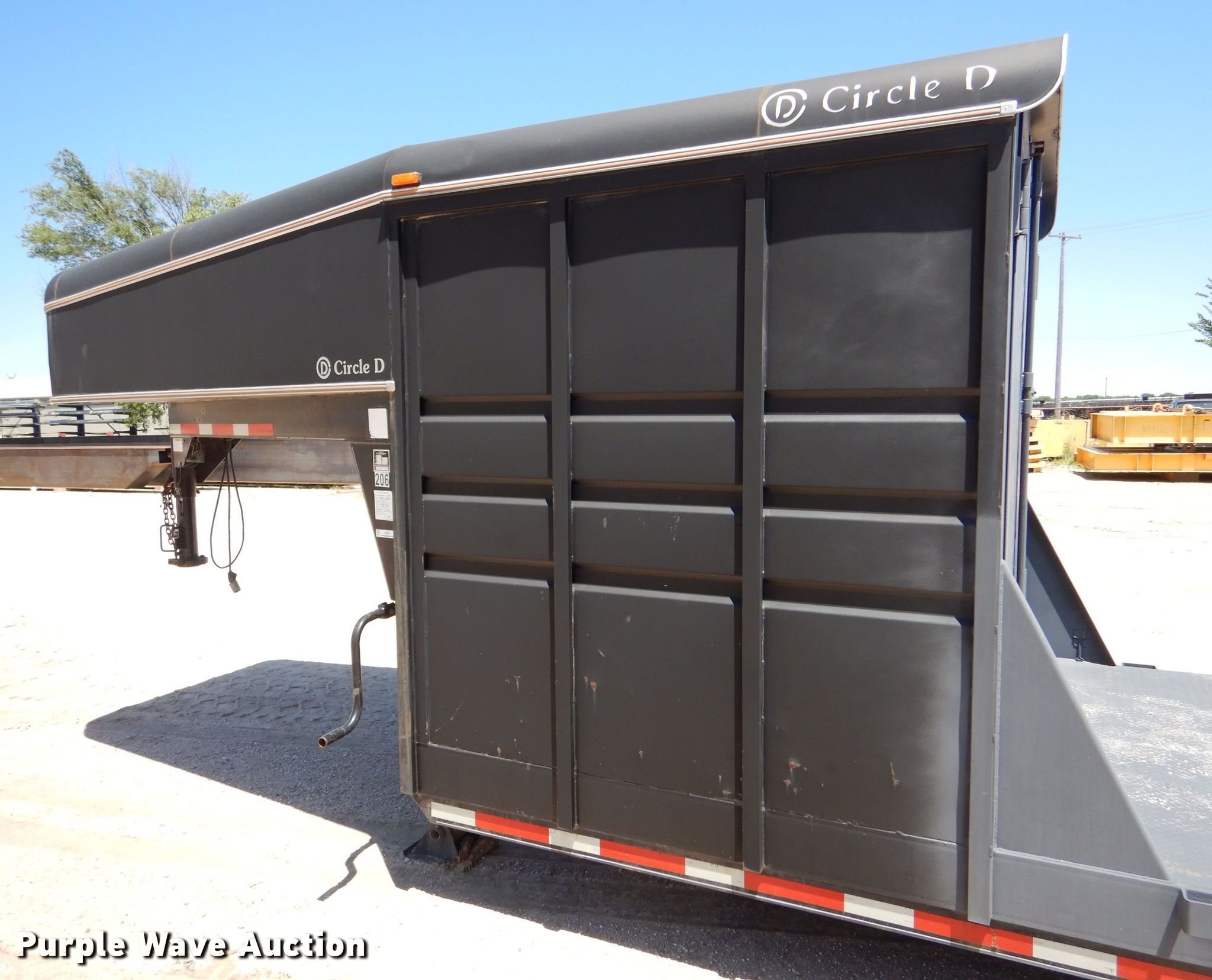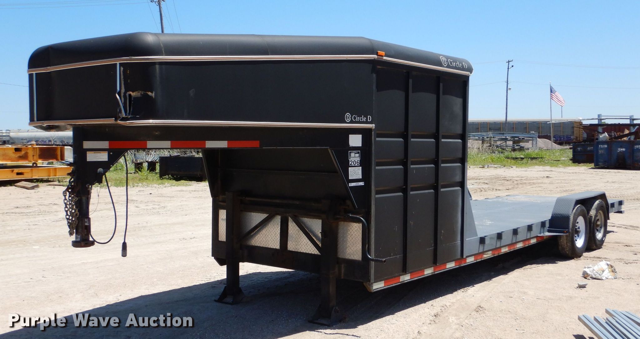 2012 Circle D 26GNMP equipment trailer. VIN: 4D3FG3422C1014554. Dimensions Overall: 33' 6" L x 102" W, Deck: 20' L x 80" W, Deck height: 23", 6' L x 80" W x 80" H enclosed box. Features Deck type: Steel. Chassis Hitch: Gooseneck, Landing gear: Dual, Brakes: Electric, Axles: Tandem, GVWR: 16,000 lbs, GAWR: 8,000 lbs. Tires Steel wheels, Size: 235/80R16. Kansas title. Mackey & Sons, Inc.. Newton, KS 67114