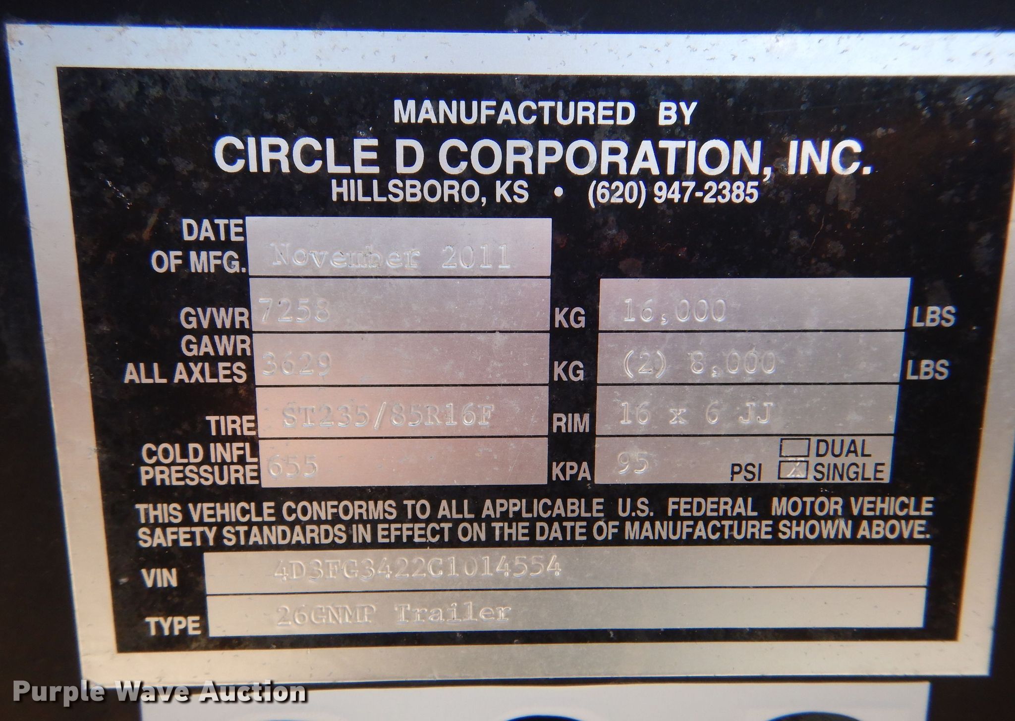 Purple Wave is selling a used Equip. Trailer in Kansas. This item is a 2012 Circle D 26GNMP equipment trailer with the following: VIN: 4D3FG3422C1014554