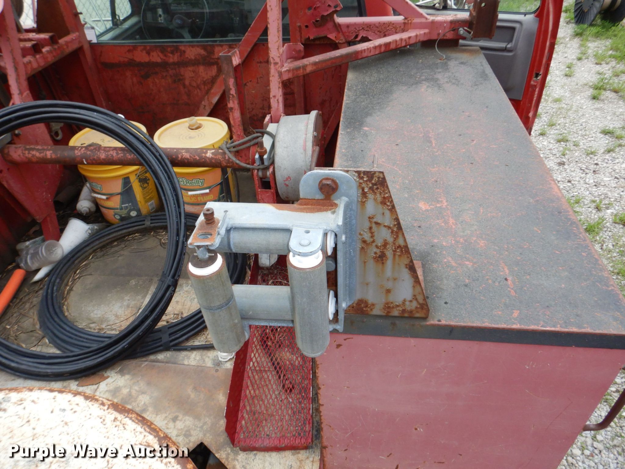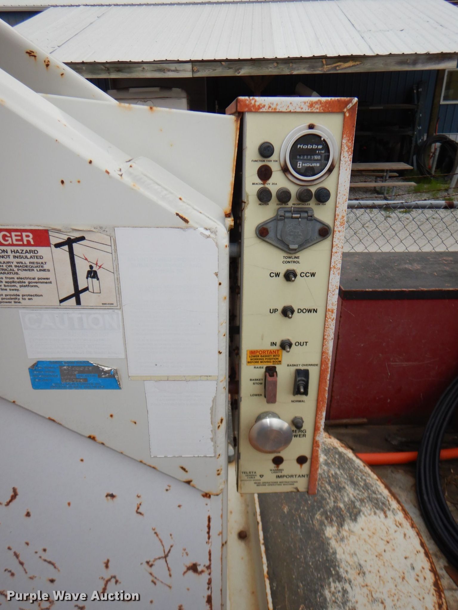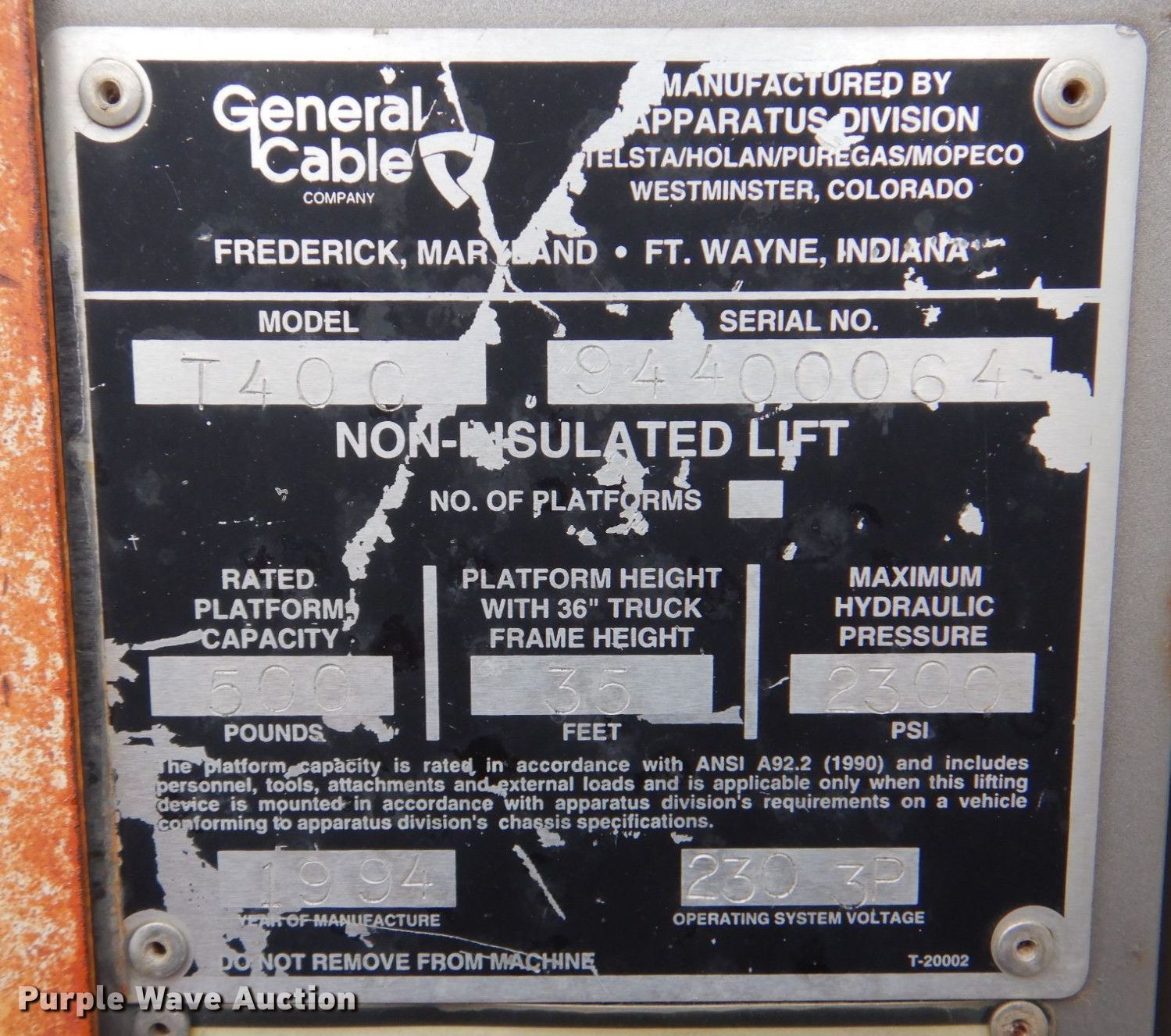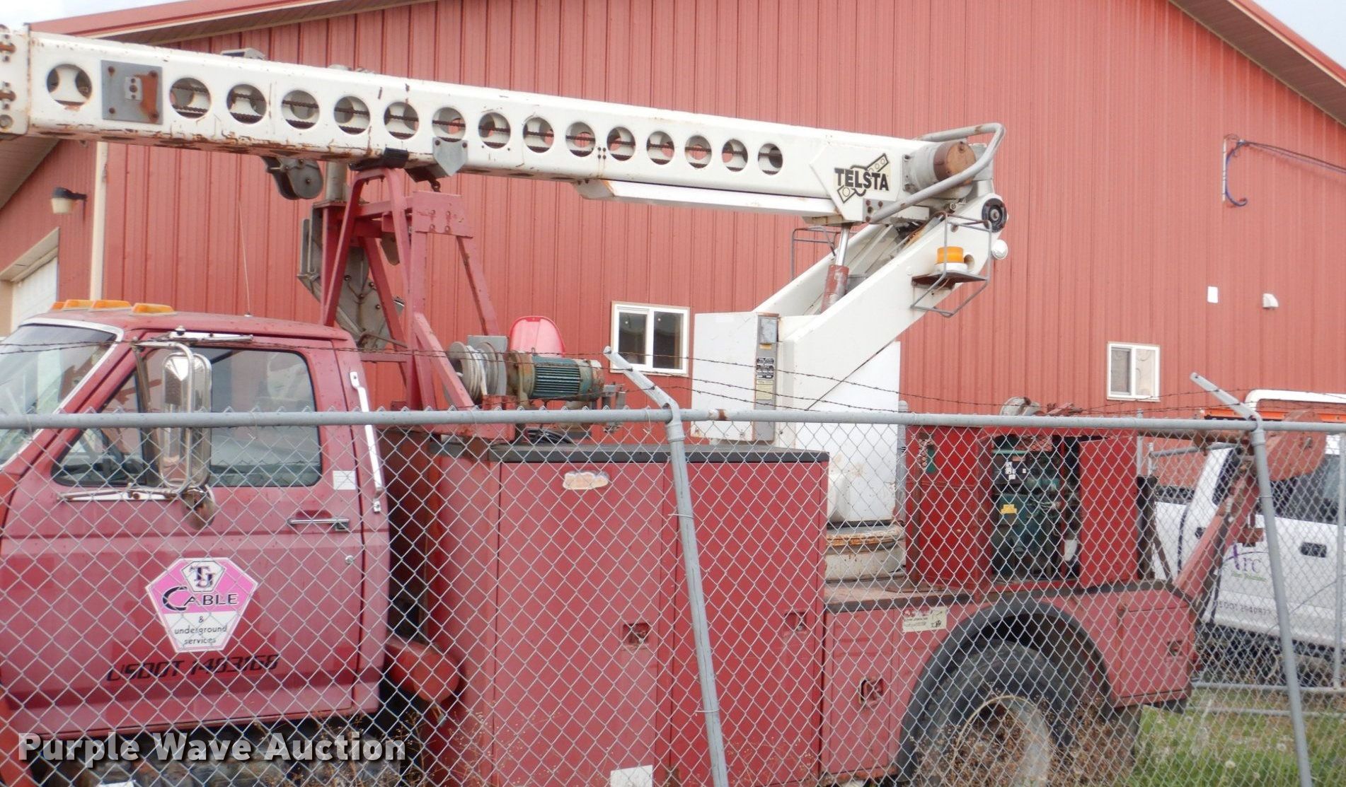 1995 Ford F800 bucket truck. Miles: 90,072 on odometer, VIN: 1FDPF80C6SVA06019. Engine Cummins B Series, Displacement: 5.9L, Cylinders: 6, Fuel type: Diesel. Transmission Manual, Speed: 5, plus 2. Chassis Axles: Single, Suspension: Spring, Brakes: Air, GVWR: 33,000 lbs, Wheelbase: 179". Interior Heat, Auxiliary controls, Brake controller. Features Bed 12' 6" L x 96" W, Engine Cylinders: 3, Fuel: Diesel, Hours: 4,211, Boom 1994 Telsta T40C, Serial: 94400064, Maximum lift capacity: 500 lbs, Maximum lift height: 35', Boom type: Telescopic, Man basket, Boom controls Ground, Platform/ basket, Cable reel Width: 58". Tires Size: 11R22.5. Notes Non-operational unit. Nebraska title. TJ Cable. 201 E 35th Ave. Bellevue, NE 68005