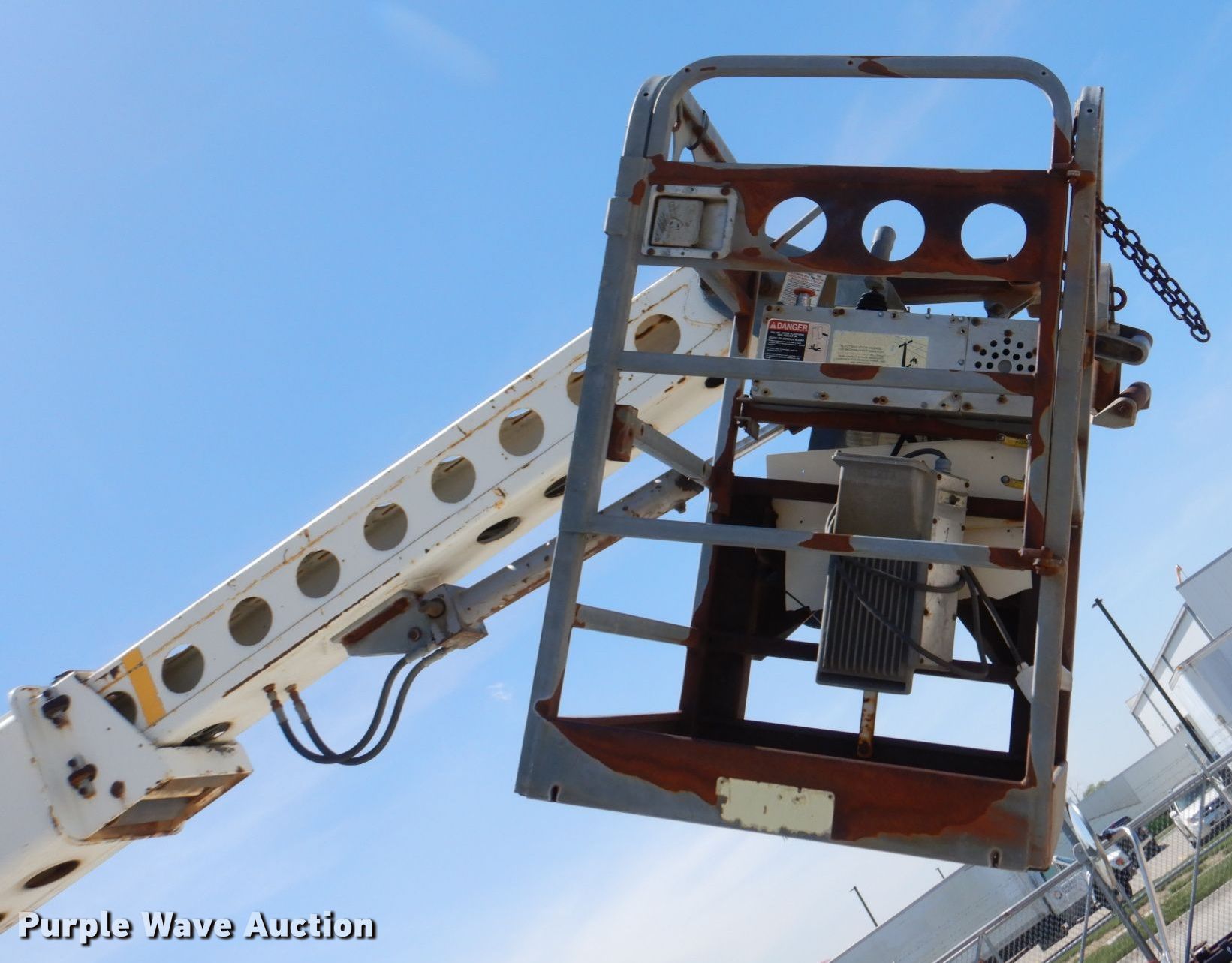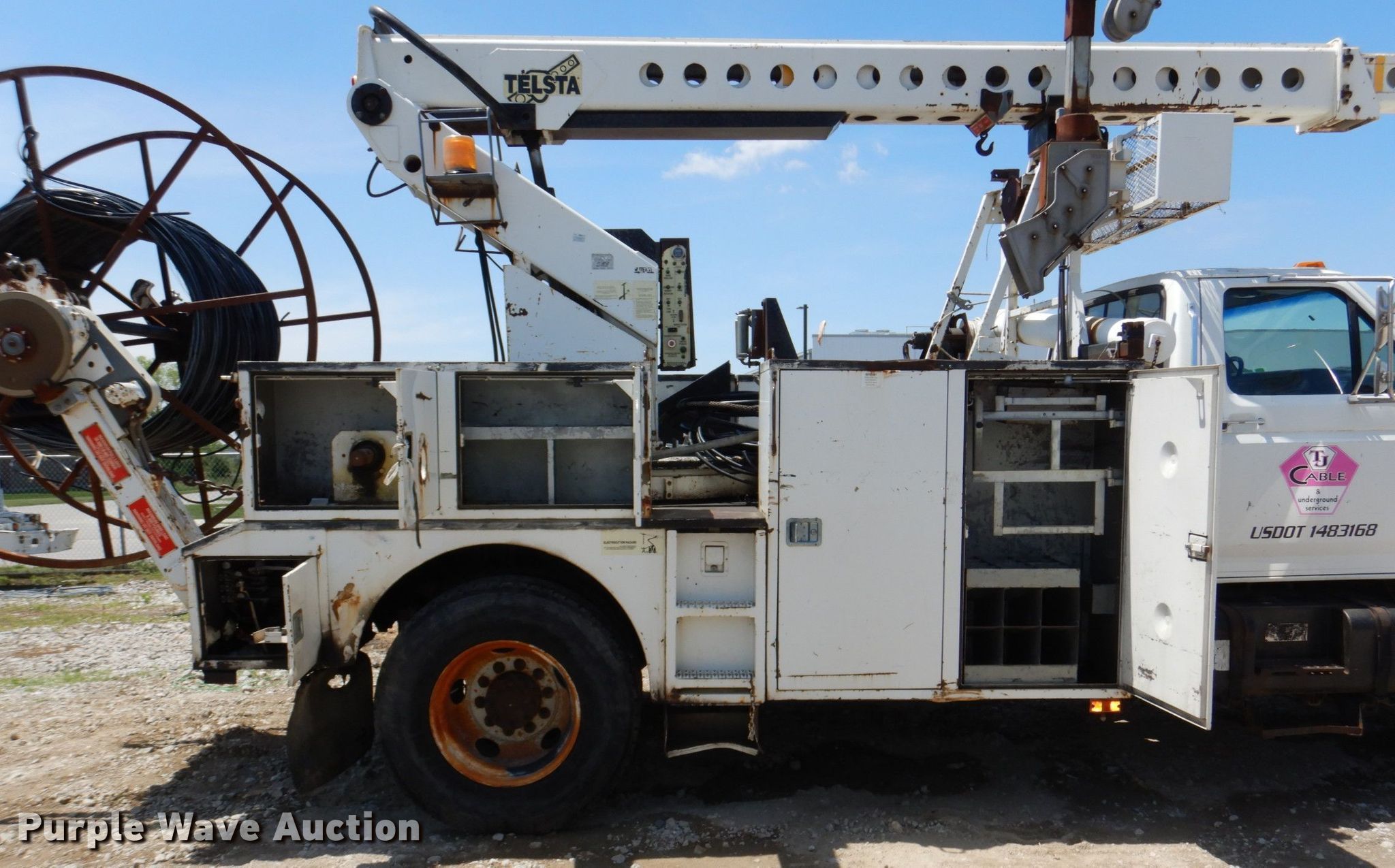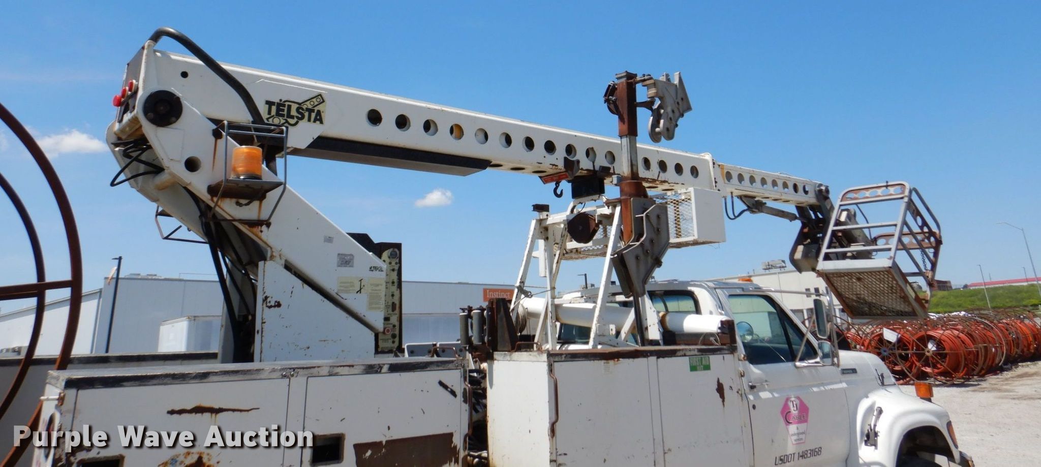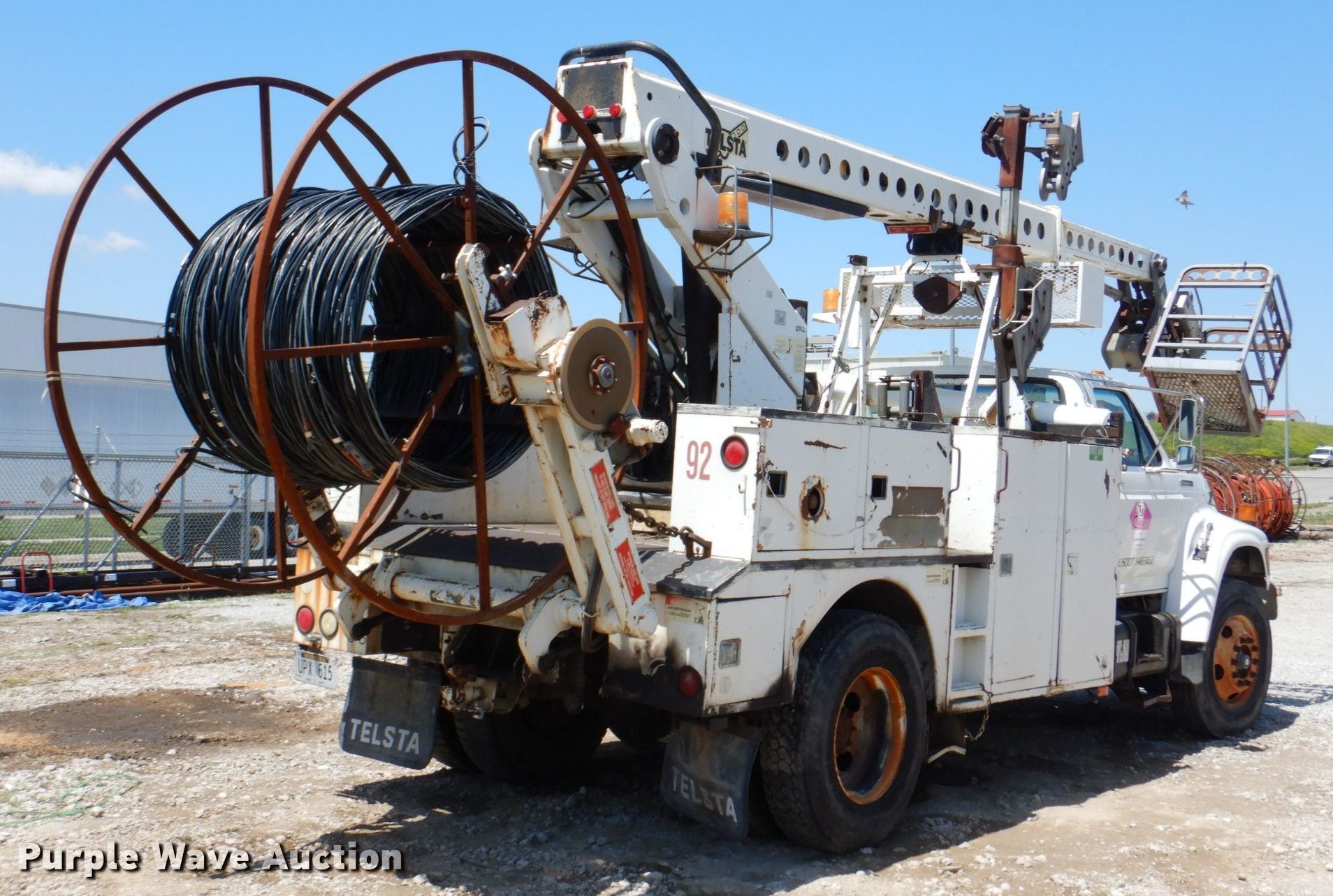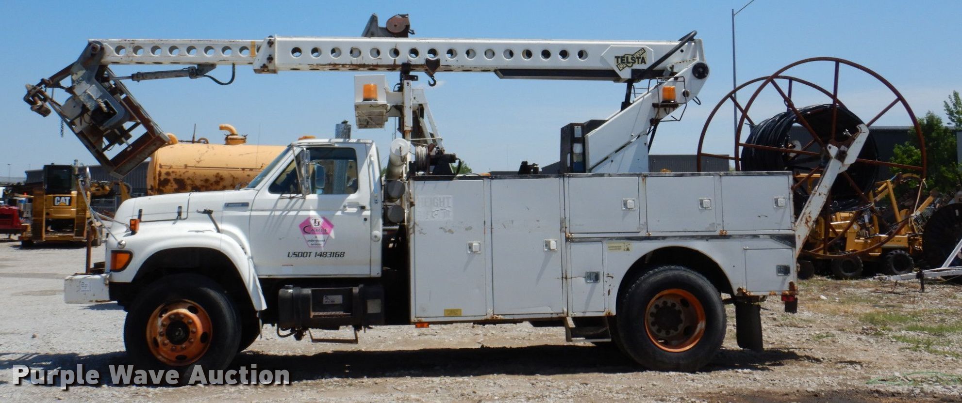 1996 Ford F800 bucket truck. Miles: 62,741 on odometer, Hours: 9,074 on meter, VIN: 1FDXF80E9TVA17499. Engine Displacement: 8.3L, Cylinders: 6, Fuel type: Diesel. Transmission Automatic. Chassis Axles: Single, Suspension: Spring, Brakes: Air, GVWR: 33,000 lbs, Wheelbase: 181". Interior Heat, Auxiliary controls, Brake controller. Features Bed 12' 3" L x 96" W, Boom Telsta T40D, Boom length: 40', Maximum lift capacity: 500 lbs, Boom type: Telescopic, Man basket, Boom controls Ground, Platform/ basket, Reel Width: 48". Tires Size: 11R22.5. Notes Non-operational unit. Nebraska title. TJ Cable. 325 SW 31st St. Lincoln, NE 68522