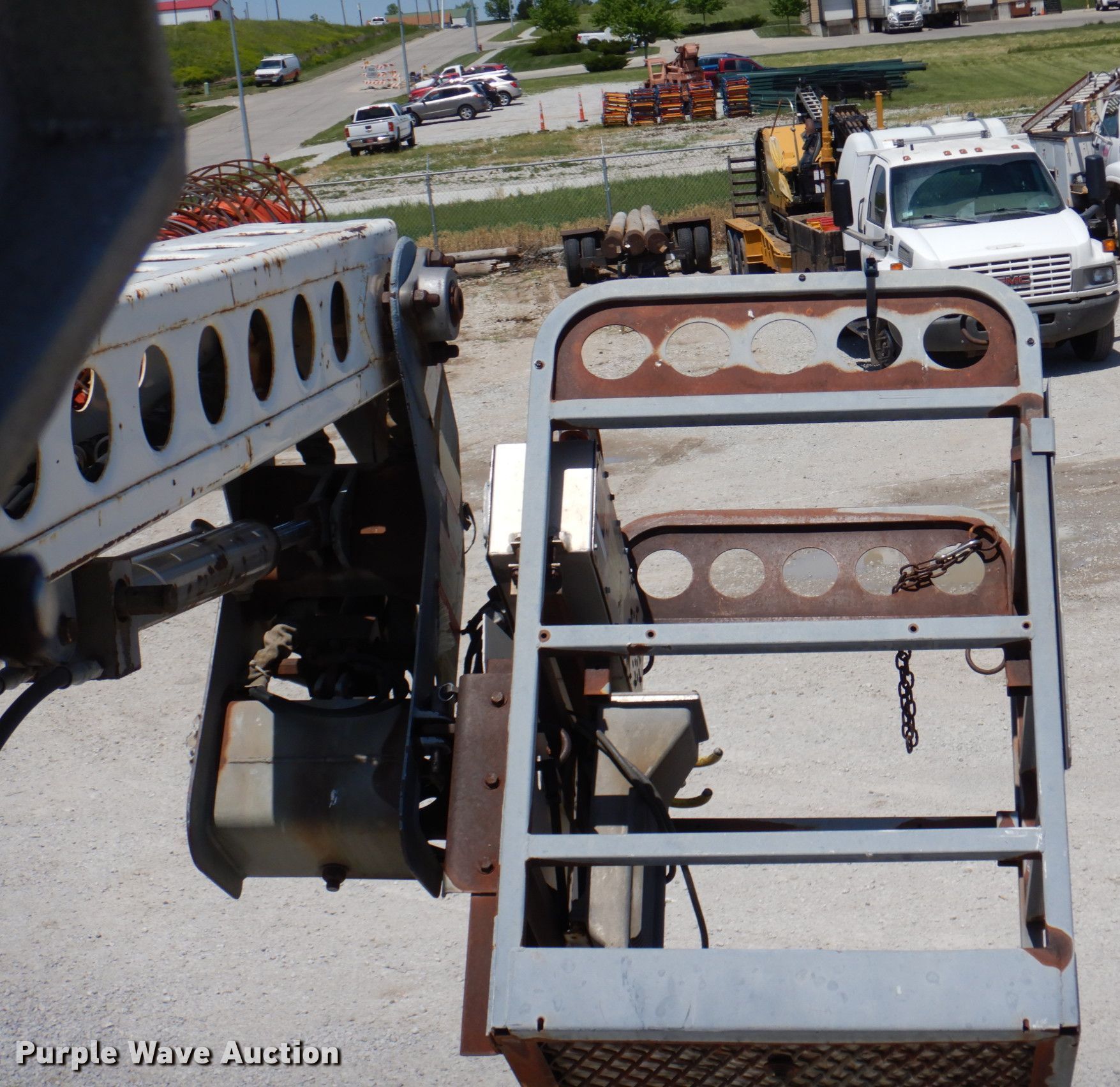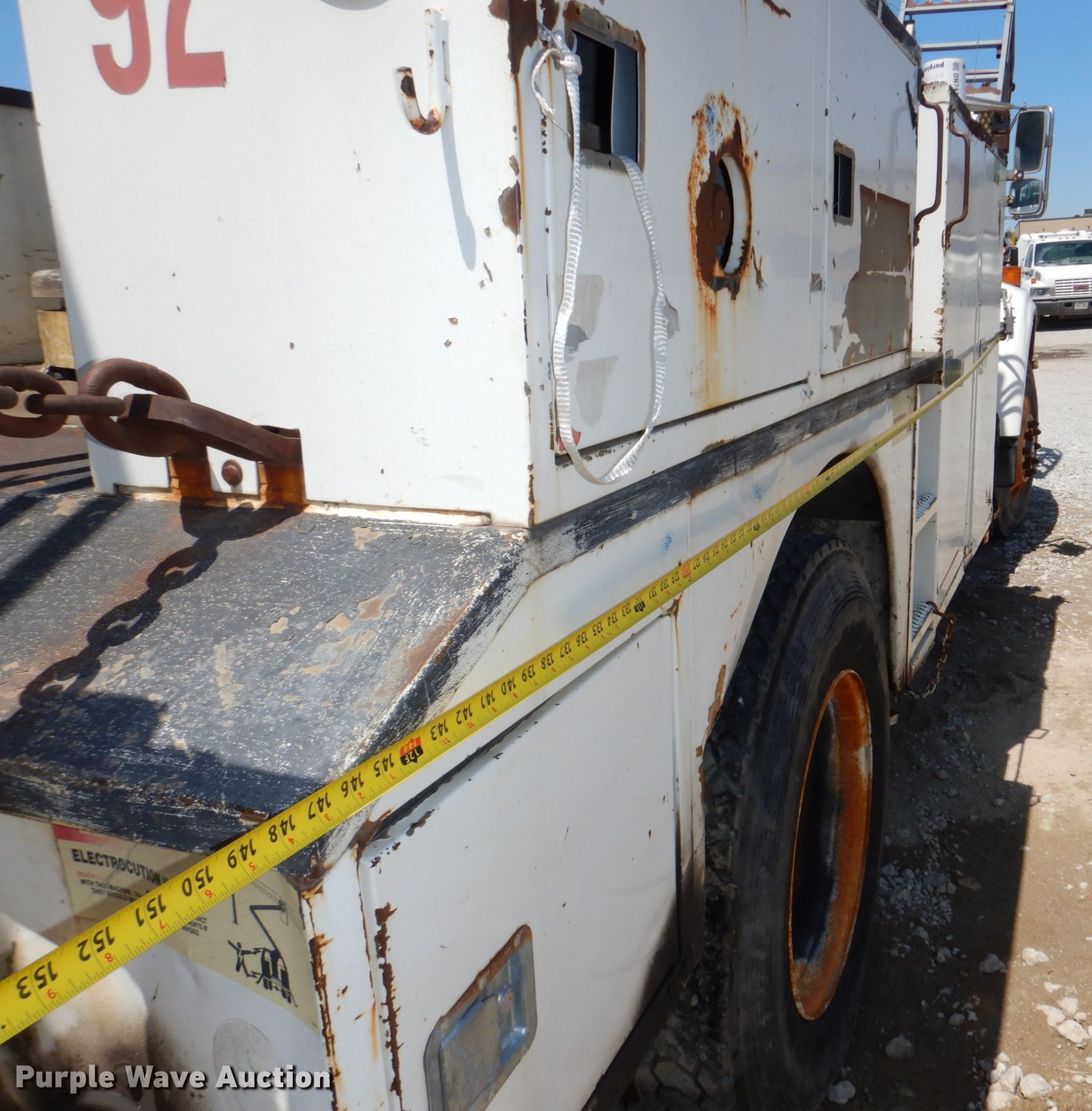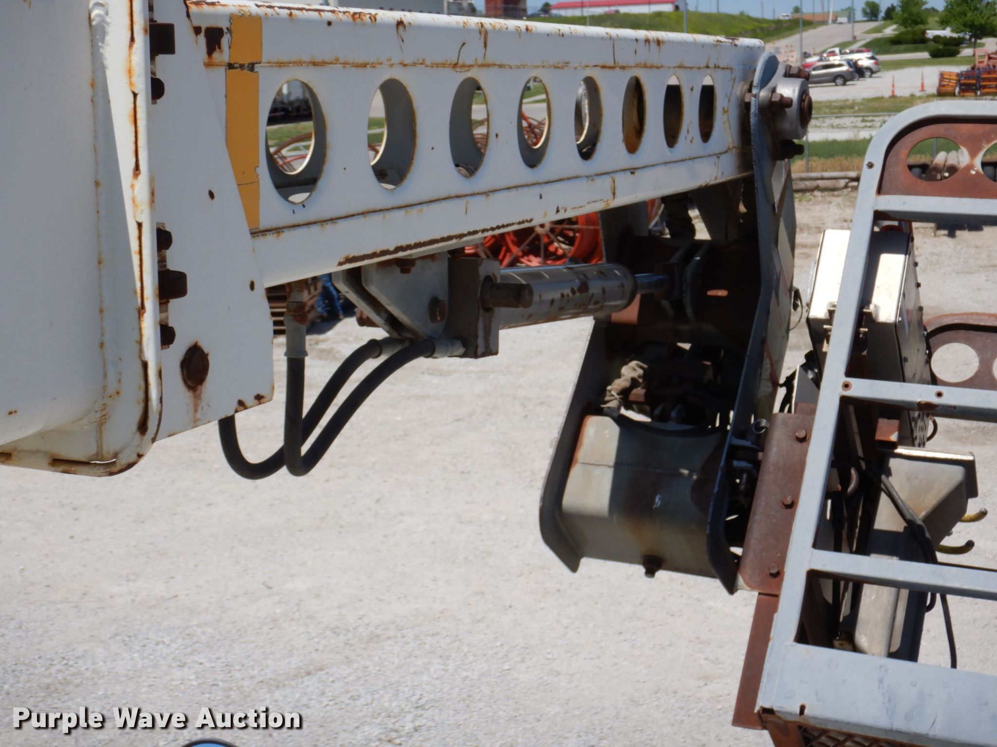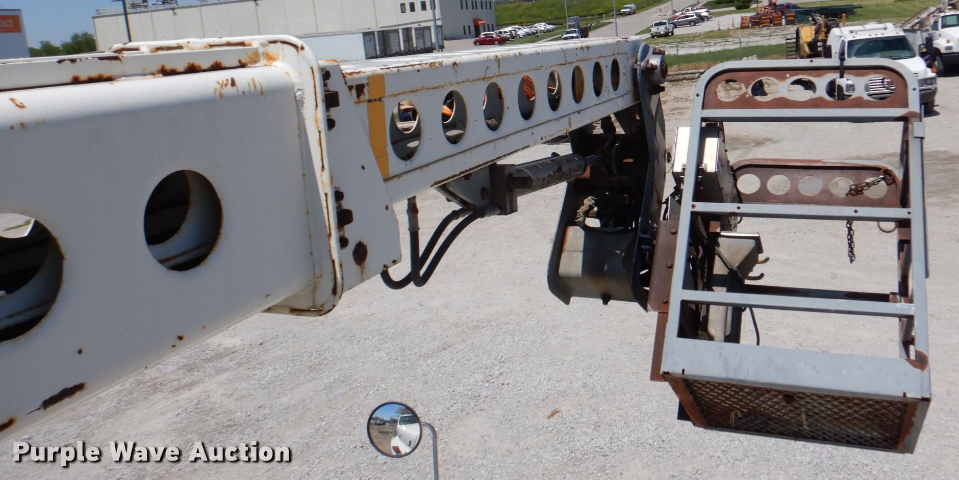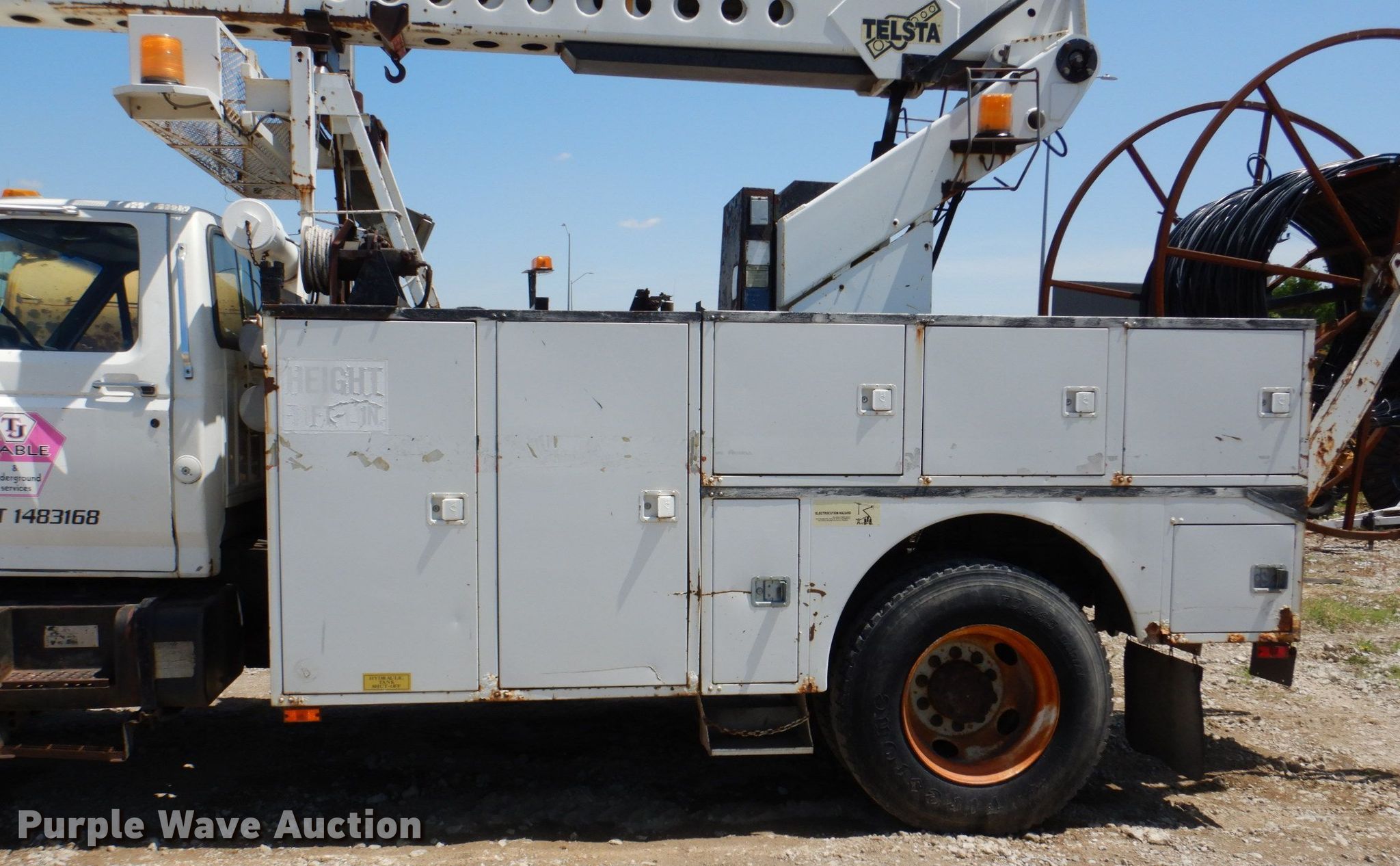 1996 Ford F800 bucket truck. Miles: 62,741 on odometer, Hours: 9,074 on meter, VIN: 1FDXF80E9TVA17499. Engine Displacement: 8.3L, Cylinders: 6, Fuel type: Diesel. Transmission Automatic. Chassis Axles: Single, Suspension: Spring, Brakes: Air, GVWR: 33,000 lbs, Wheelbase: 181". Interior Heat, Auxiliary controls, Brake controller. Features Bed 12' 3" L x 96" W, Boom Telsta T40D, Boom length: 40', Maximum lift capacity: 500 lbs, Boom type: Telescopic, Man basket, Boom controls Ground, Platform/ basket, Reel Width: 48". Tires Size: 11R22.5. Notes Non-operational unit. Nebraska title. TJ Cable. 325 SW 31st St. Lincoln, NE 68522