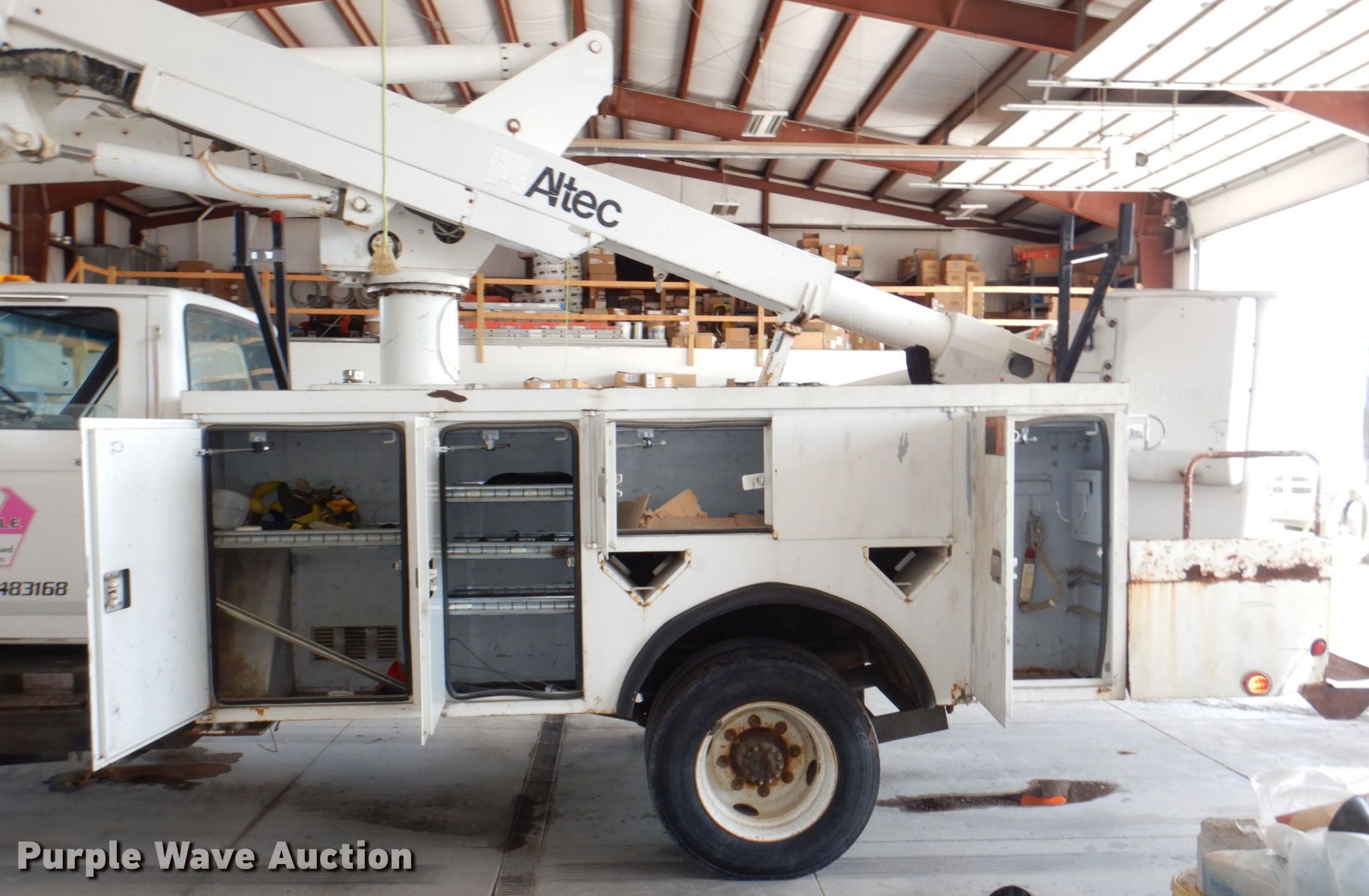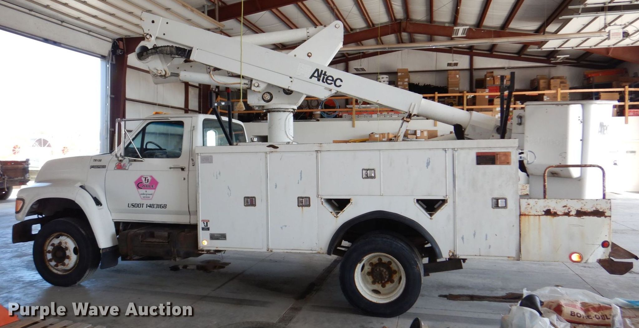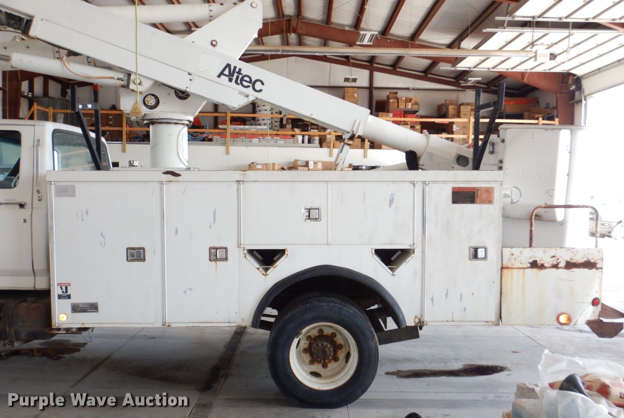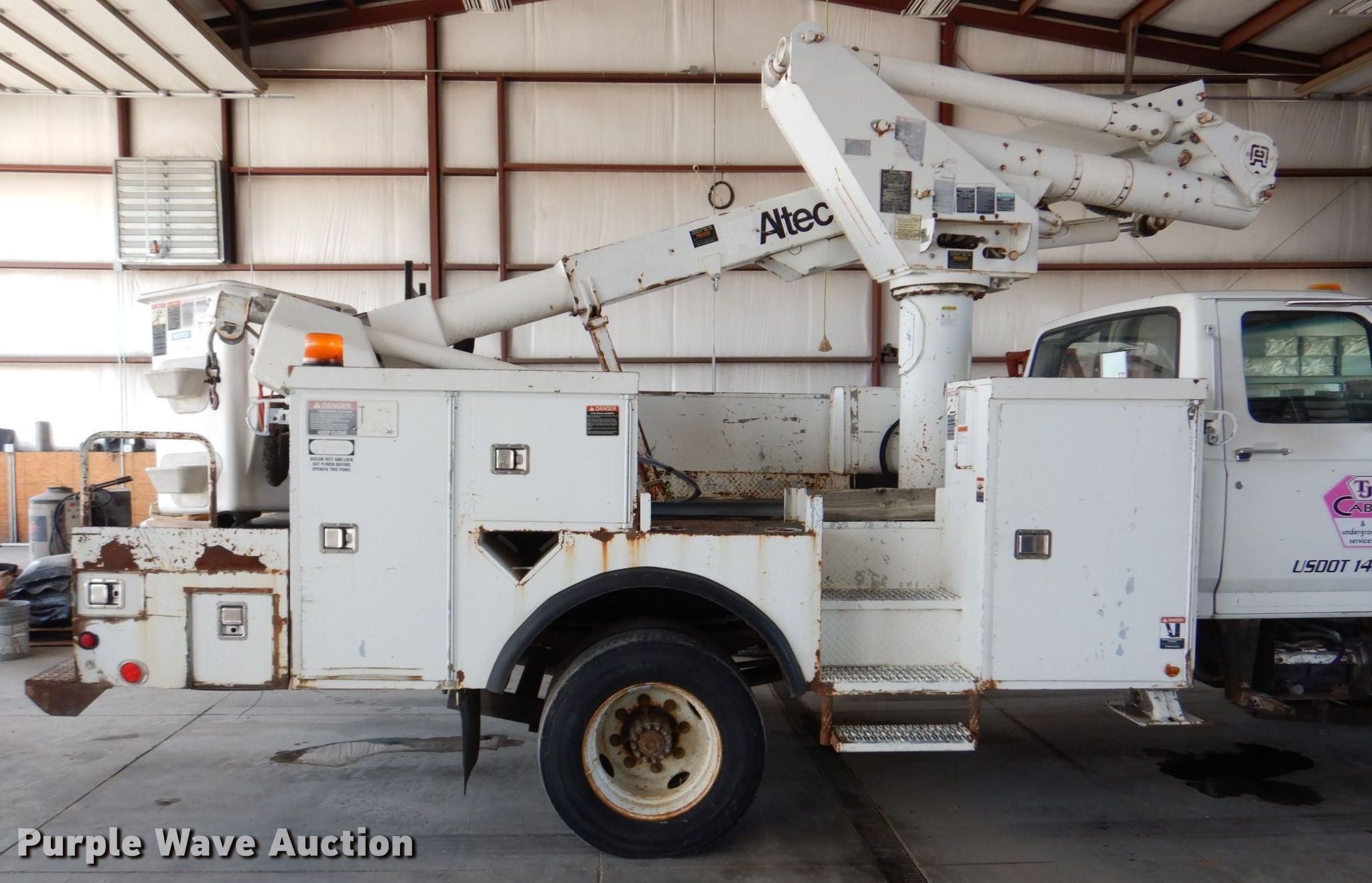 1998 Ford F800 bucket truck. Miles: 116,325 on odometer, VIN: 1FDNF82C0WVA21223. Engine Cummins, Displacement: 5.9L, Cylinders: 6, Fuel type: Diesel. Transmission Automatic. Chassis Axles: Single, Suspension: Spring, Brakes: Air, PTO, GVWR: 24,500 lbs, Wheelbase: 207". Interior AC, Heat. Features Bed Altec, 13' 6" L x 93" W, Boom Altec TA37M, Serial: 0698CH0248, Maximum lift capacity: 350 lbs, Maximum lift height: 37', Boom type: Articulating, Man basket. Tires Size: 265/70R19.5. Nebraska title. TJ Cable. 325 SW 31st St. Lincoln, NE 68522