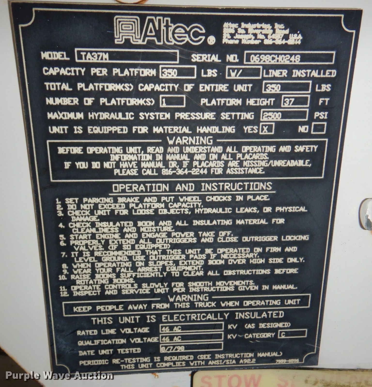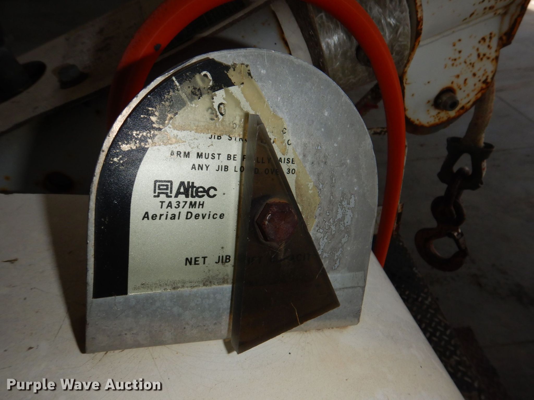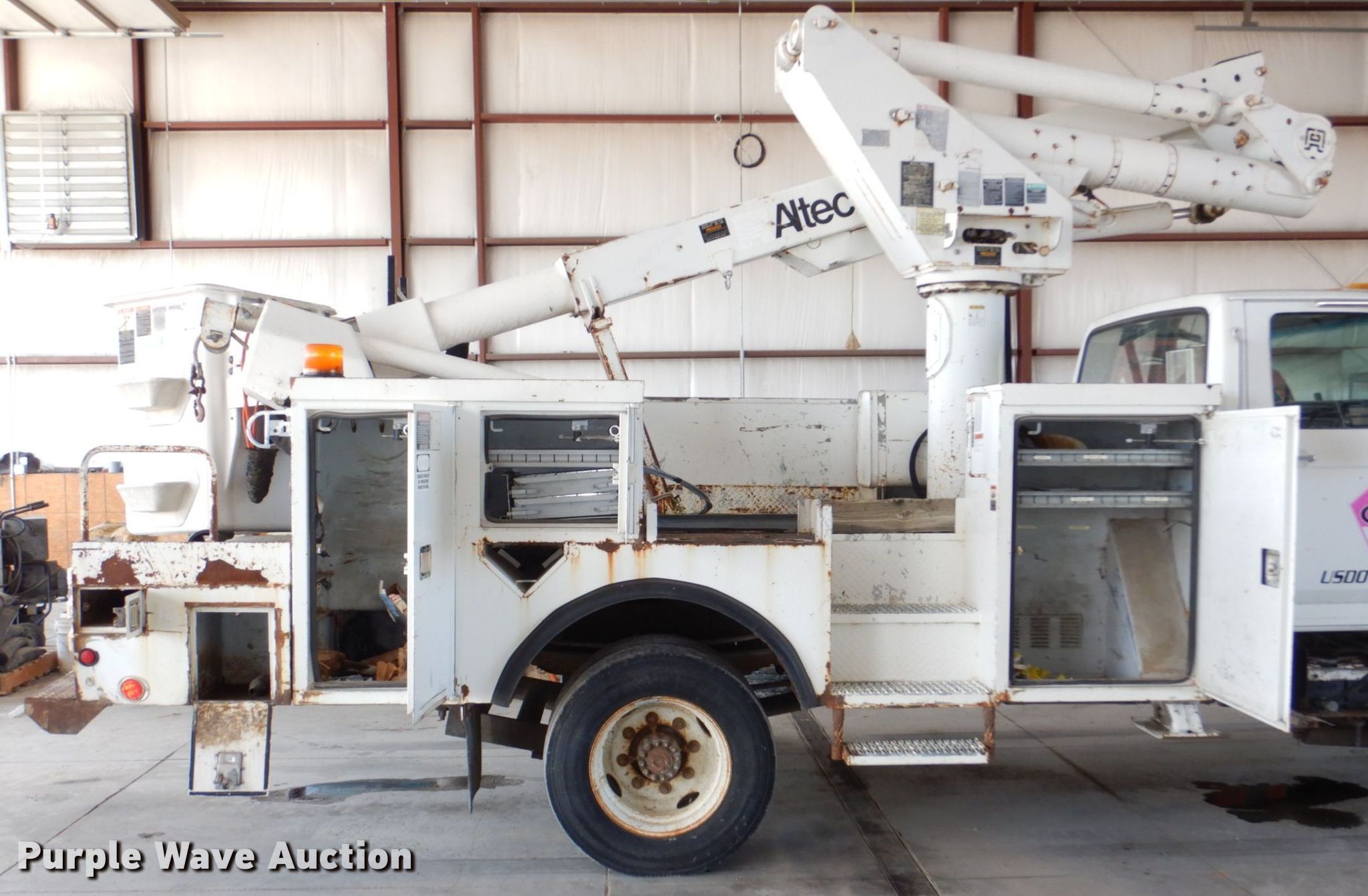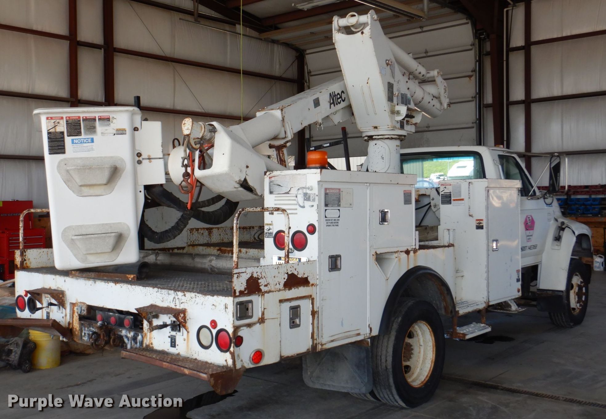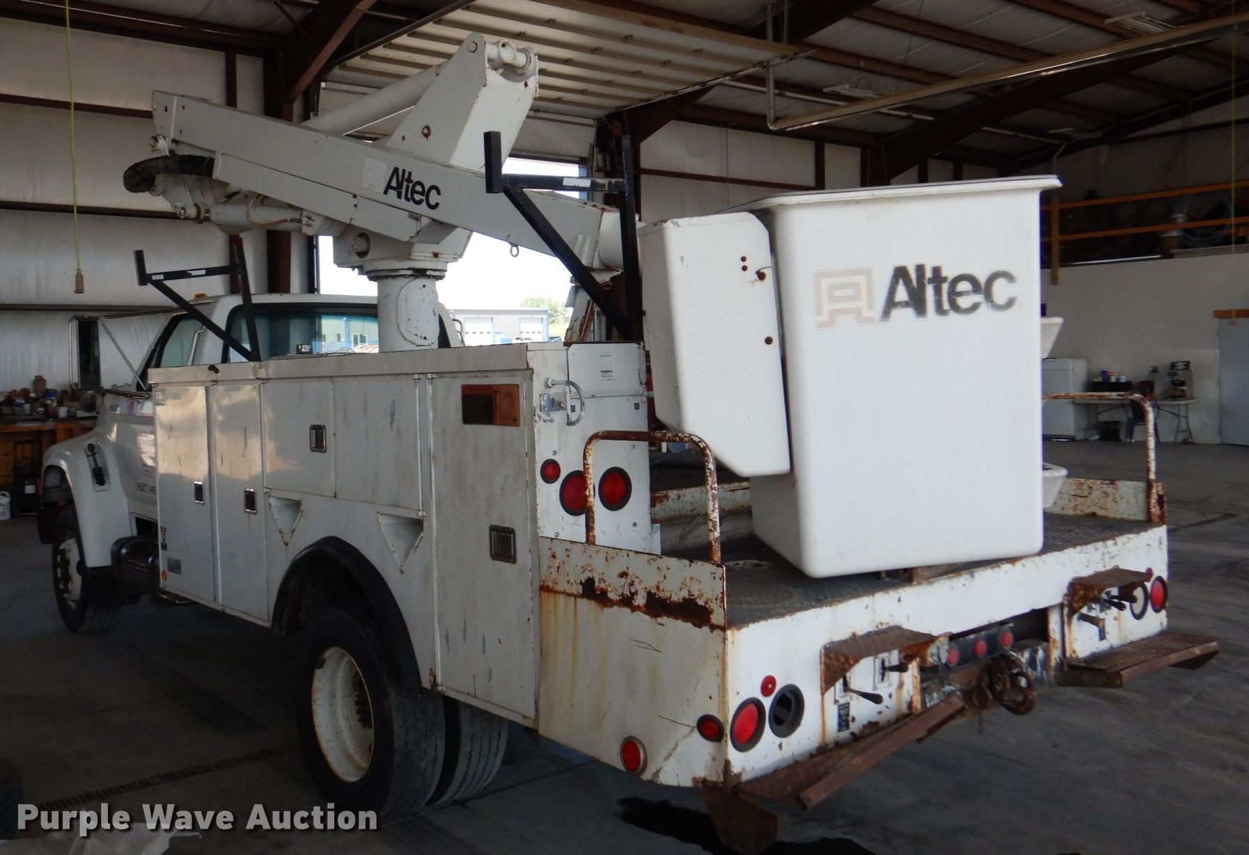 1998 Ford F800 bucket truck. Miles: 116,325 on odometer, VIN: 1FDNF82C0WVA21223. Engine Cummins, Displacement: 5.9L, Cylinders: 6, Fuel type: Diesel. Transmission Automatic. Chassis Axles: Single, Suspension: Spring, Brakes: Air, PTO, GVWR: 24,500 lbs, Wheelbase: 207". Interior AC, Heat. Features Bed Altec, 13' 6" L x 93" W, Boom Altec TA37M, Serial: 0698CH0248, Maximum lift capacity: 350 lbs, Maximum lift height: 37', Boom type: Articulating, Man basket. Tires Size: 265/70R19.5. Nebraska title. TJ Cable. 325 SW 31st St. Lincoln, NE 68522