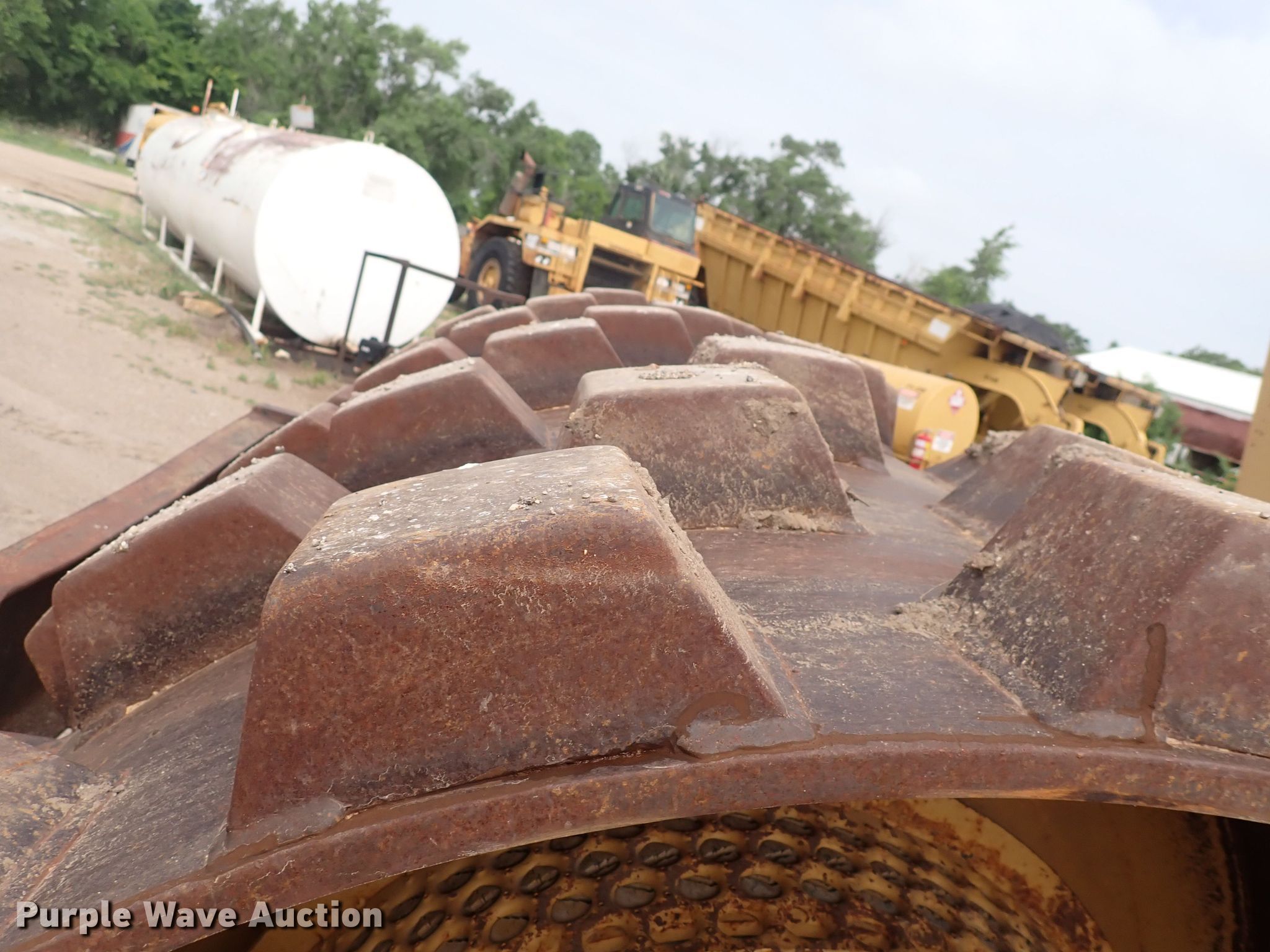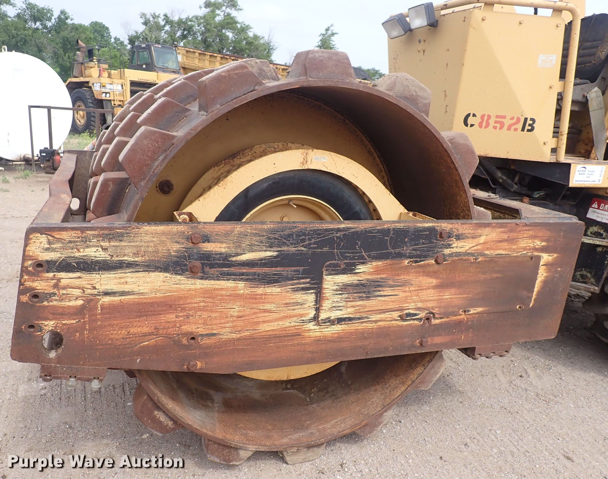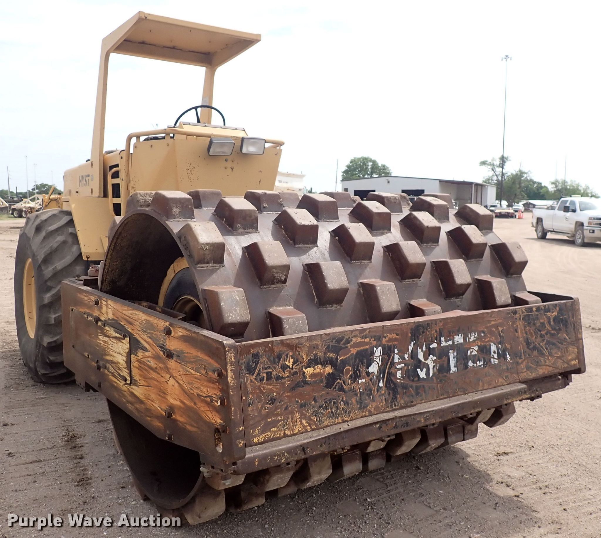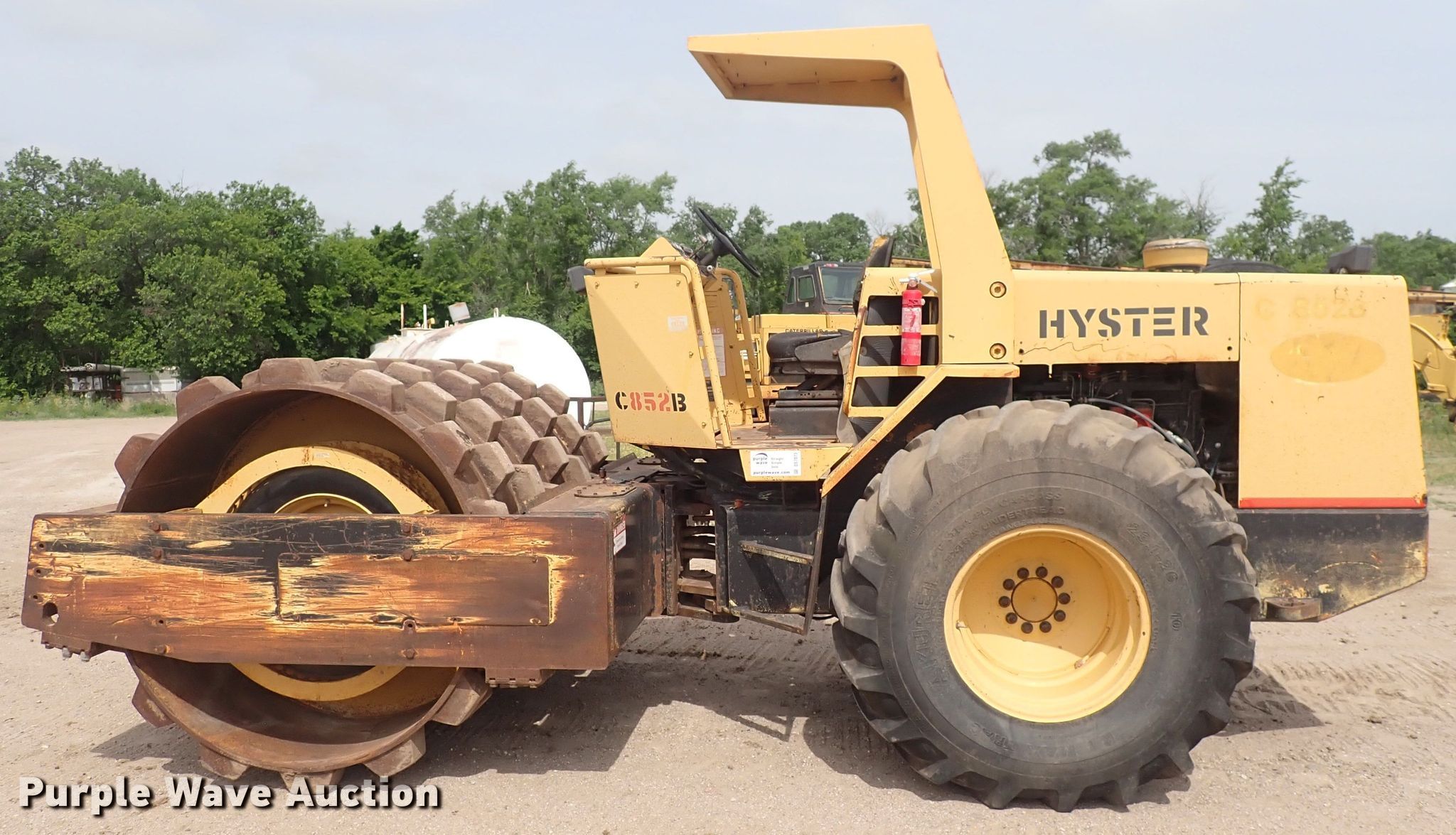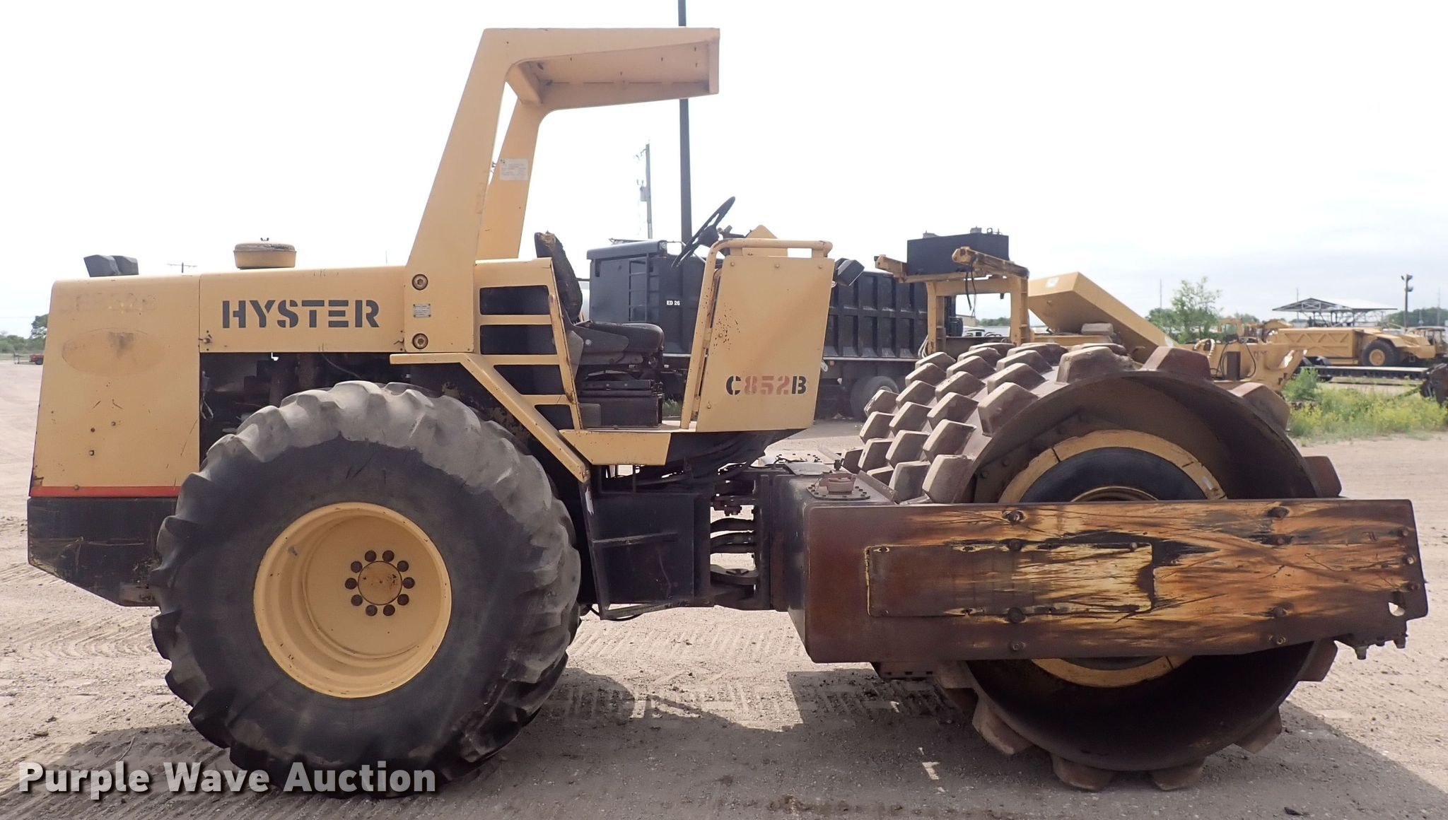 Hyster C852B single drum vibratory roller. Hours: 8,587 on meter, Serial: B188C1771N. Engine Cylinders: 6, Fuel type: Diesel. Transmission Hydrostatic. Features Drum: Padfoot, Vibratory system: Single, Front drum Width: 82", Diameter: 55". Tires Size: 23.1-26. Notes Vibratory system issues. Bob Bergkamp Construction. 3709 S West St. Wichita, KS 67217