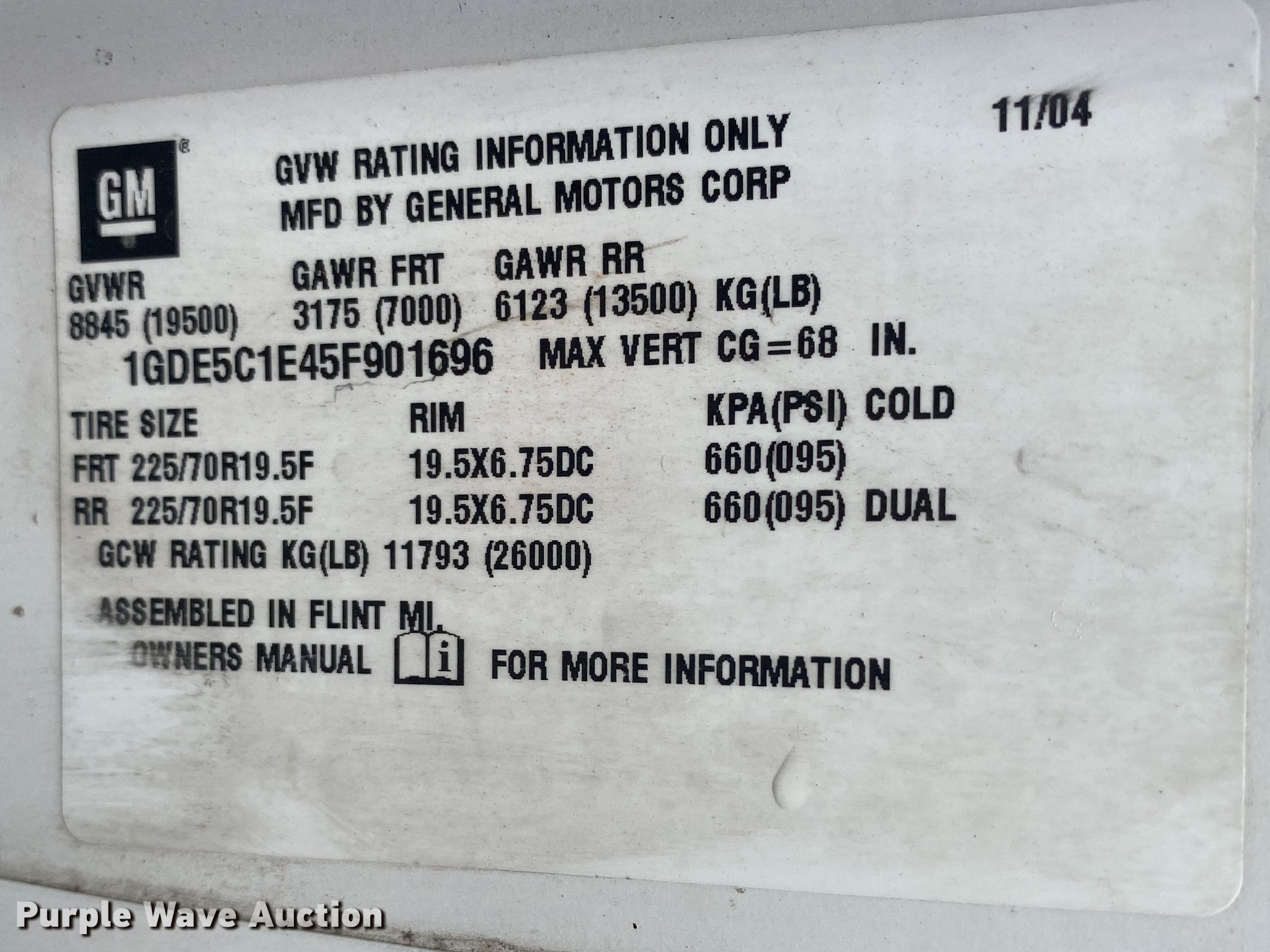 Purple Wave is selling a used Bucket Truck in Oklahoma. This item is a 2005 GMC C5500 bucket truck with the following: Miles: 86,427 on odometer, VIN: 1GDE5C1E45F901696