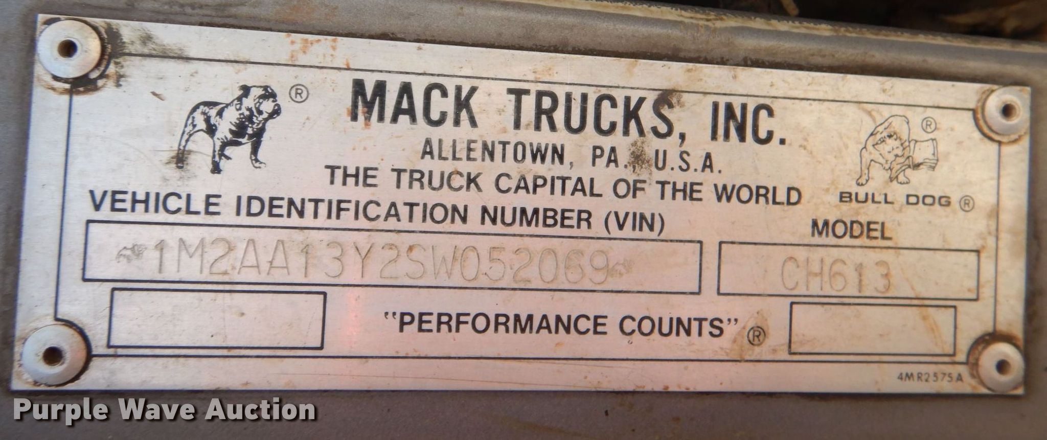 Purple Wave is selling a used Tank Truck or Water Truck in Oklahoma. This item is a 1995 Mack CH613 water truck with the following: Miles: 182,444 on odometer, Hours: 30,170 on meter, VIN: 1M2AA13Y2SW052069, Unit #: 143