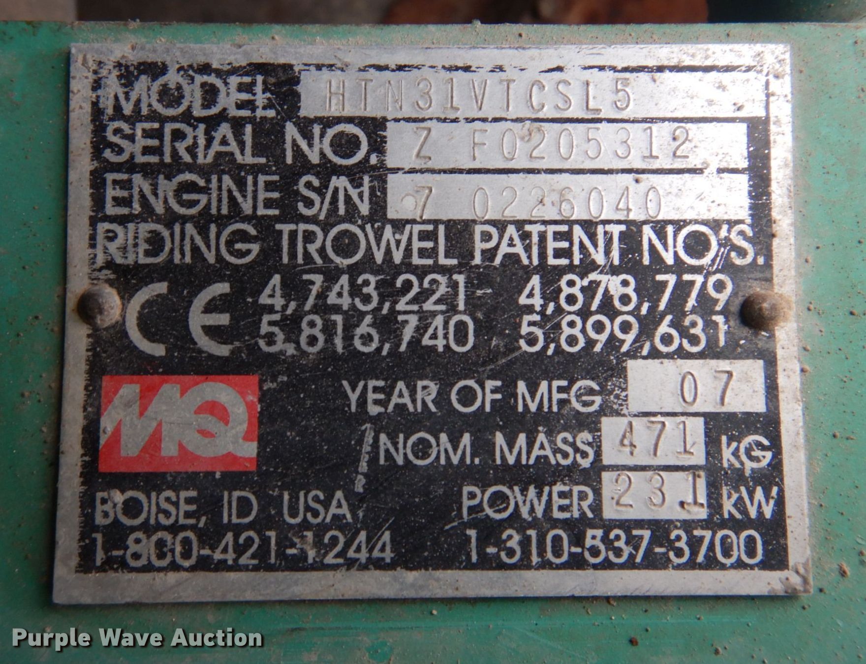 Purple Wave is selling a used Concrete Equip. or Acces. in Illinois. This item is a 2007 Whiteman HTN31VTCSL5 power trowel with the following: Hours: 691 on meter, Serial: ZF0205312, Unit #: 9
