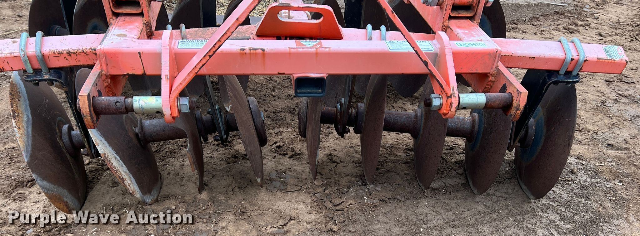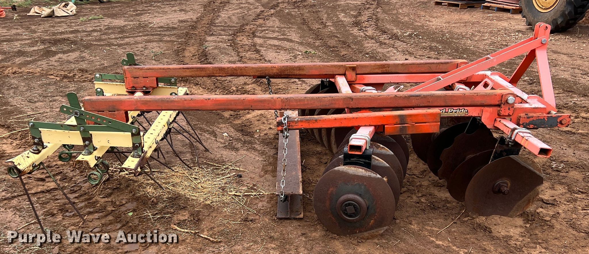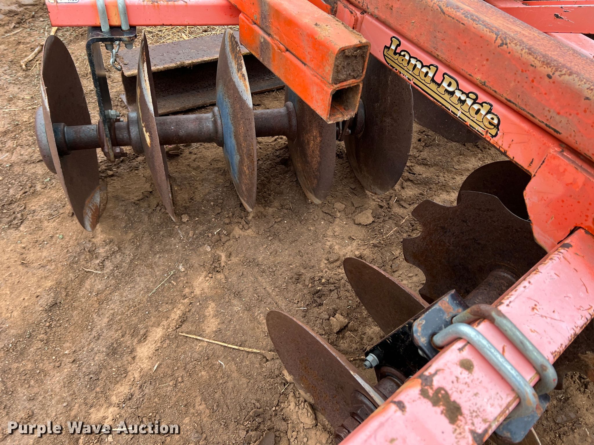 Purple Wave is selling a used Disk in Texas. This item is a Land Pride tandem disk with the following: Front blades, Diameter: 17", Spacing: 8", Rear blades, Diameter: 17", Spacing: 8", Attachments, Tine harrow, Harrow bars: 3, Hitch: Three point