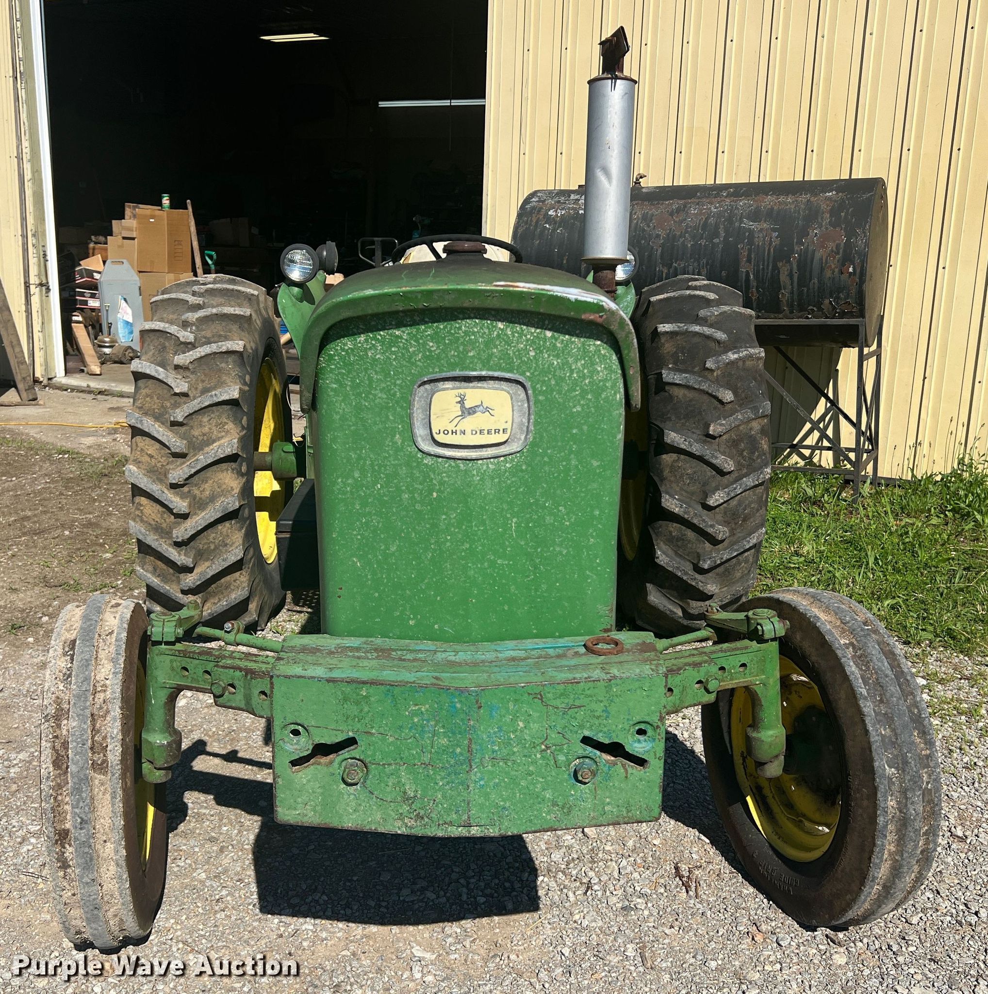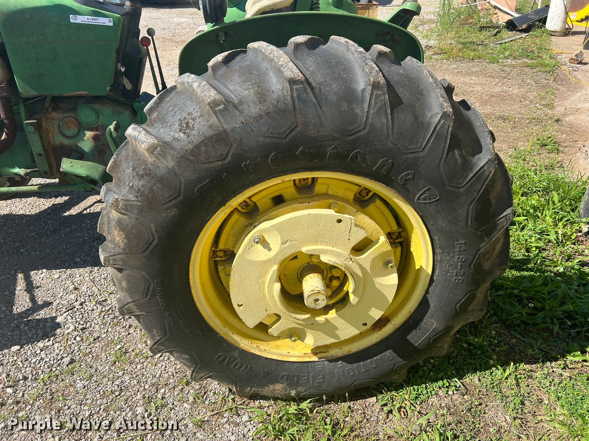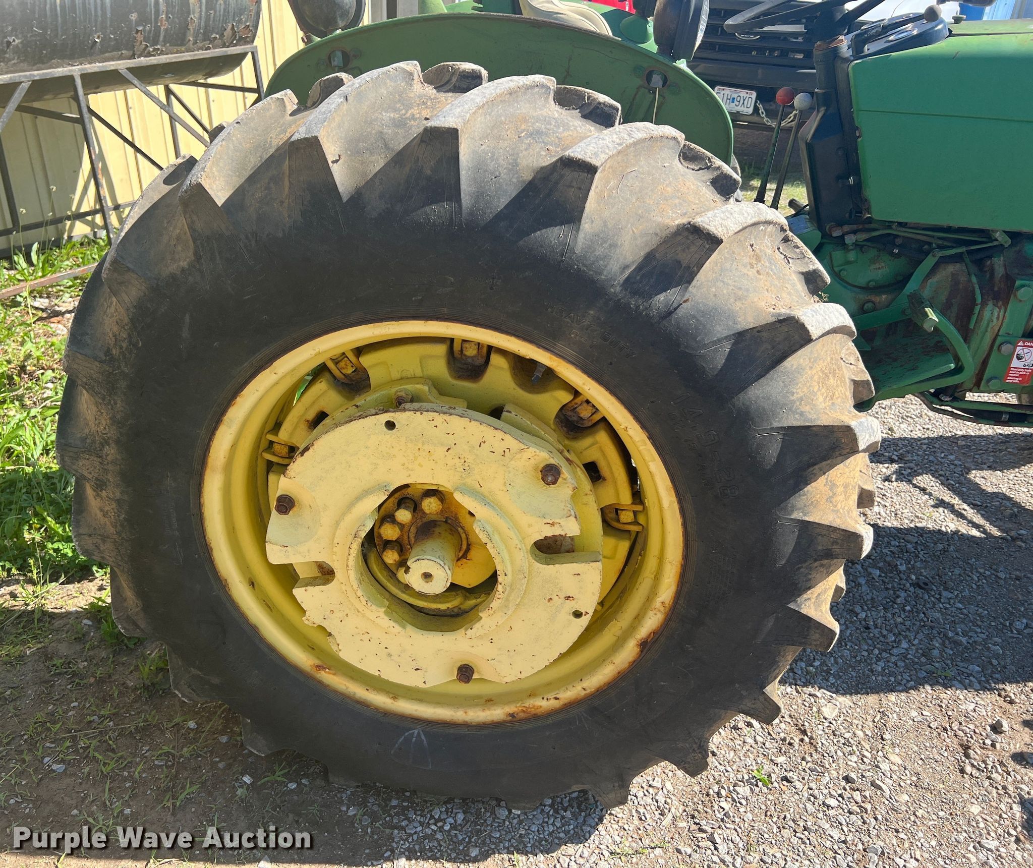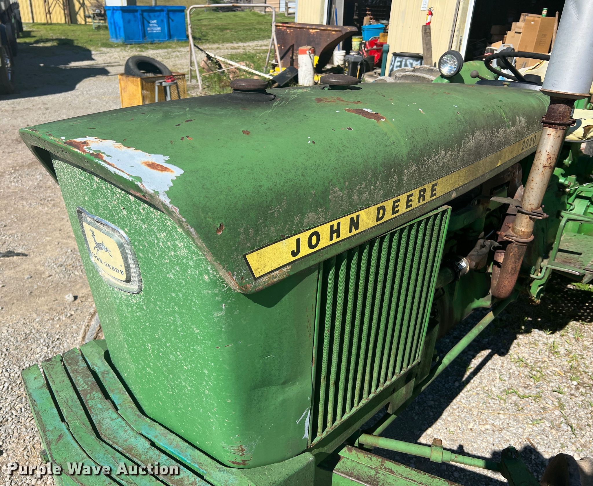 John Deere 2020 tractor. Hours: 2,887 on meter, Serial: 041095T. Engine John Deere M51TR, Serial: 052303T, Cylinders: 4, Fuel type: Gas. Transmission Manual, 8F - 4R. Features PTO: 540, Three point Top link, Hydraulic remote sets Rear: 1, Front weights: 3. Tires Front: 6.00-16 Foam filled, Rear: 14.9-28, Wheel weights: 4. Notes Battery issues, weak. Perryville Stave Company Inc.. Perryville, MO 63775
