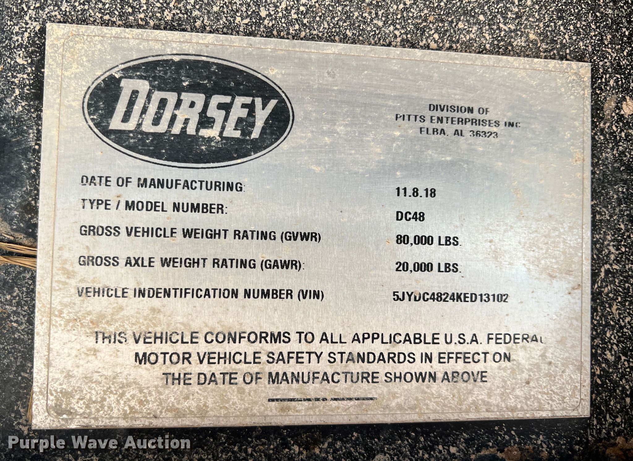 2019 Dorsey DC48 drop deck trailer. VIN: 5JYDC4824KED13102. Dimensions Overall: 52' L x 108" W, Deck: 38' L x 102" W, Top deck length: 10', Front deck extension: 3' L, Rear deck extension: 3' L. Features Deck type: Aluminum. Chassis Landing gear: Dual, Suspension: Air, Brakes: Air, Axles: Spread, GVWR: 80,000 lbs, GAWR: 20,000 lbs. Tires Steel wheels, Size: 255/70R22.5. Texas title. Title has a lien that will be released following the close of the auction. Title distribution may be delayed up to 30 days from verification of funds. Penner Farms. 12501 Bell Street. Amarillo, TX 79118