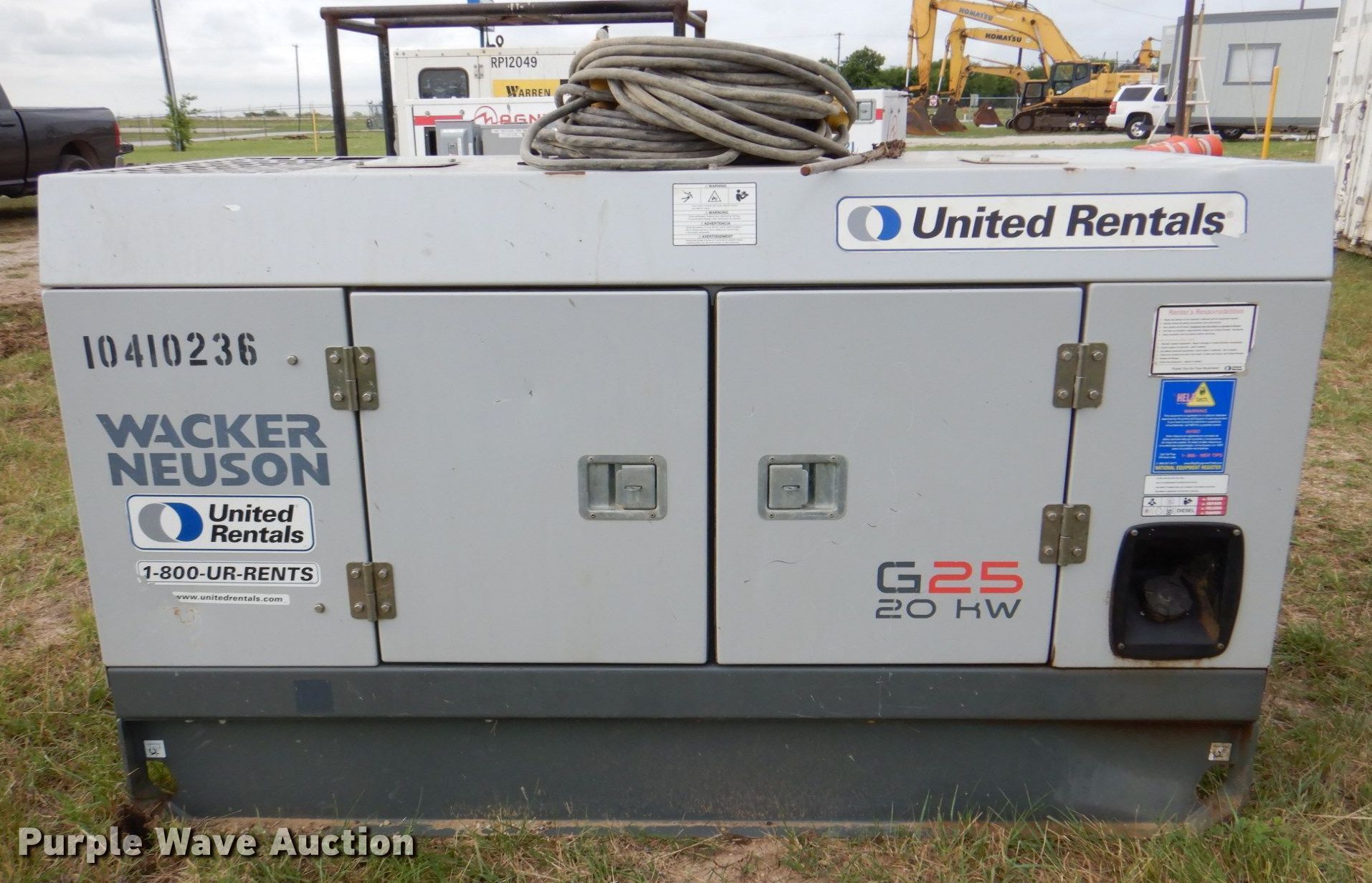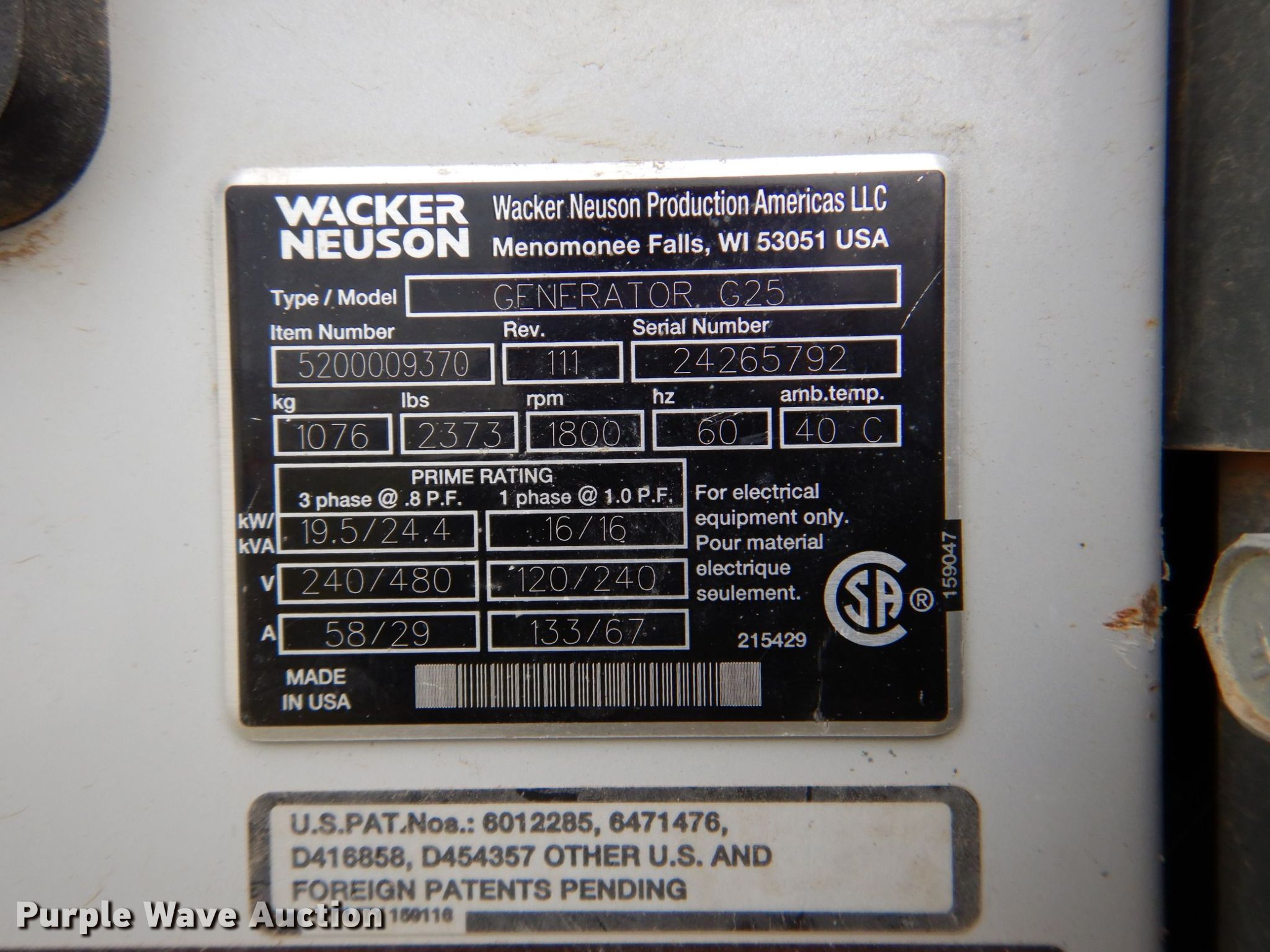 Purple Wave is selling a used Generator Set in Texas. This item is a Wacker Neuson G25 generator with the following: Hours: 6,158 on meter, Serial: 24265792