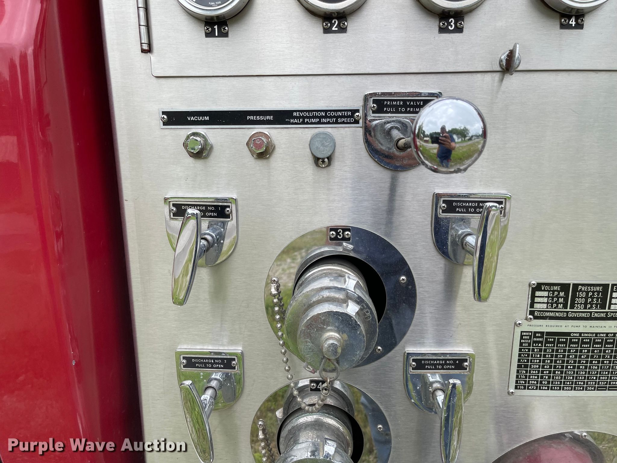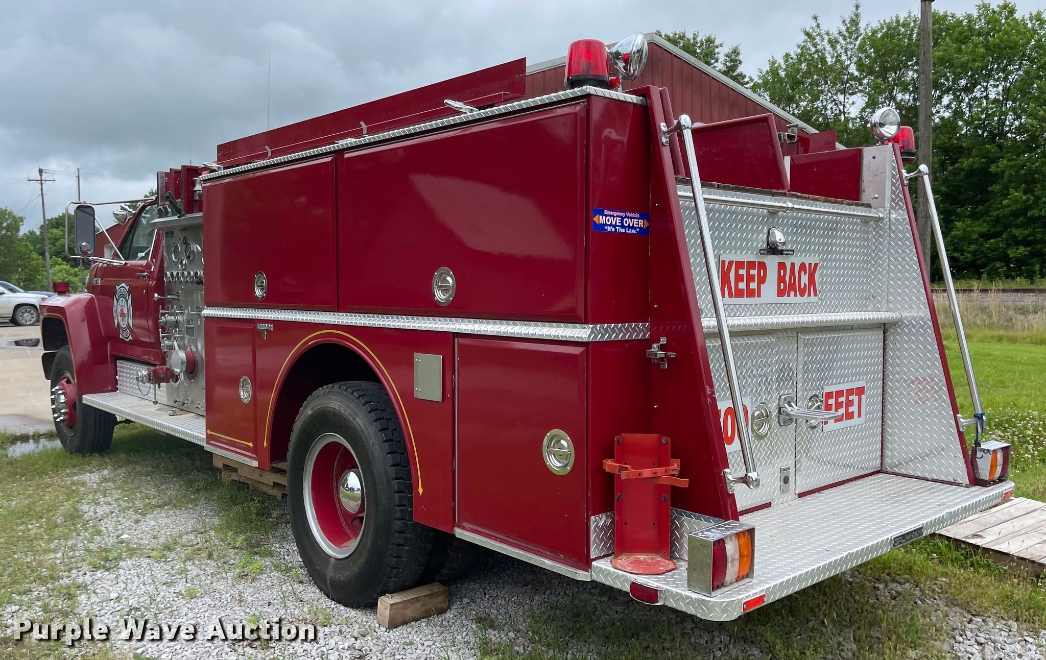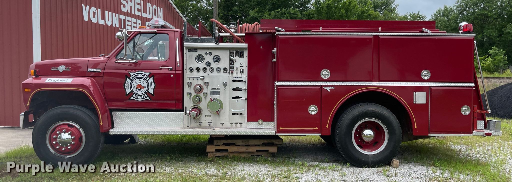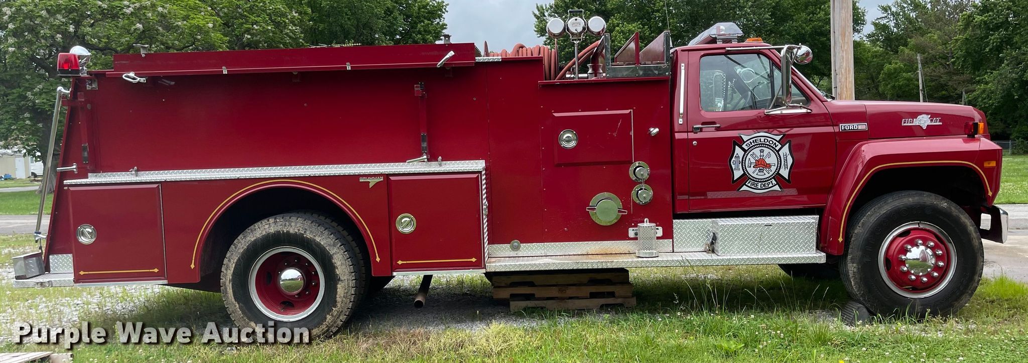 1982 Ford F800 pumper fire truck. Miles: 17,753 on odometer, VIN: 1FDXF82K4CVA44757. Engine Displacement: 7.0L V8, Cylinders: 8, Fuel type: Gas. Transmission Manual, Speed: 5. Chassis Axles: Single, Suspension: Spring, Brakes: Air. Interior Heat. Features Fire truck body Pump 1,000 gpm, Hose. Tires Size: 10.00R20. Notes Broken driveshaft, Non-operational unit. Missouri title. Sheldon Fire Department. Sheldon, MO 64784