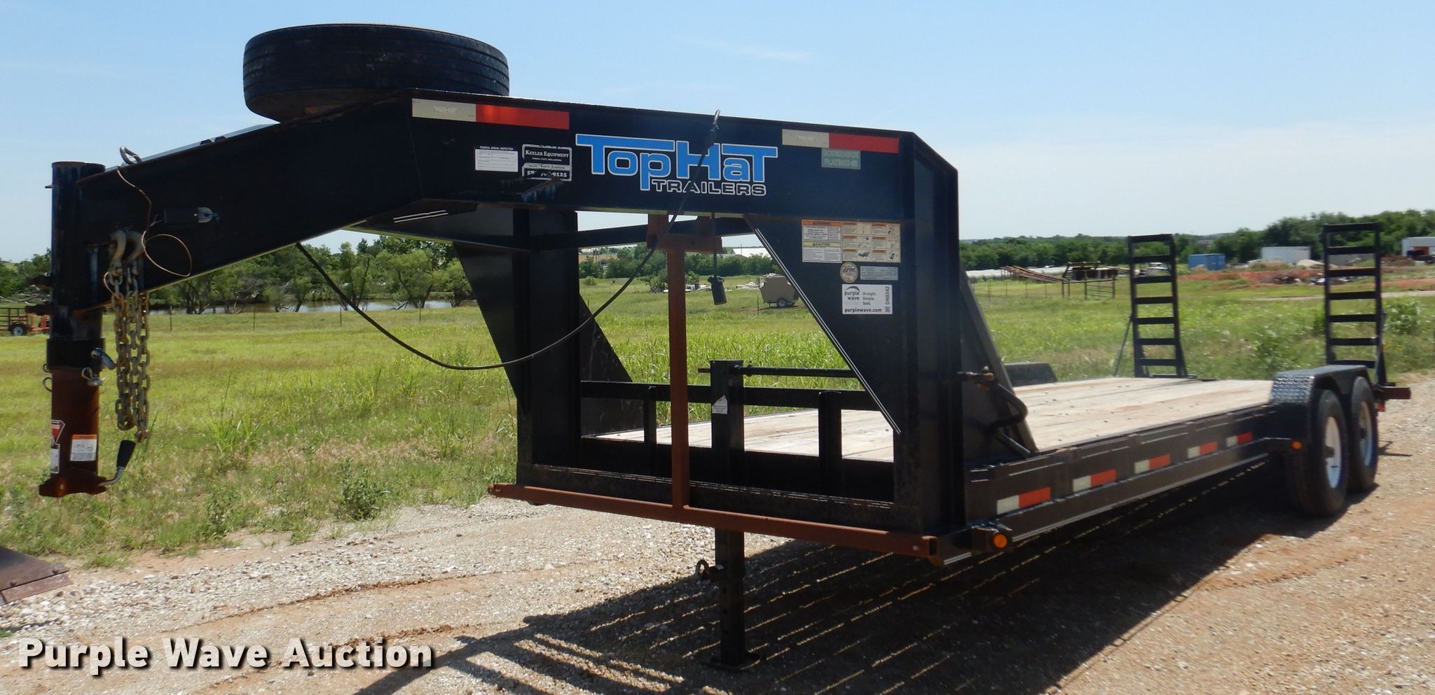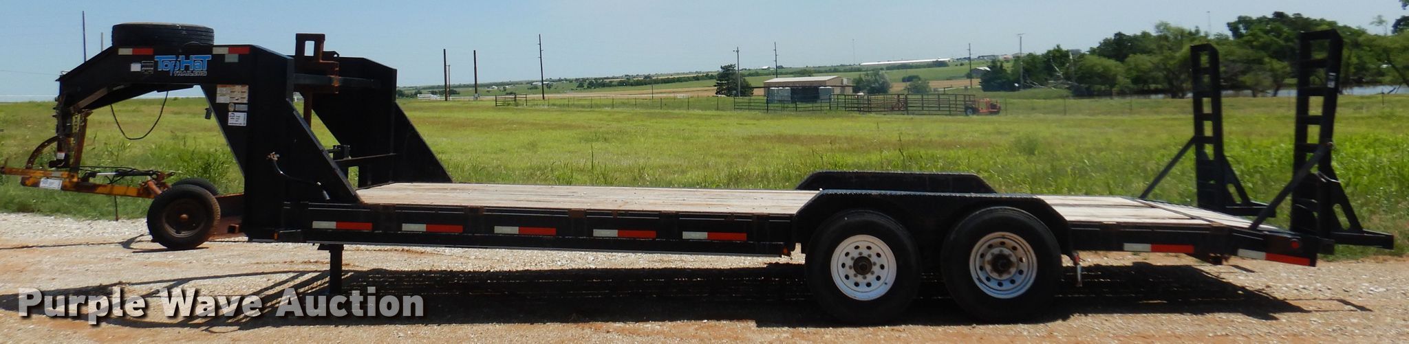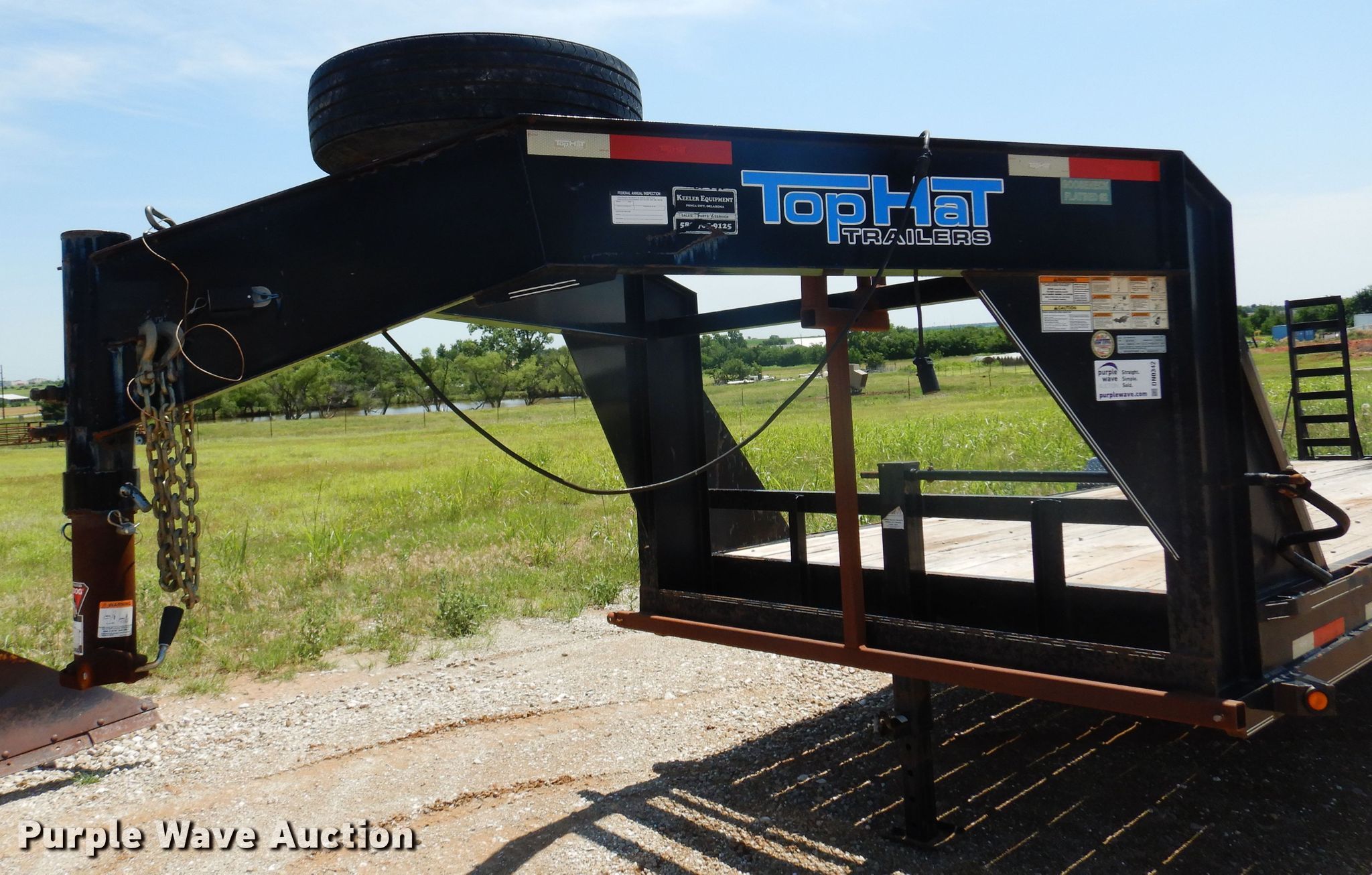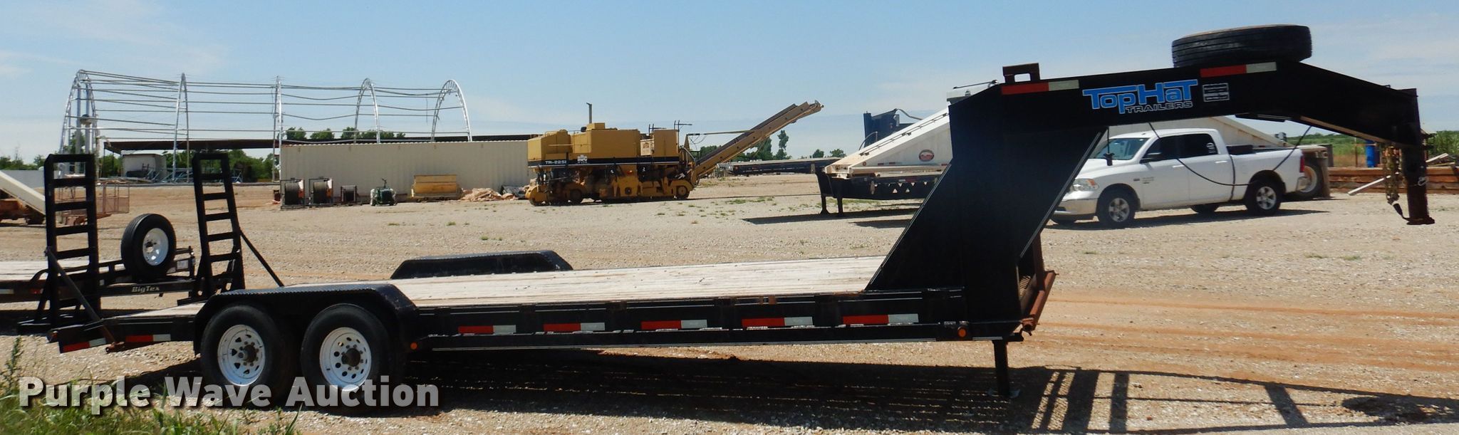 2013 Top Hat equipment trailer. VIN: 4R7GU2427DT126728. Dimensions Overall: 30' L x 87" W, Deck: 22' L x 83" W, Tail length: 2', Ramps: Manual Length: 4' 10". Features Deck type: Wood. Chassis Hitch: Gooseneck, Landing gear: Single, Suspension: Spring, Brakes: Electric, Axles: Tandem. Tires Steel wheels, Size: 235/80R16. Oklahoma title. J and J Solutions. Perry, OK 73077