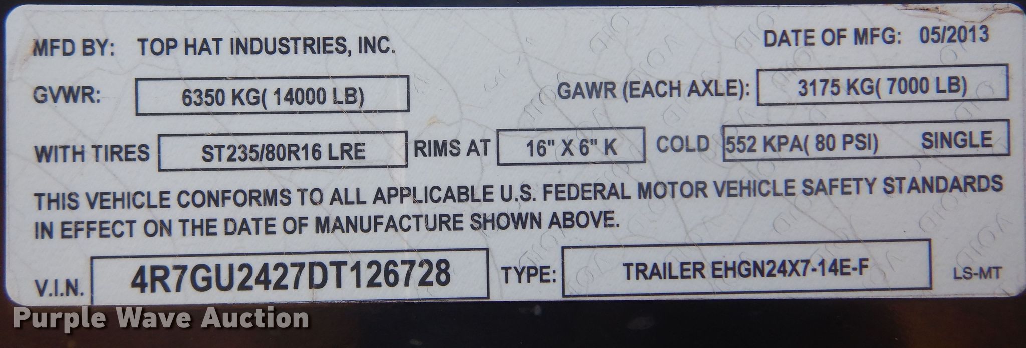 Purple Wave is selling a used Equip. Trailer in Oklahoma. This item is a 2013 Top Hat equipment trailer with the following: VIN: 4R7GU2427DT126728